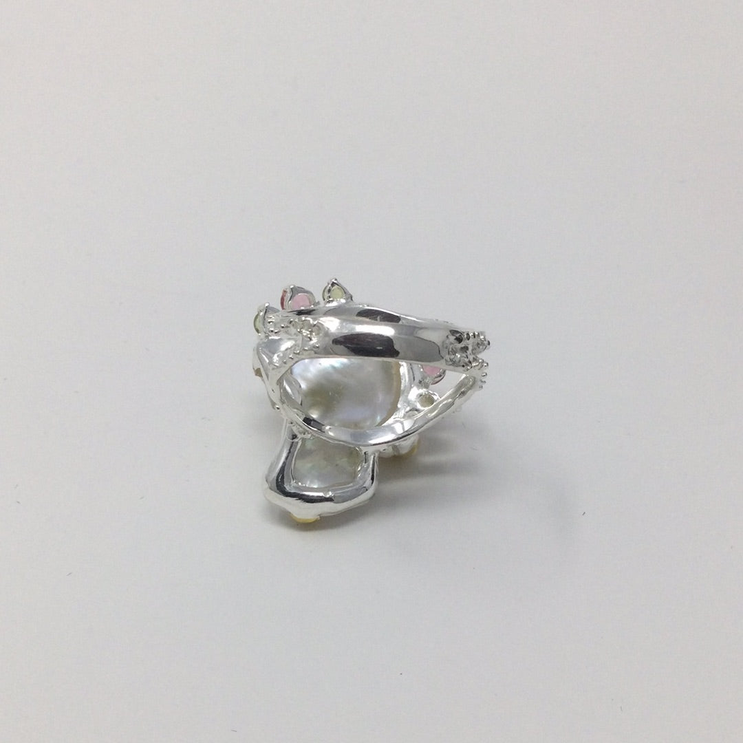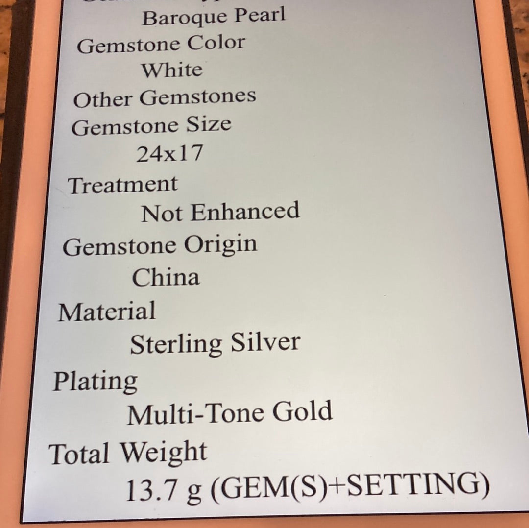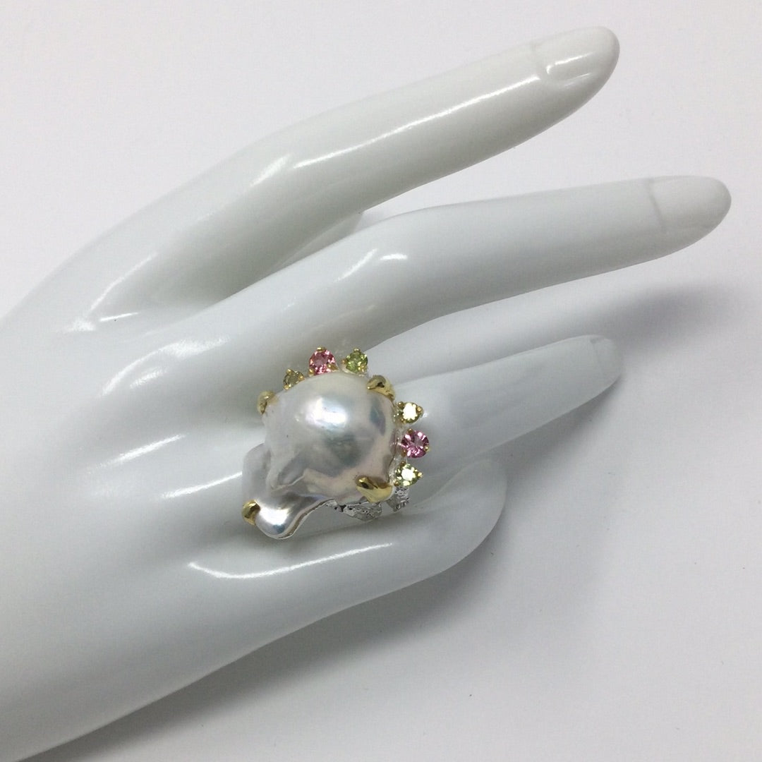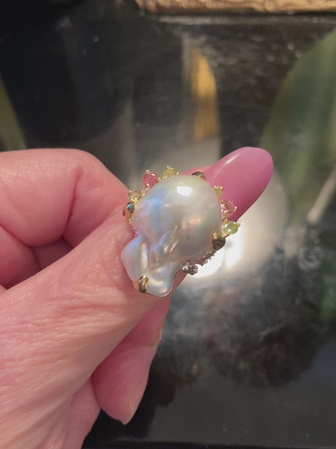 A thrilling unique treasure from the sea, a genuine 40+ CTW Baroque Pear, treasured throughout history, adorned in the crowns of royalty. Now you can make your royal entrance bedecked in this epic Baroque Pearl ring accented with Peridot & Tourmaline. Set in .925 with a white gold overlay for durability and beauty. Size 8, Resize at your jeweler.