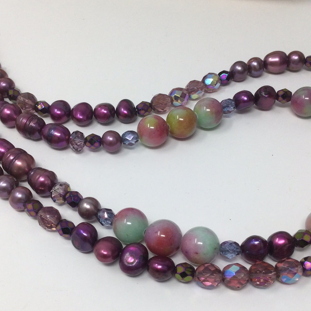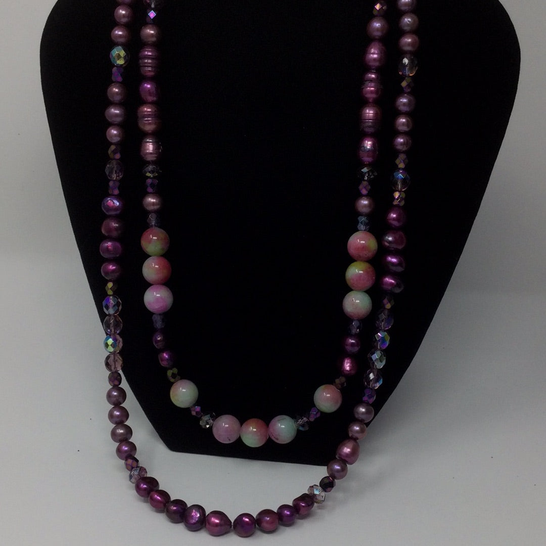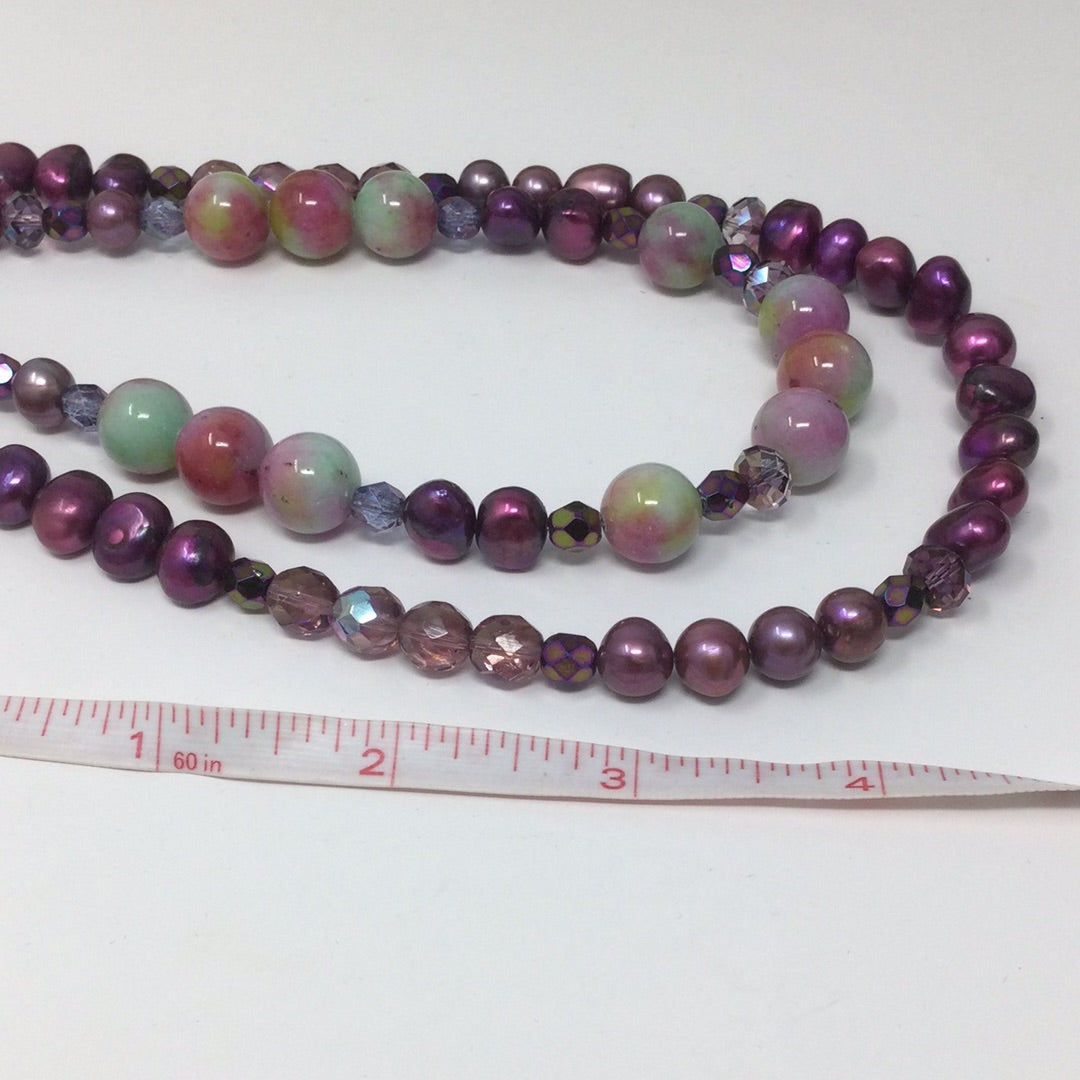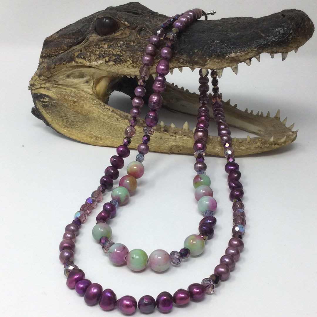 Deep magenta that calls attention to you neckline in the most classy, sensual way. Notice the prolific genuine Freshwater Pearls, unusual round Agates and Czechoslovakian Crystals. This necklace is drop dead gorgeous and so rich and saturated in unusual magentas. This is a one of a kind double strand delight , an artist original by Miss Debbie, you know I believe in colorful people. approximately 20” long.