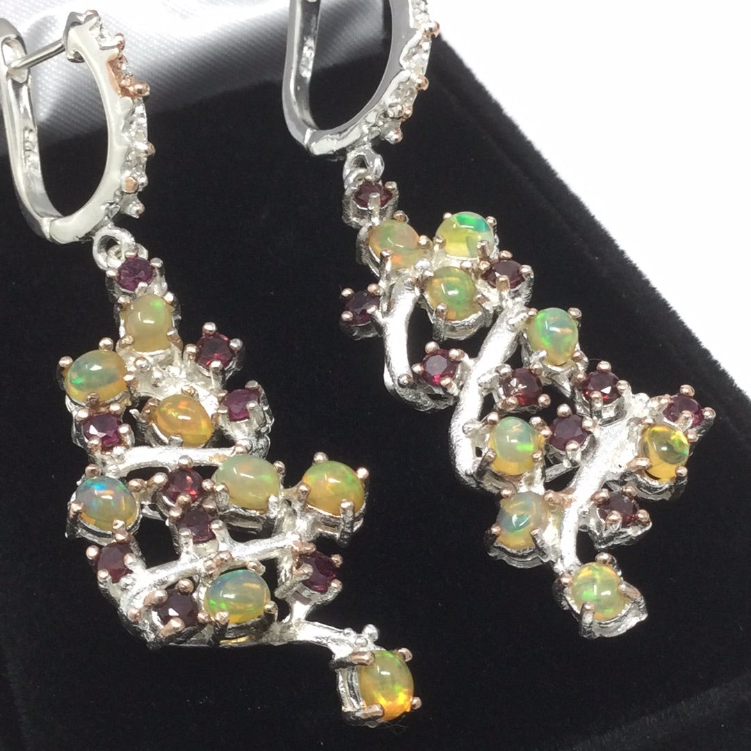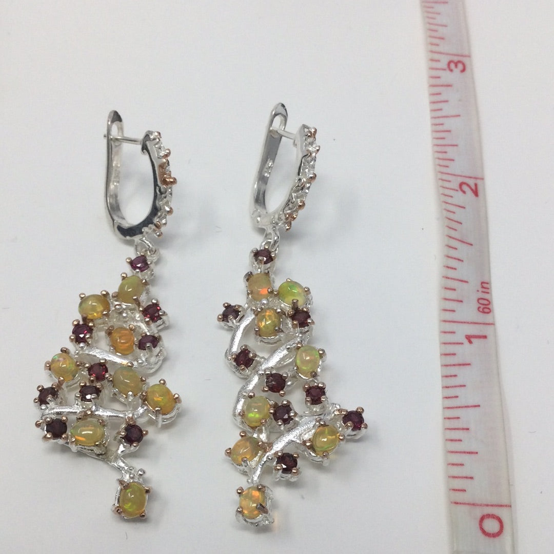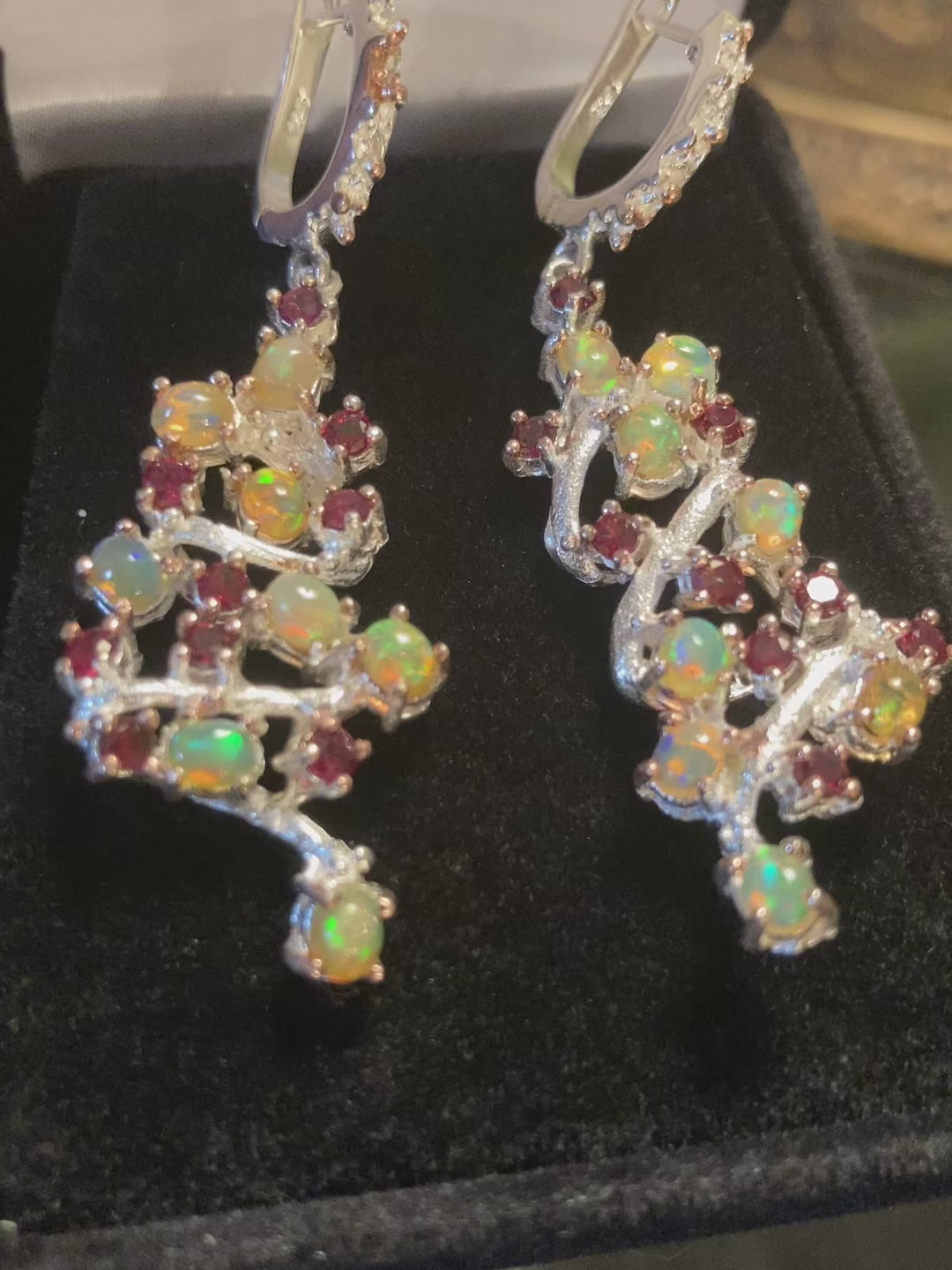 Pulsating with genuine fiery Opals and rich red Garnets, set your soul on fire with this delightful treasure. A breathtaking way to frame your face in elegance and beauty, these will bring out the sparkle in your eyes. Composed of fine hand selected gemstones like a symphony to wear, a future family heirloom to treasure for many generations to come. Set in .925 sterling silver with a white gold overlay for durability and beauty accented with rose gold too. Approximately 2” Long