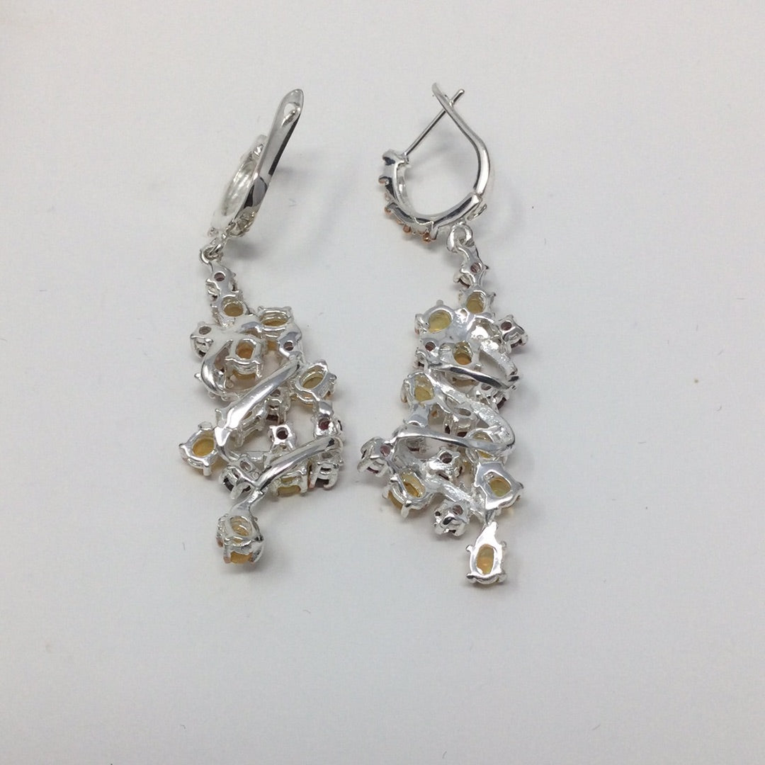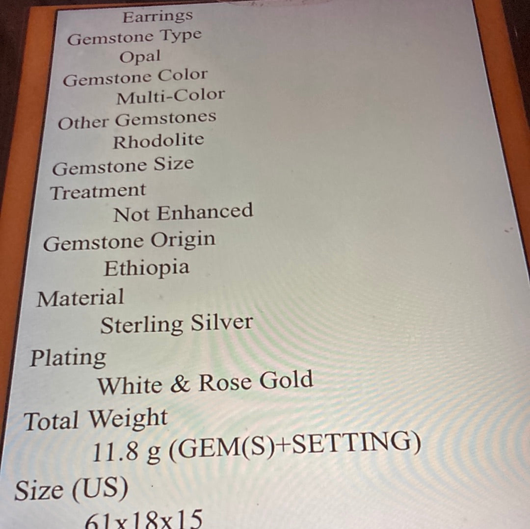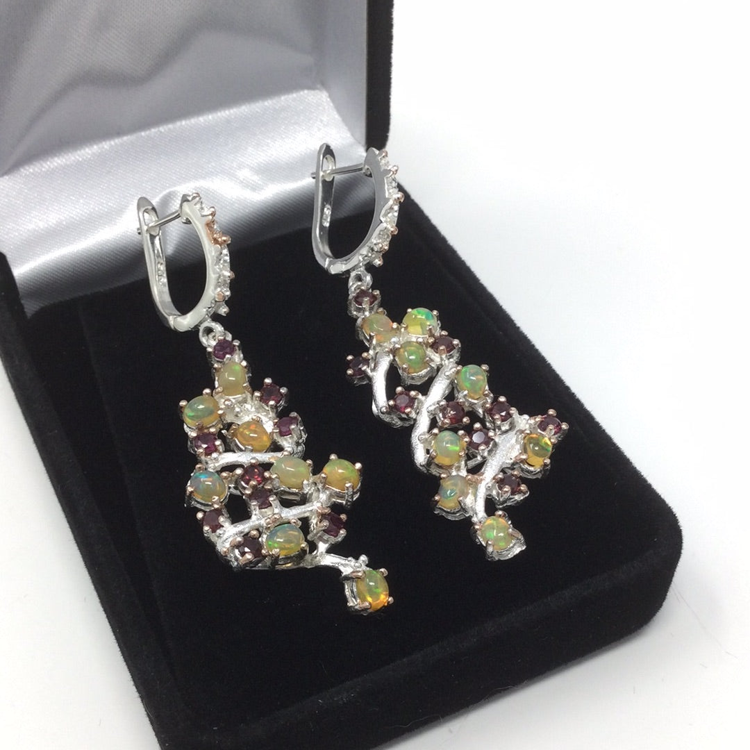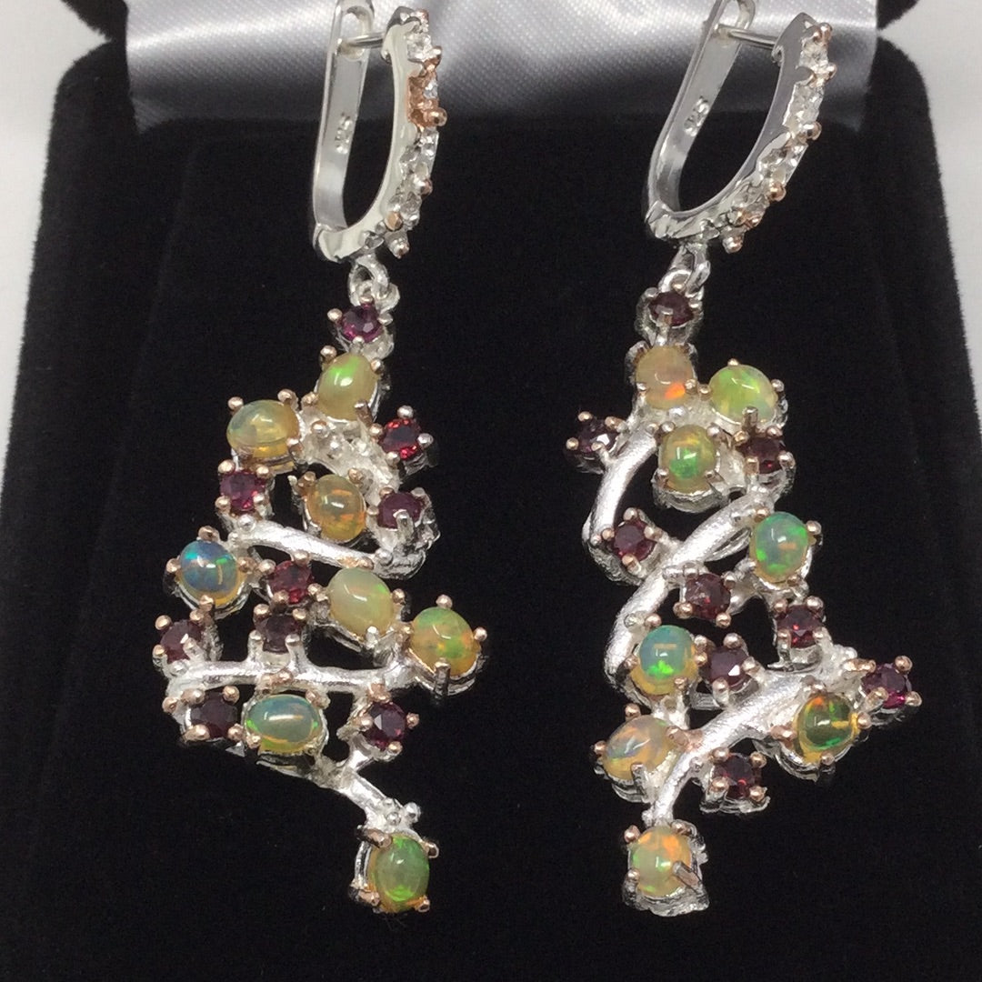 Pulsating with genuine fiery Opals and rich red Garnets, set your soul on fire with this delightful treasure. A breathtaking way to frame your face in elegance and beauty, these will bring out the sparkle in your eyes. Composed of fine hand selected gemstones like a symphony to wear, a future family heirloom to treasure for many generations to come. Set in .925 sterling silver with a white gold overlay for durability and beauty accented with rose gold too. Approximately 2” Long
