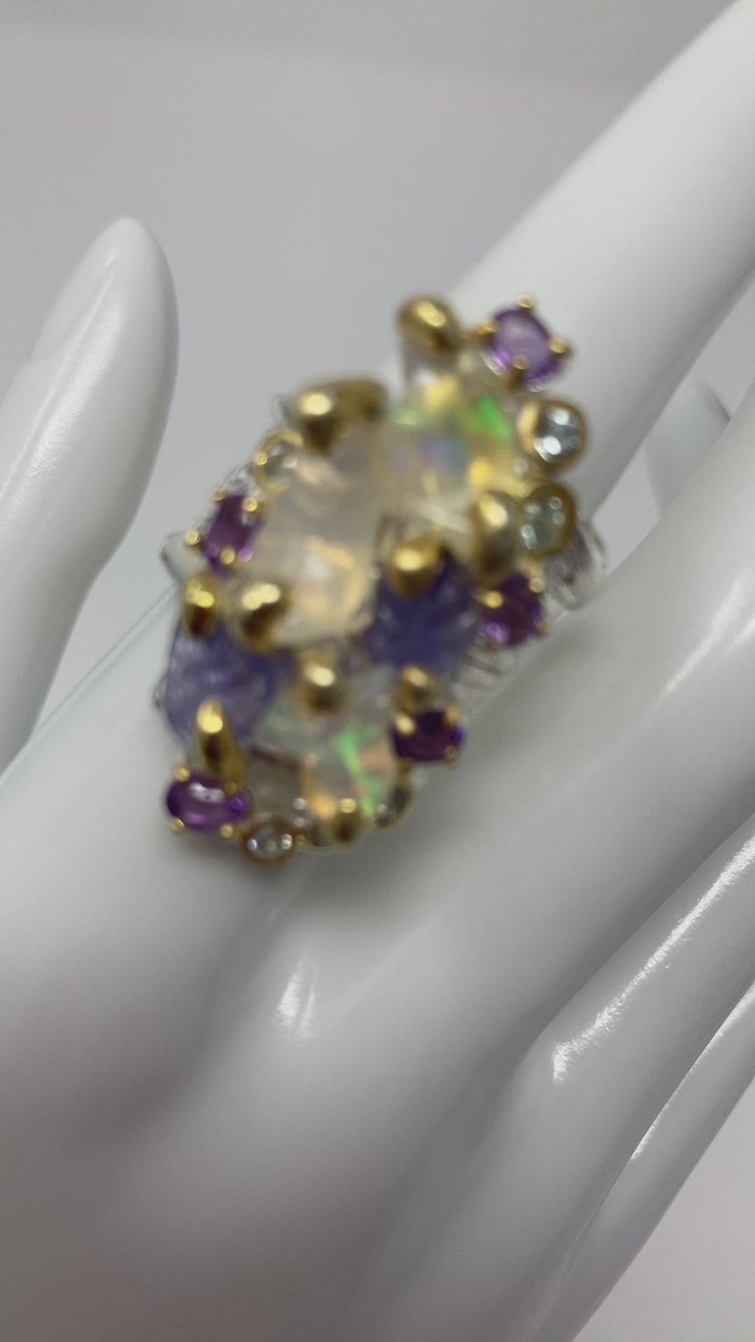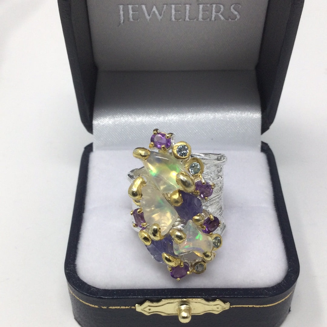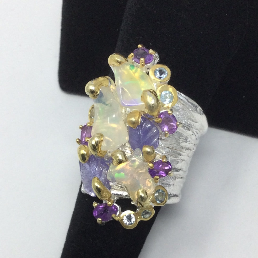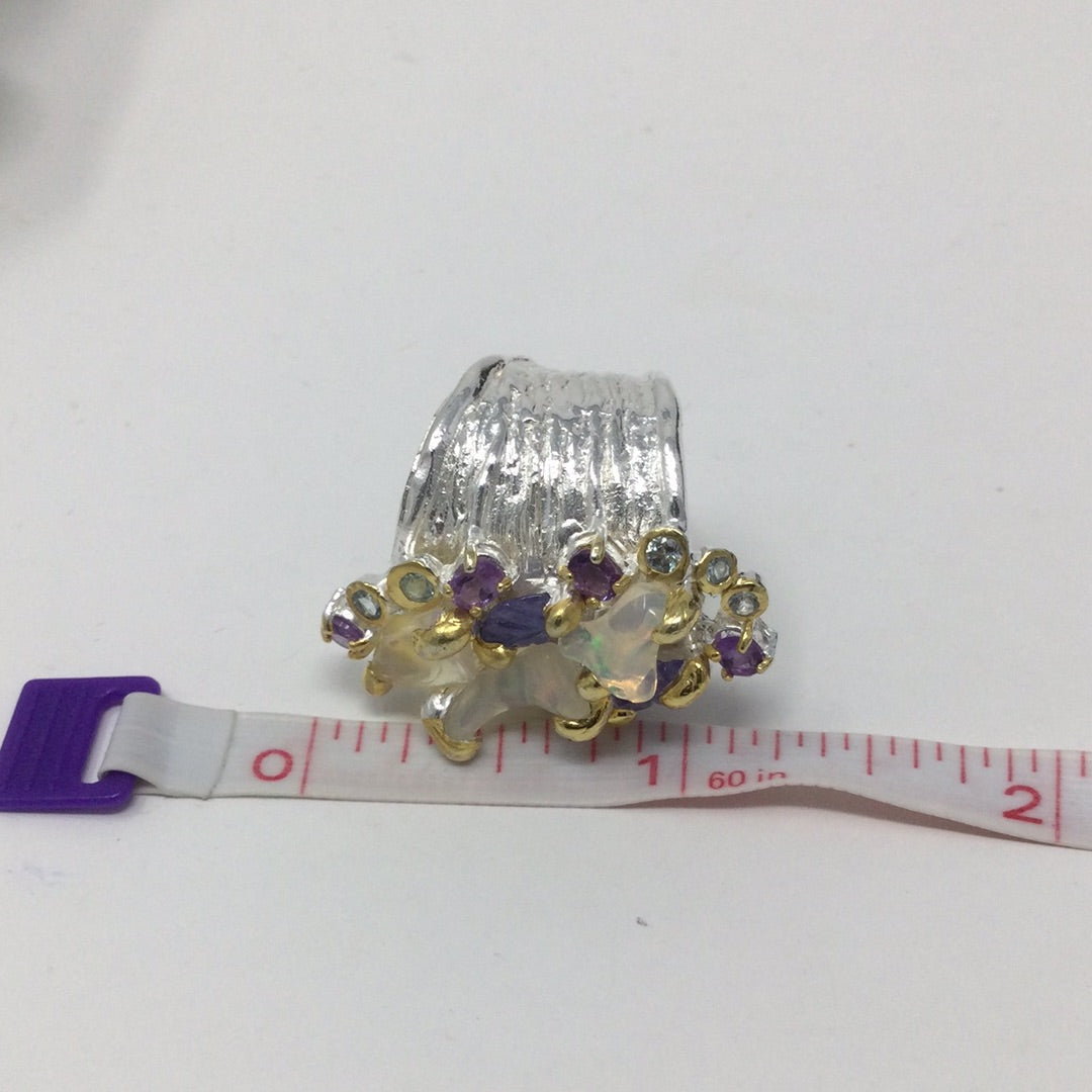 Unbelievable, seemingly electrical, genuine, natural freeform Opals! This is just exceptional and is a one of a kind masterpiece from our curated artisans. All genuine gemstones including Tanzanite carved leaves, faceted Amethysts and Topaz all hand selected gemstones, then crafted into this custom design. It’s just breathtaking, so unique, I just love it! Nice wide .925 sterling silver band with a 14K white and yellow gold overlay. You can be sure you won’t see anyone else wearing this work of art but you. Size 7
