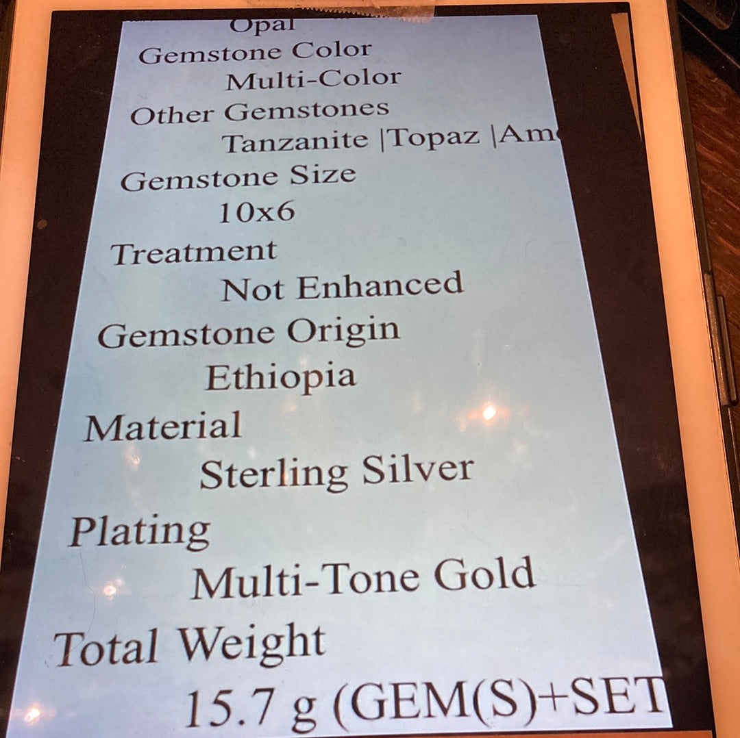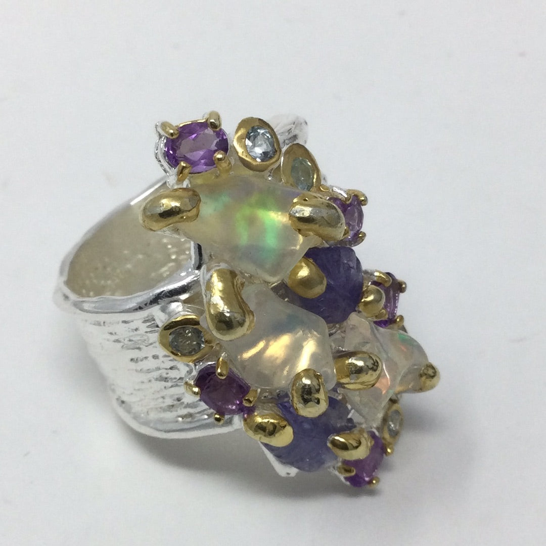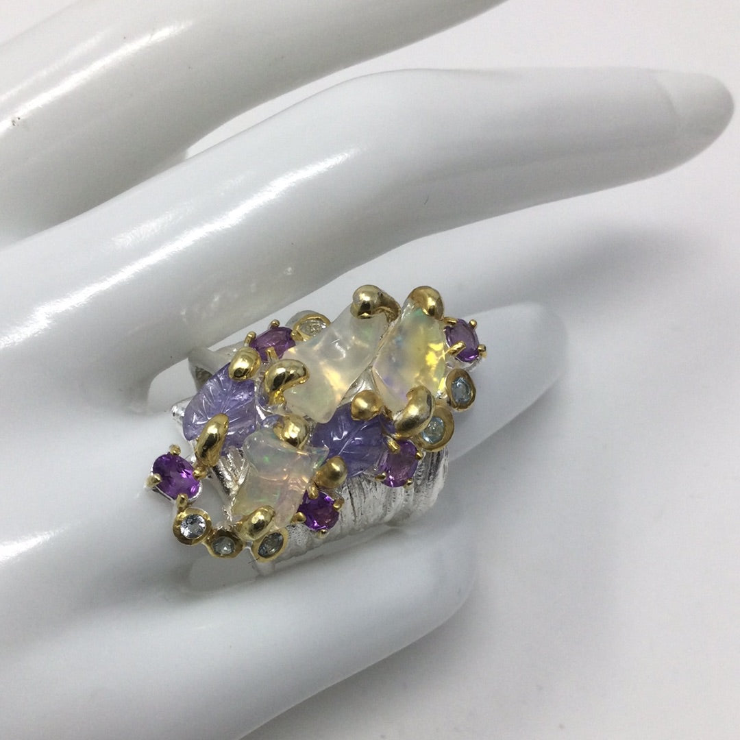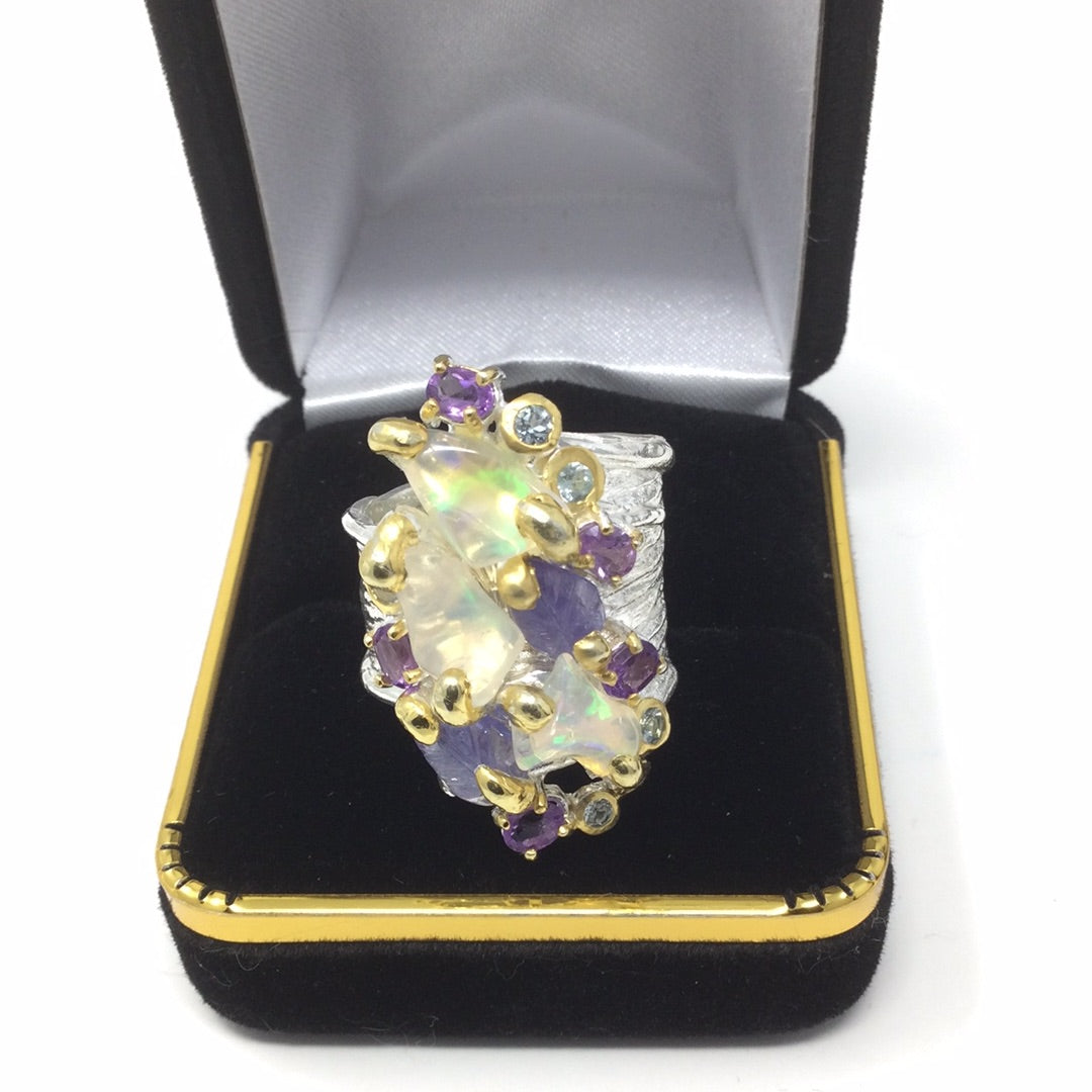Unbelievable, seemingly electrical, genuine, natural freeform Opals! This is just exceptional and is a one of a kind masterpiece from our curated artisans. All genuine gemstones including Tanzanite carved leaves, faceted Amethysts and Topaz all hand selected gemstones, then crafted into this custom design. It’s just breathtaking, so unique, I just love it! Nice wide .925 sterling silver band with a 14K white and yellow gold overlay. You can be sure you won’t see anyone else wearing this work of art but you. Size 7