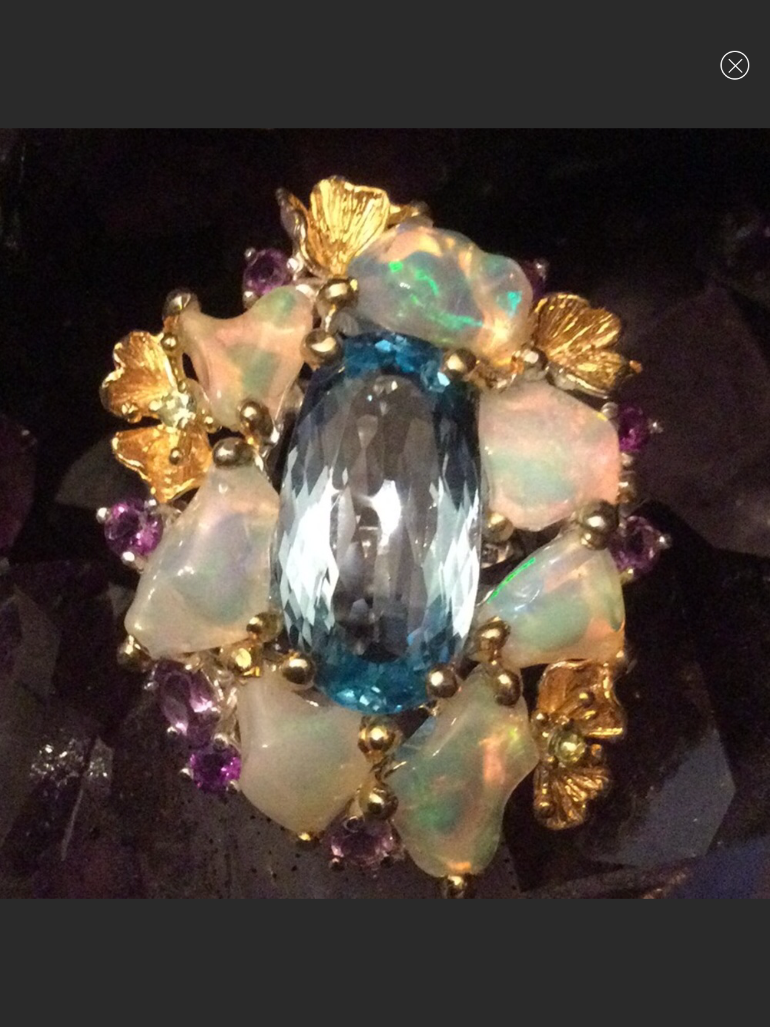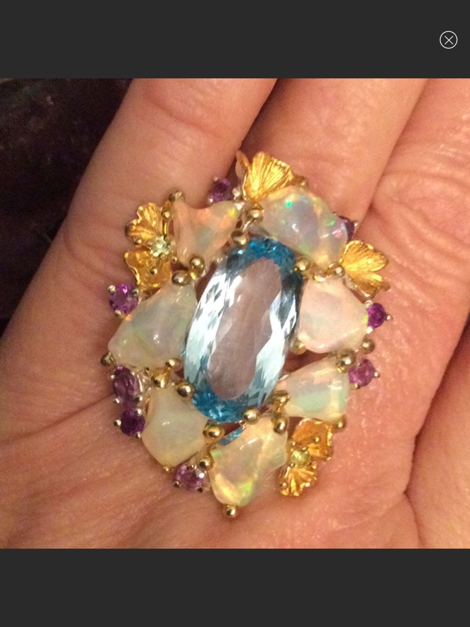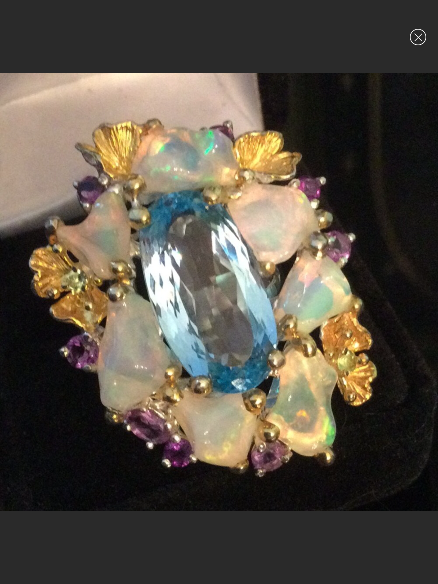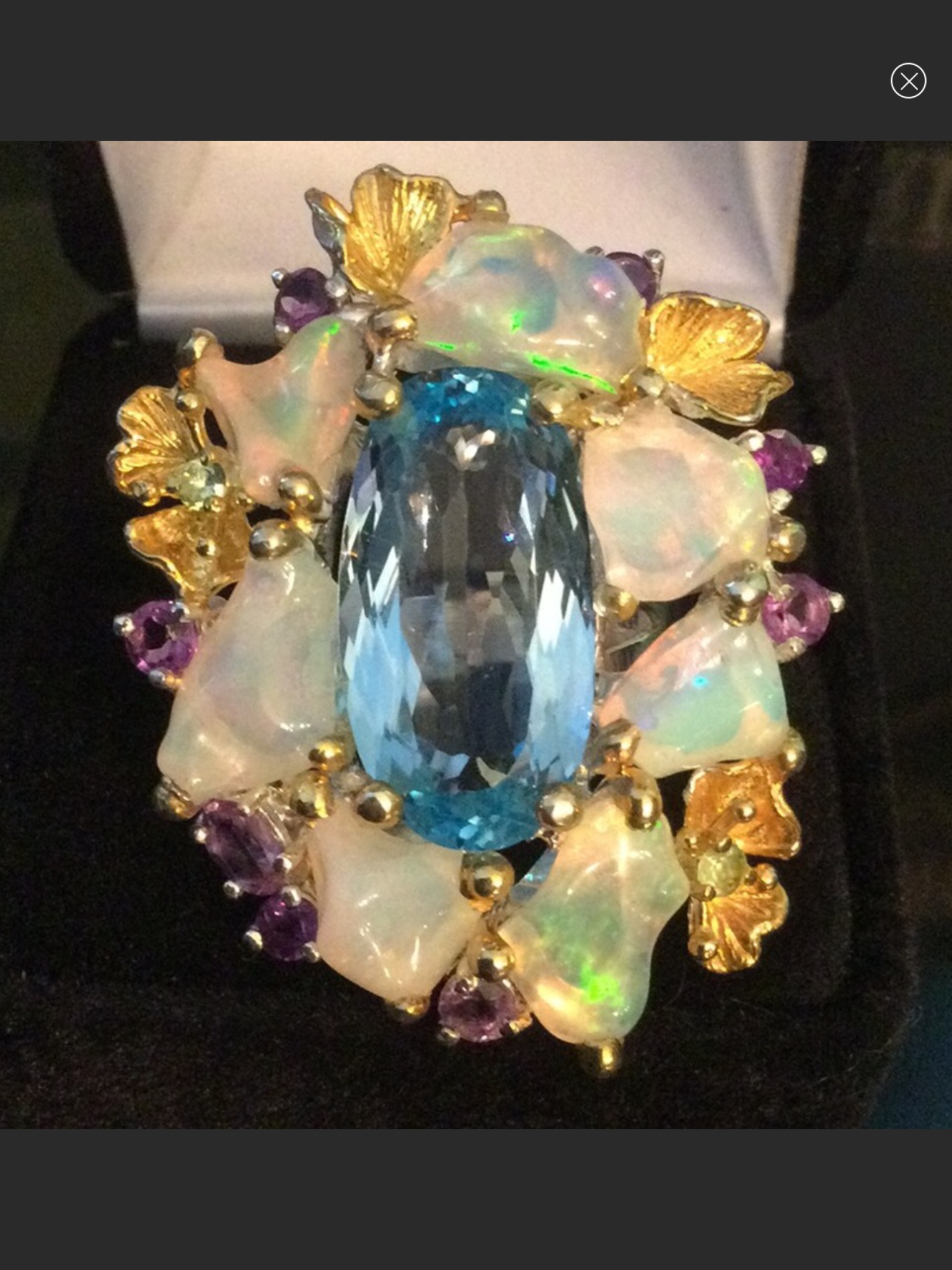 Absolutely exquisite it takes your breath away with its magnificence, a genuine 25+ CTW Blue Topaz embraces with all genuine fiery Opals, a treasure worthy of King Solomon’s mines. A one of a kind, custom made masterpiece, a one in a lifetime opportunity to own this spectacular, mega gemstone ring. Notic the size and quality of this iridescent natural Opals, each hand selected for quality and beauty. The setting was especially designed to fit these Opals too. Set in .925 with gold accents. Size 9, Can be resized at your jeweler.