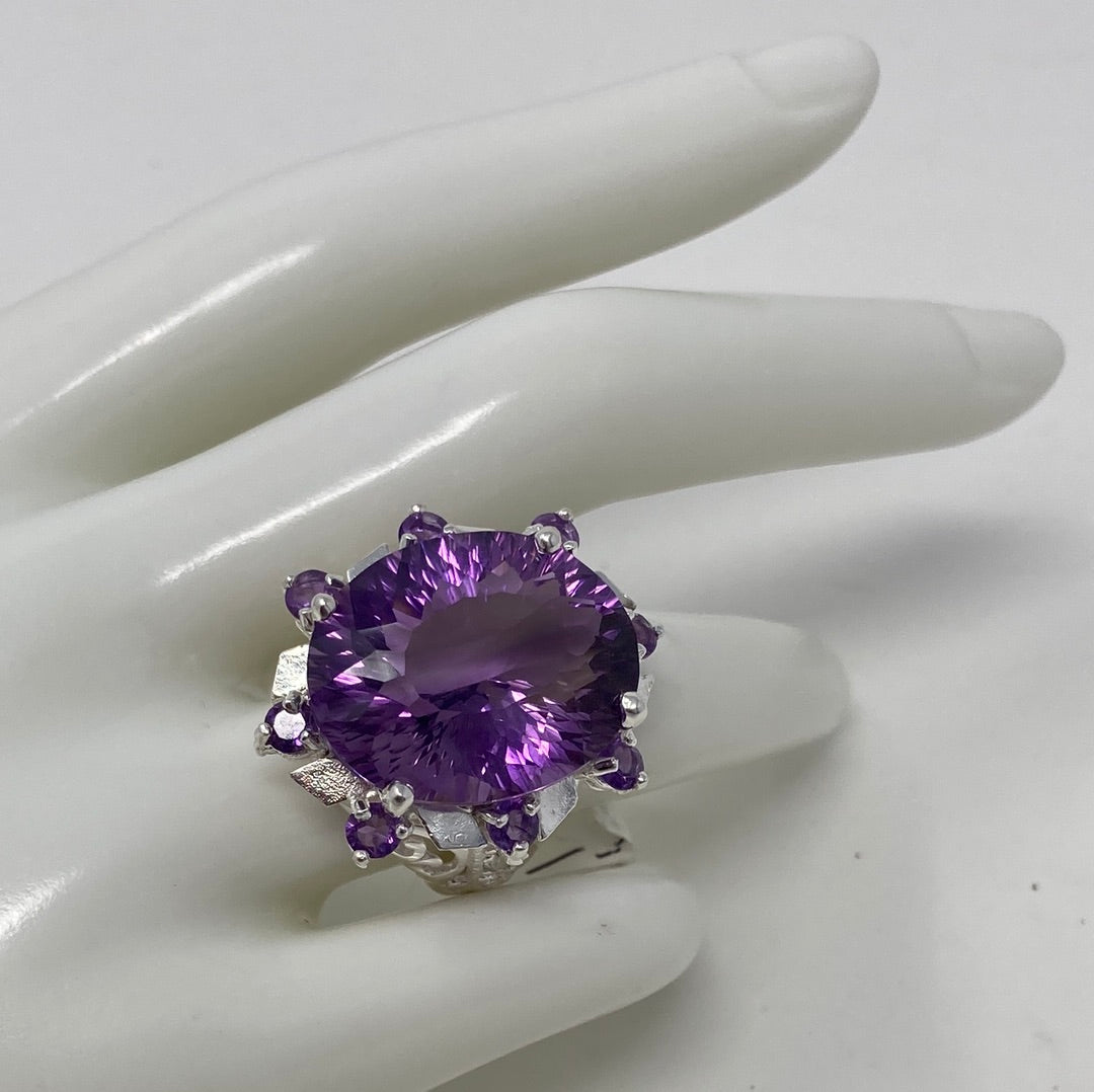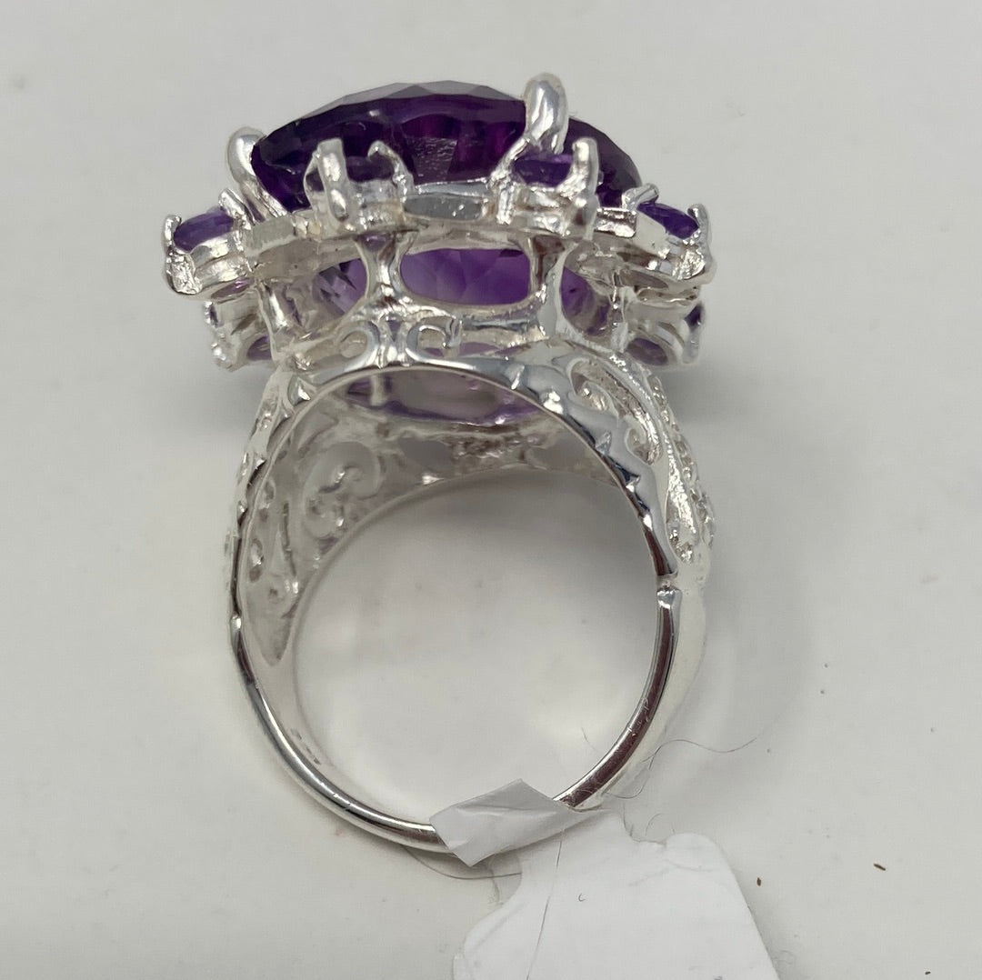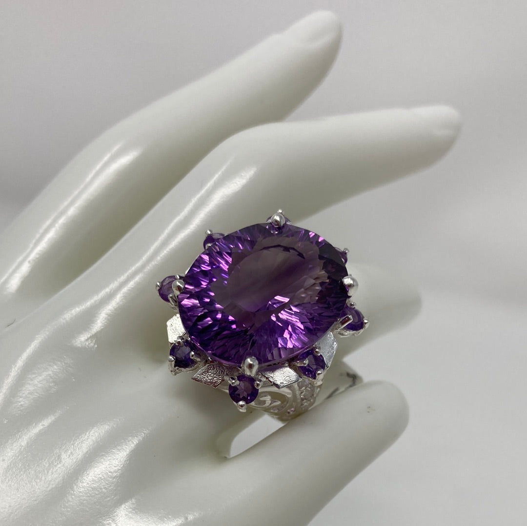 A impactful, brilliant 34 CTW genuine Amethyst , a one of a kind with a custom made setting specifically for this gemstone. It is a breathtaking ring to behold, crafted in .925 sterling silver. This artful design features faceted round Amethysts around the perimeter of the large Amethyst. The setting in intricately designed with a reticulated setting. Very majestic style. Size 7 1/2, Resize at your jeweler or use a ring guard.