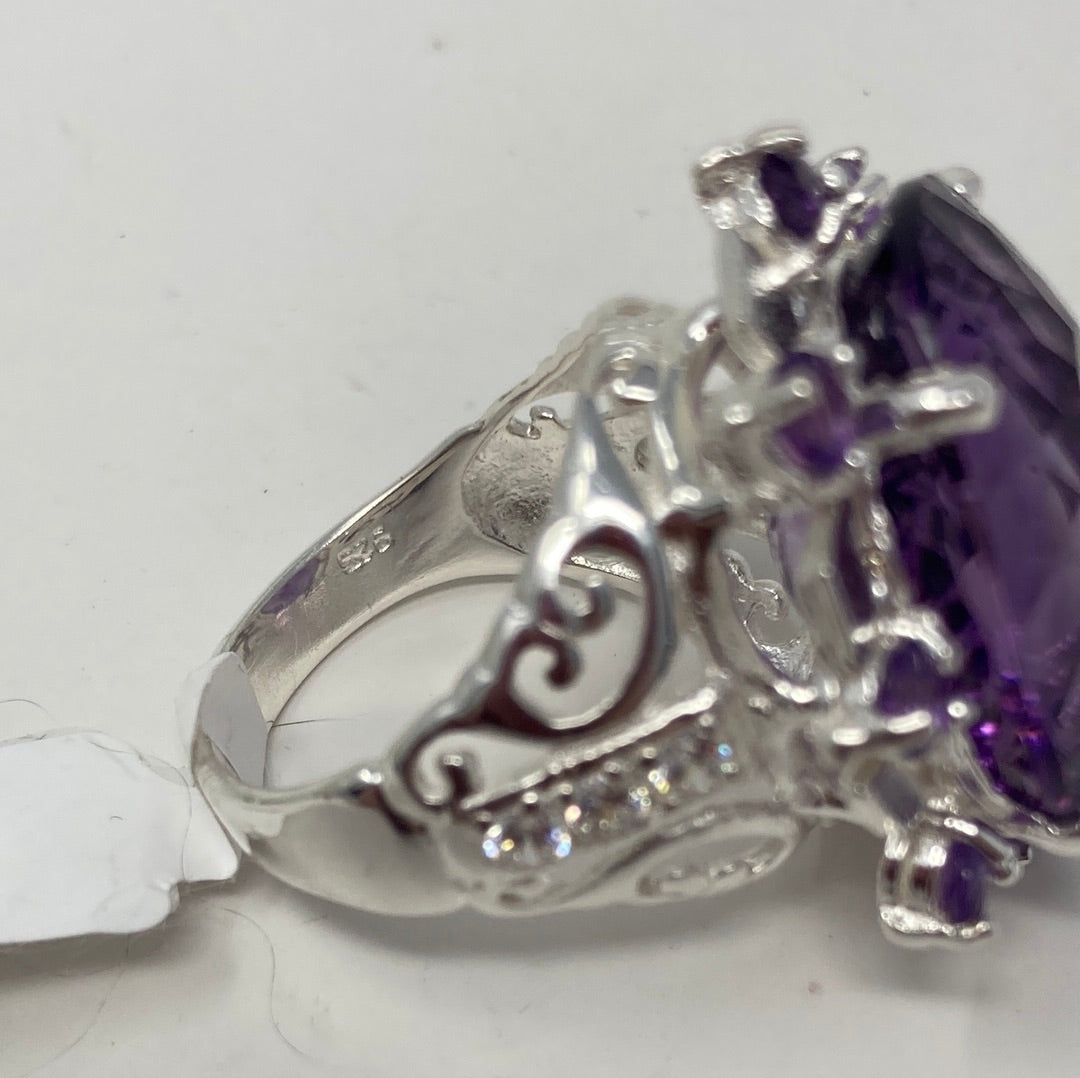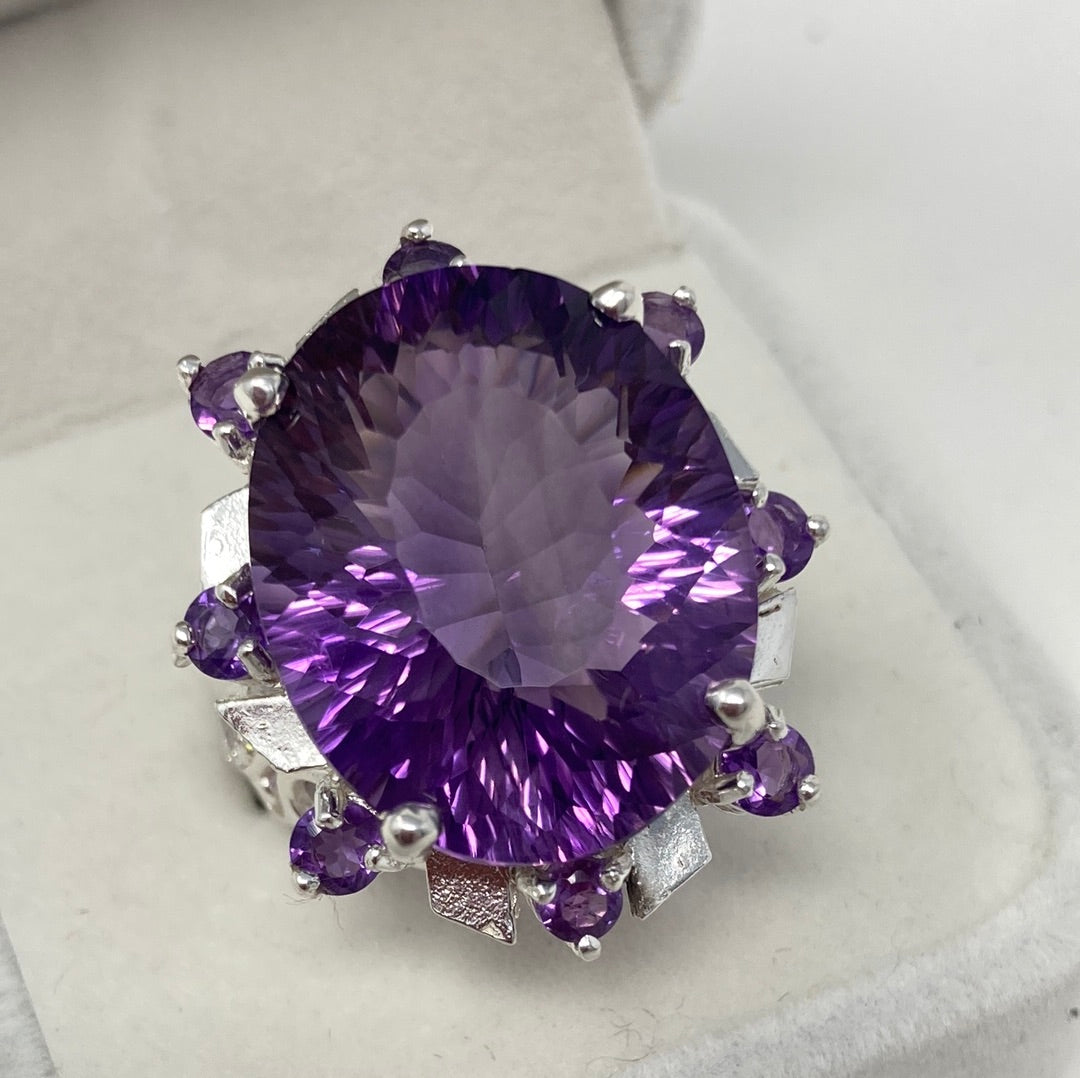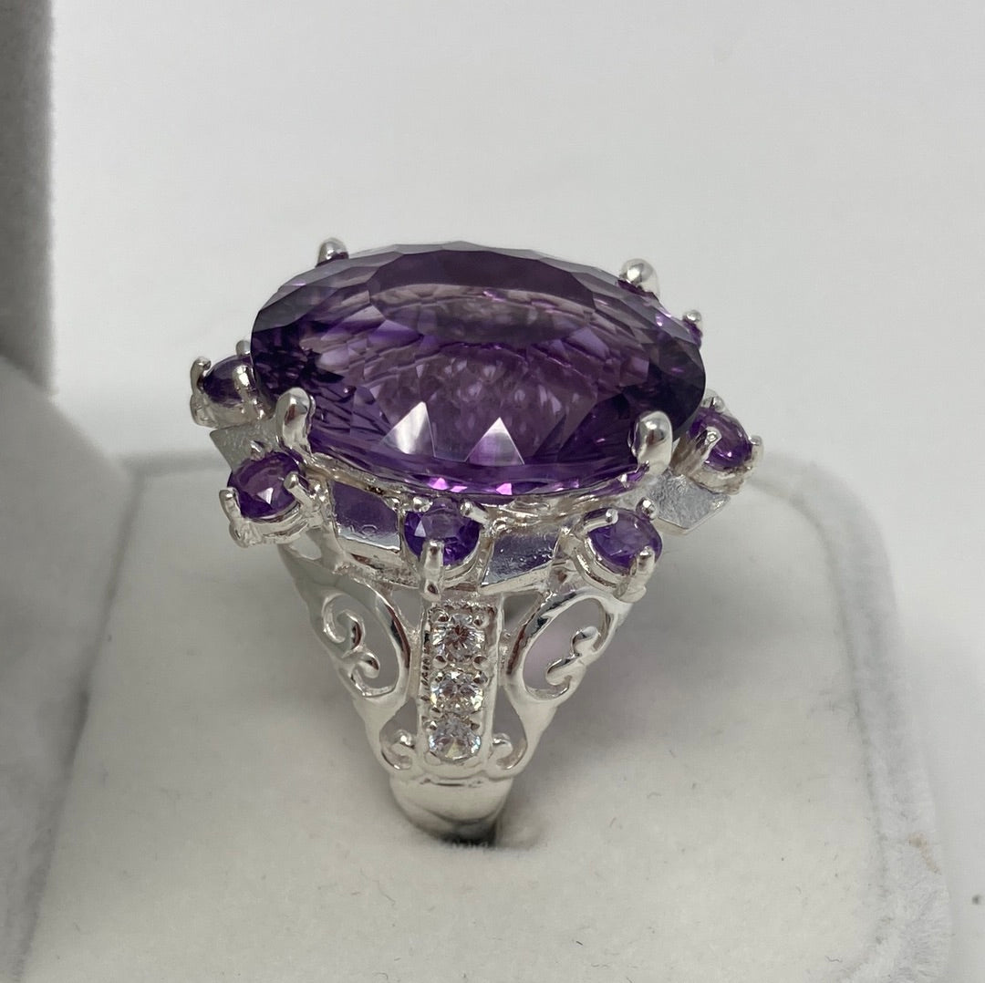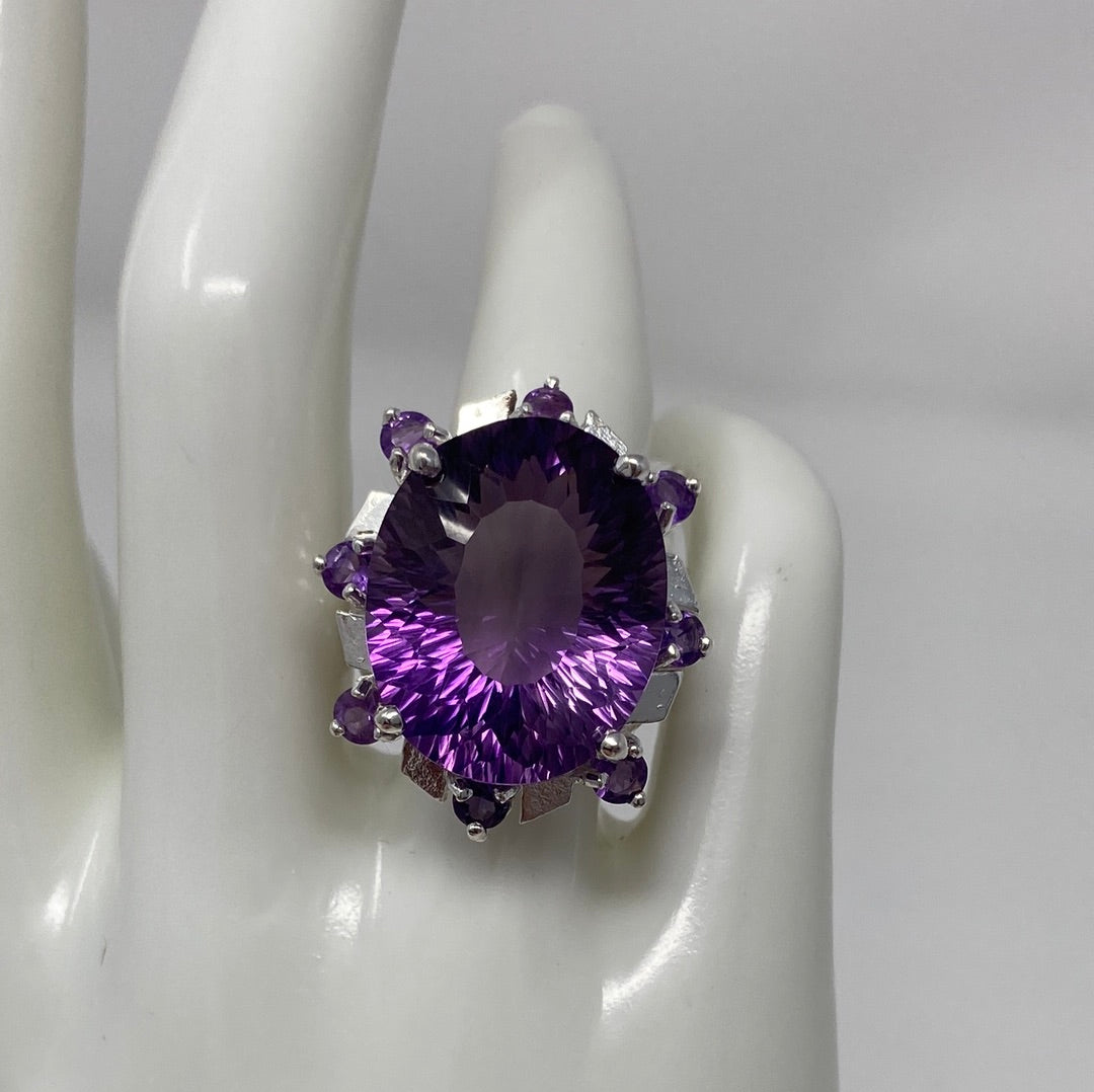 A impactful, brilliant 34 CTW genuine Amethyst , a one of a kind with a custom made setting specifically for this gemstone. It is a breathtaking ring to behold, crafted in .925 sterling silver. This artful design features faceted round Amethysts around the perimeter of the large Amethyst. The setting in intricately designed with a reticulated setting. Very majestic style. Size 7 1/2, Resize at your jeweler or use a ring guard.