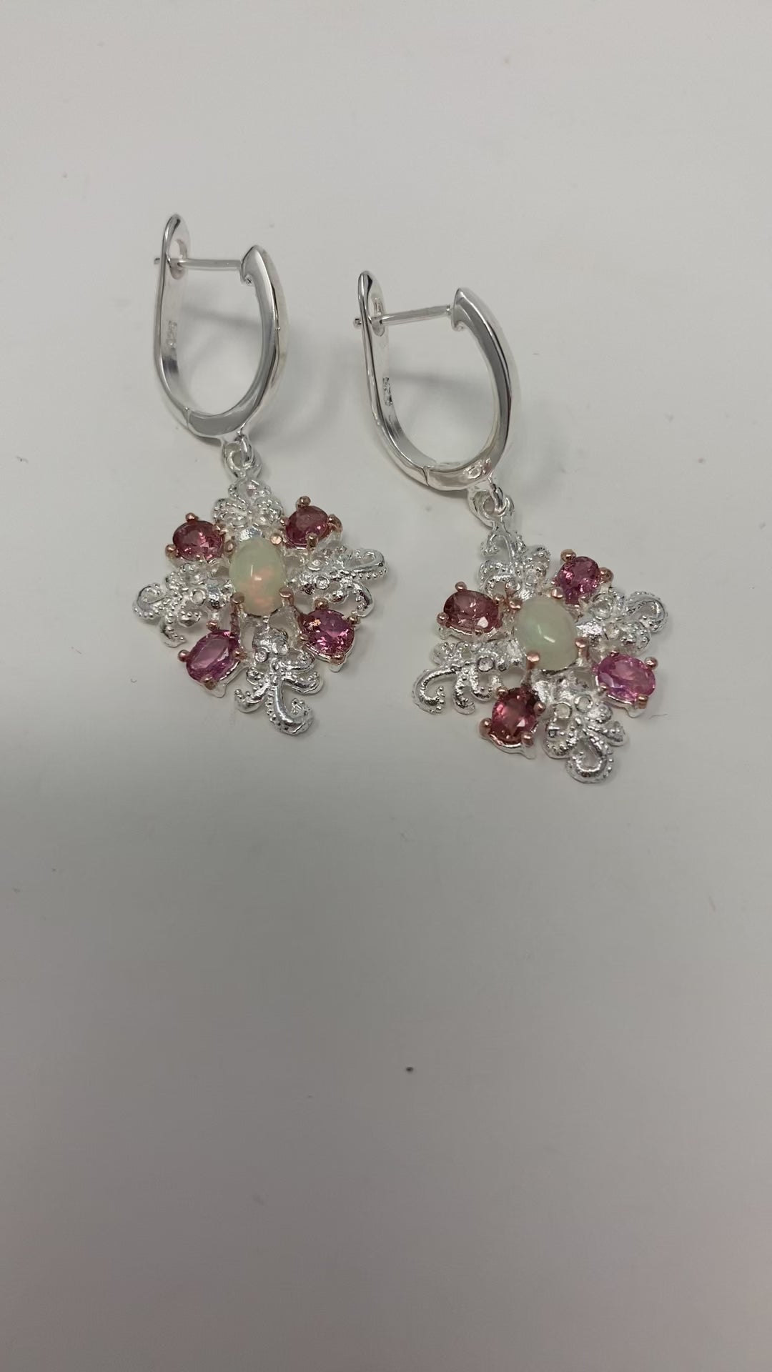 Sweet and sexy these charmingly innocent little dangles will steal your heart. Featuring genuine Opals and Pink Tourmalines, an exquisite combination of style and class. Custom crafted in .925 sterling silver with a 14K white and rose gold overlay, a future heirloom for your gemstone collection. Invest in genuine gemstone, a lasting investment in your jewelry box. Approximately 1” Long
