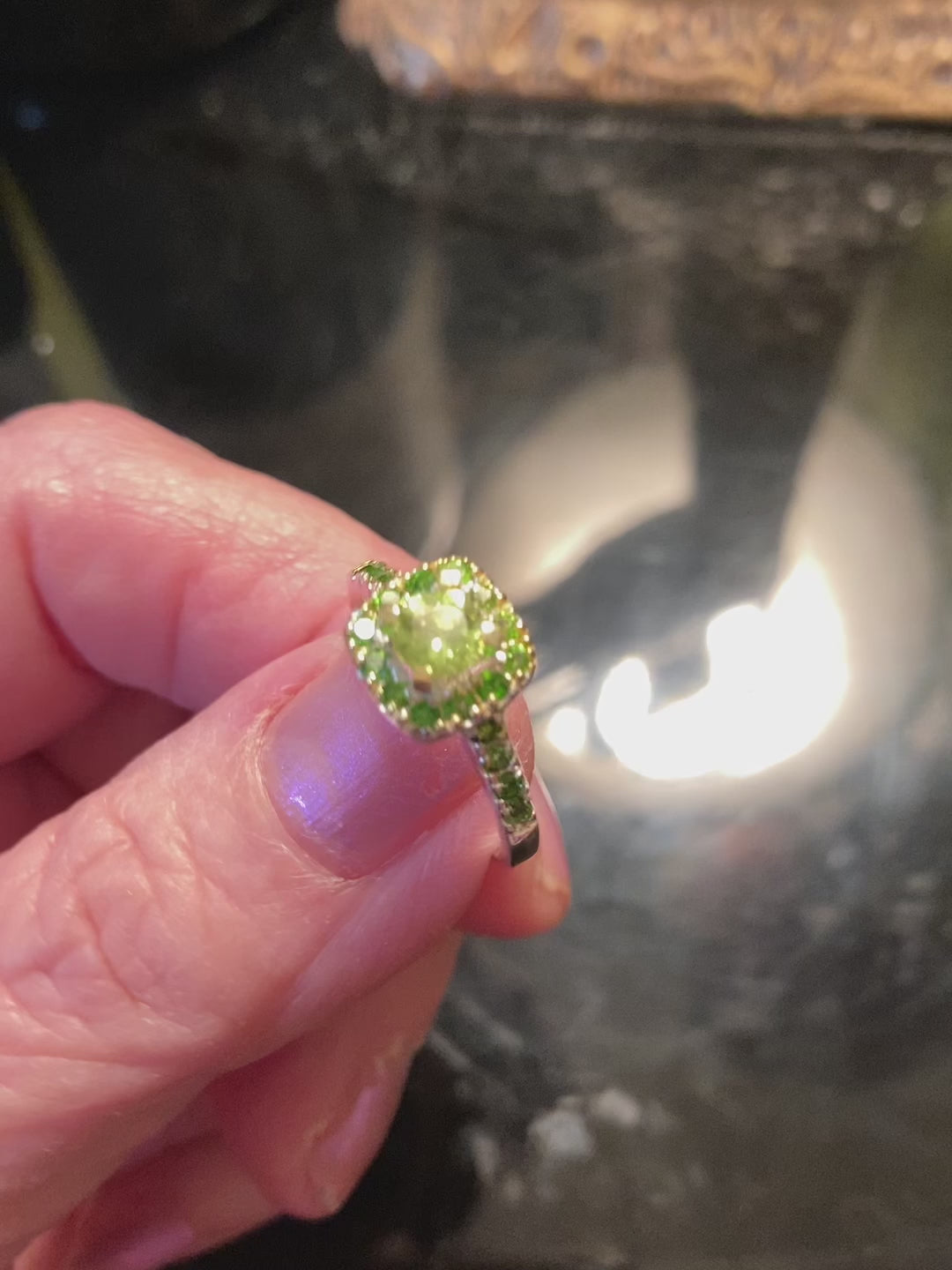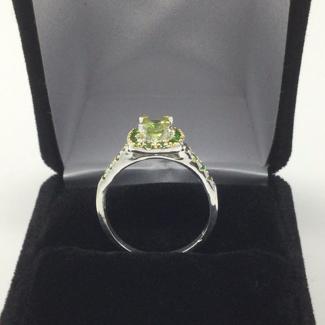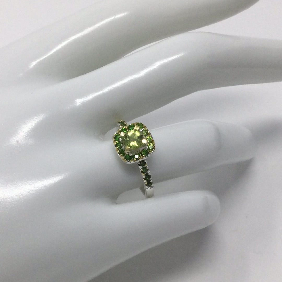 This exquisite genuine Peridot measures 5mm by 5mm, embraced by genuine Russian Chrome Diopside give this ring a very elevated, elegant look. This is a one of a kind treasure with a romantic look that brings forth a lasting peaceful sigh. Set in .925 sterling silver with a 14K white gold overlay for durability and beauty. Size 7 1/2, can be resized at your jeweler.