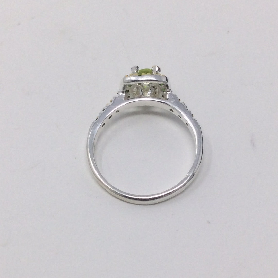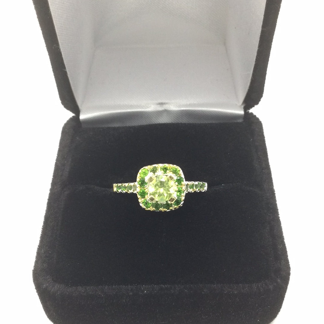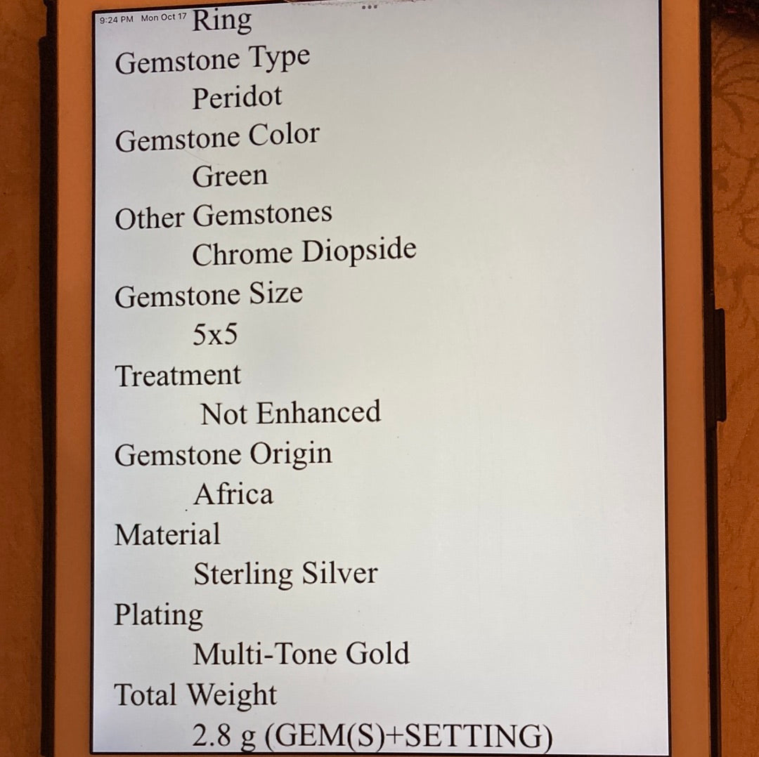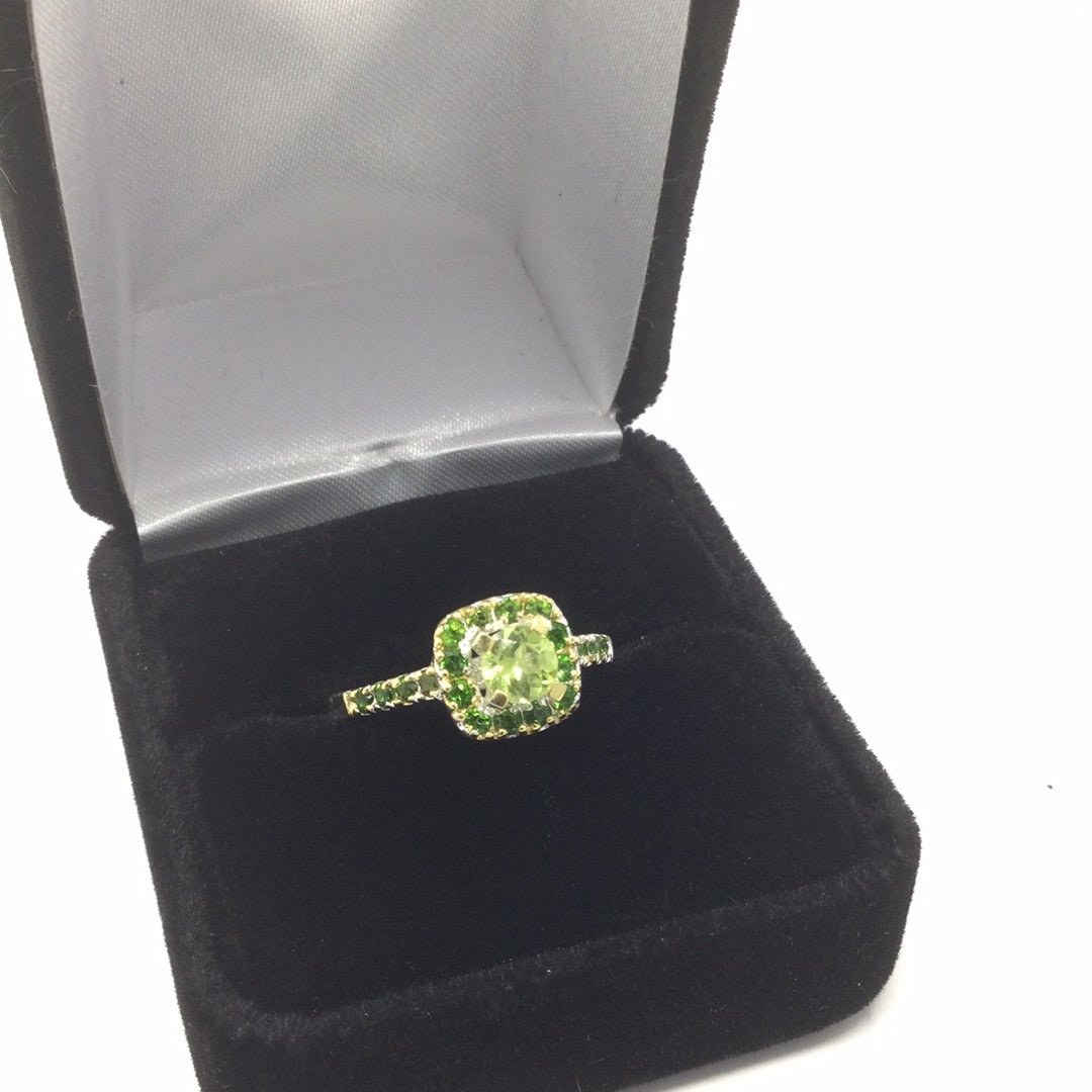 This exquisite genuine Peridot measures 5mm by 5mm, embraced by genuine Russian Chrome Diopside give this ring a very elevated, elegant look. This is a one of a kind treasure with a romantic look that brings forth a lasting peaceful sigh. Set in .925 sterling silver with a 14K white gold overlay for durability and beauty. Size 7 1/2, can be resized at your jeweler.