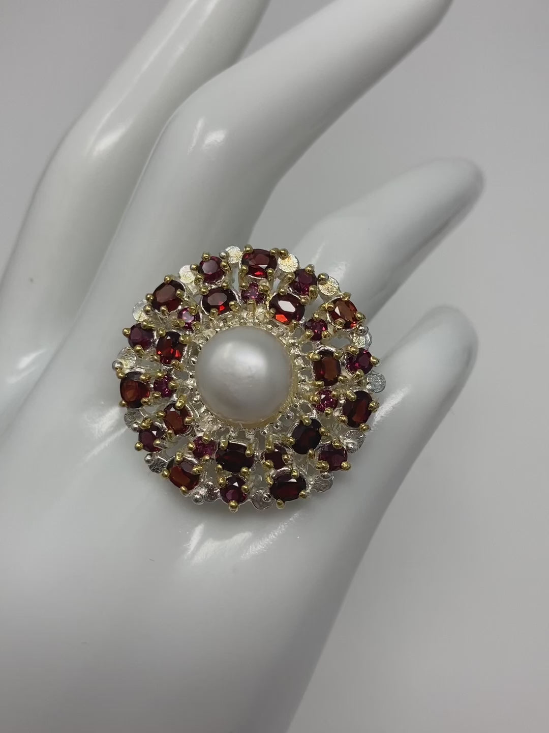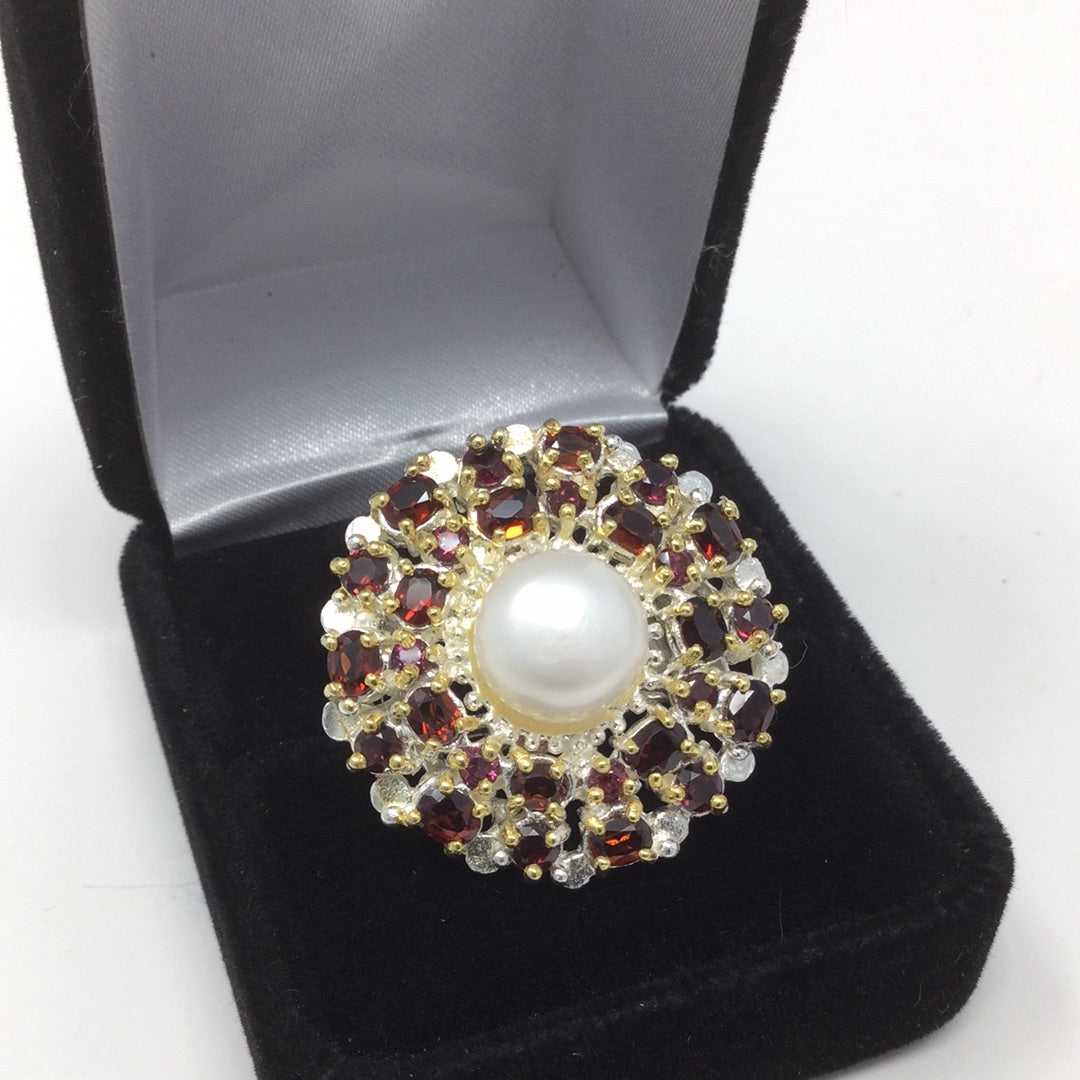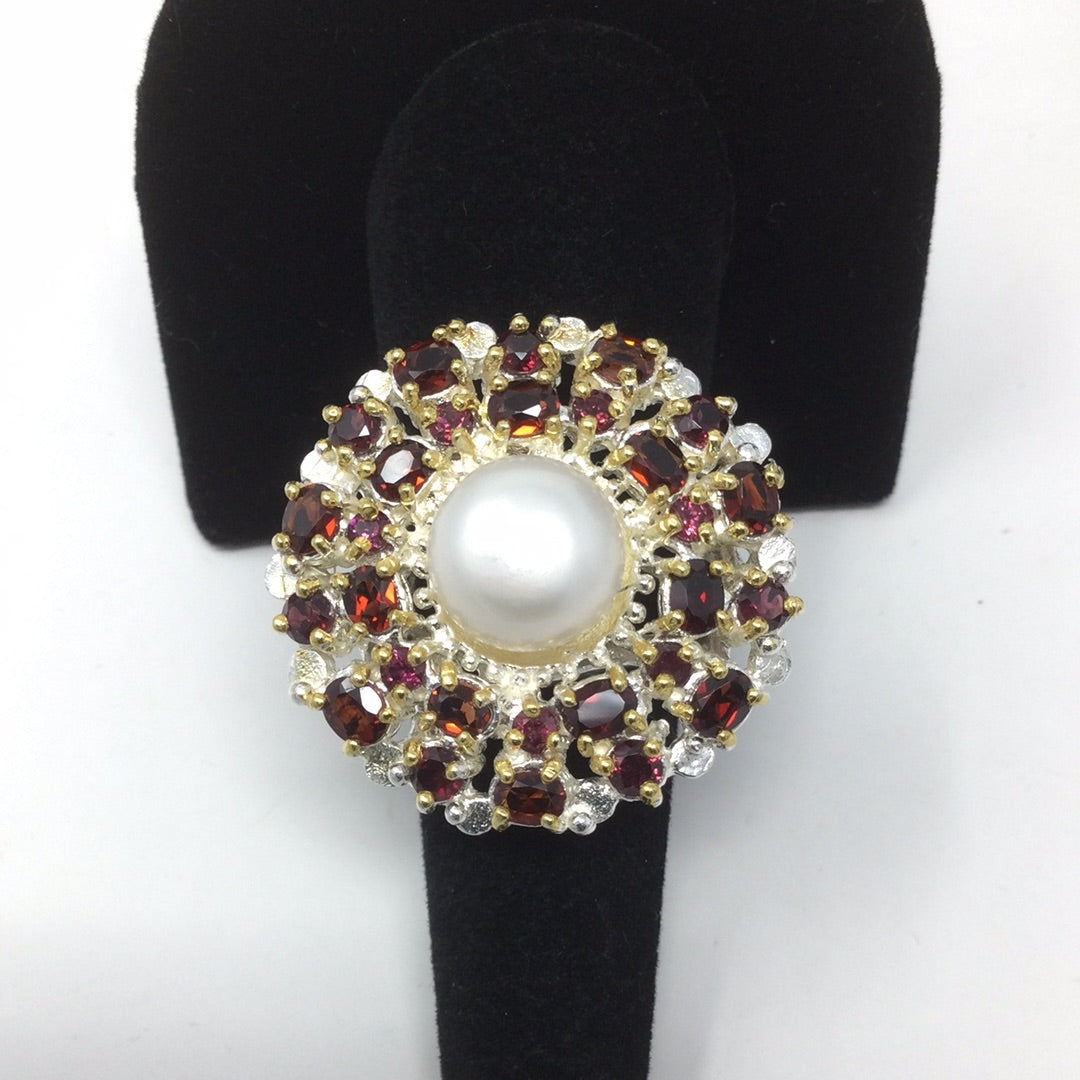 A luscious ,creamy natural 10mm pearl embraced by genuine Garnets. The faceted Garnets are Mozambique and the finest Rhodolite Garnets, hand selected for this ring. It’s a super classy elevated look that will enthrall you with its unique beauty. This one of a kind custom made ring is crafted in .925 sterling silver with a 14K white gold overlay. It’s an elegant sparkle that will become a future family heirloom. Size 6 3/4, Resize at your jeweler or use a ring guard.