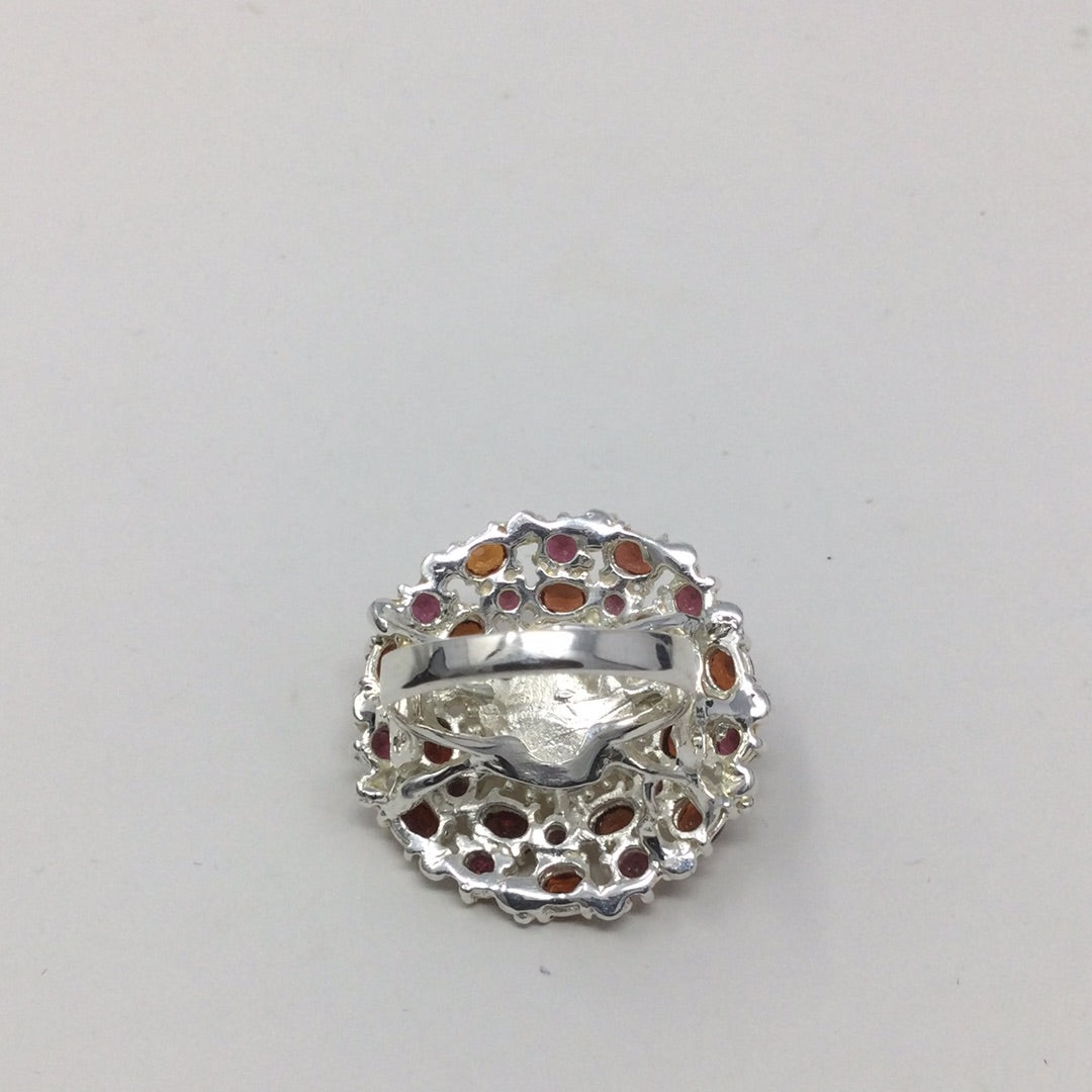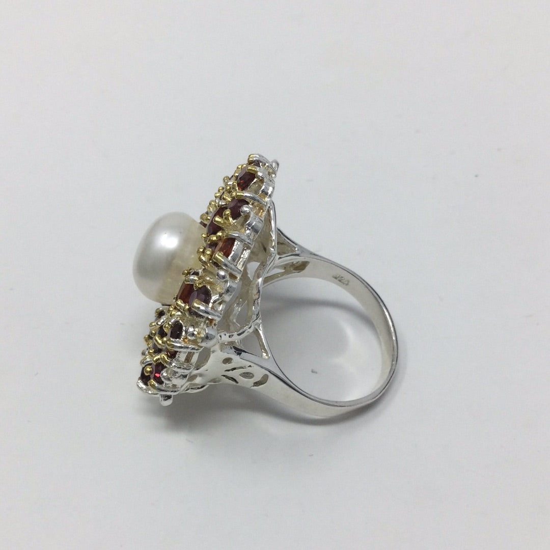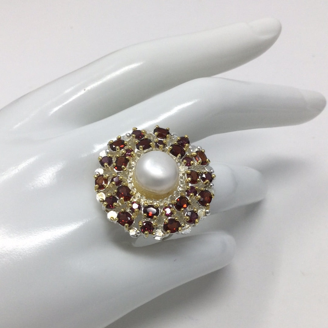 A luscious ,creamy natural 10mm pearl embraced by genuine Garnets. The faceted Garnets are Mozambique and the finest Rhodolite Garnets, hand selected for this ring. It’s a super classy elevated look that will enthrall you with its unique beauty. This one of a kind custom made ring is crafted in .925 sterling silver with a 14K white gold overlay. It’s an elegant sparkle that will become a future family heirloom. Size 6 3/4, Resize at your jeweler or use a ring guard.