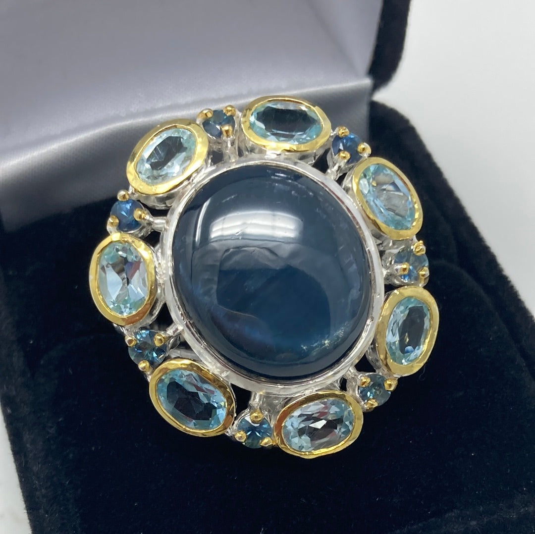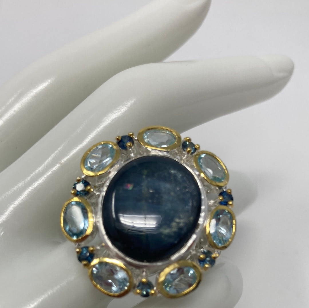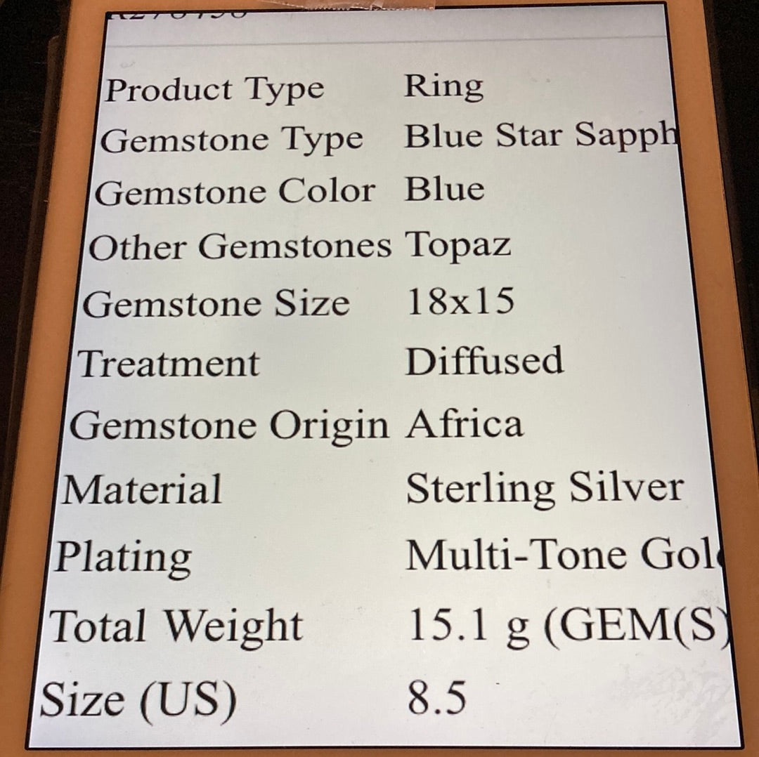 These are very difficult to obtain in this size, a genuine diffused Star Sapphire gemstone. It’s called a diffused star Sapphire, as it’s points are diffused throughout the stone as it moves when exposed to different lighting conditions. This blue is exquisite and very desirable, it has an otherworldly quality. This gemstone is surrounded by genuine Blue Topaz set in .925 sterling silver with a white and yellow gold overlay. It’s a custom made, one of a kind design made especially for this gemstone. A majestic piece for your future heirloom collection. Size 7 1/2, Resize at your jeweler or use a ring guard.