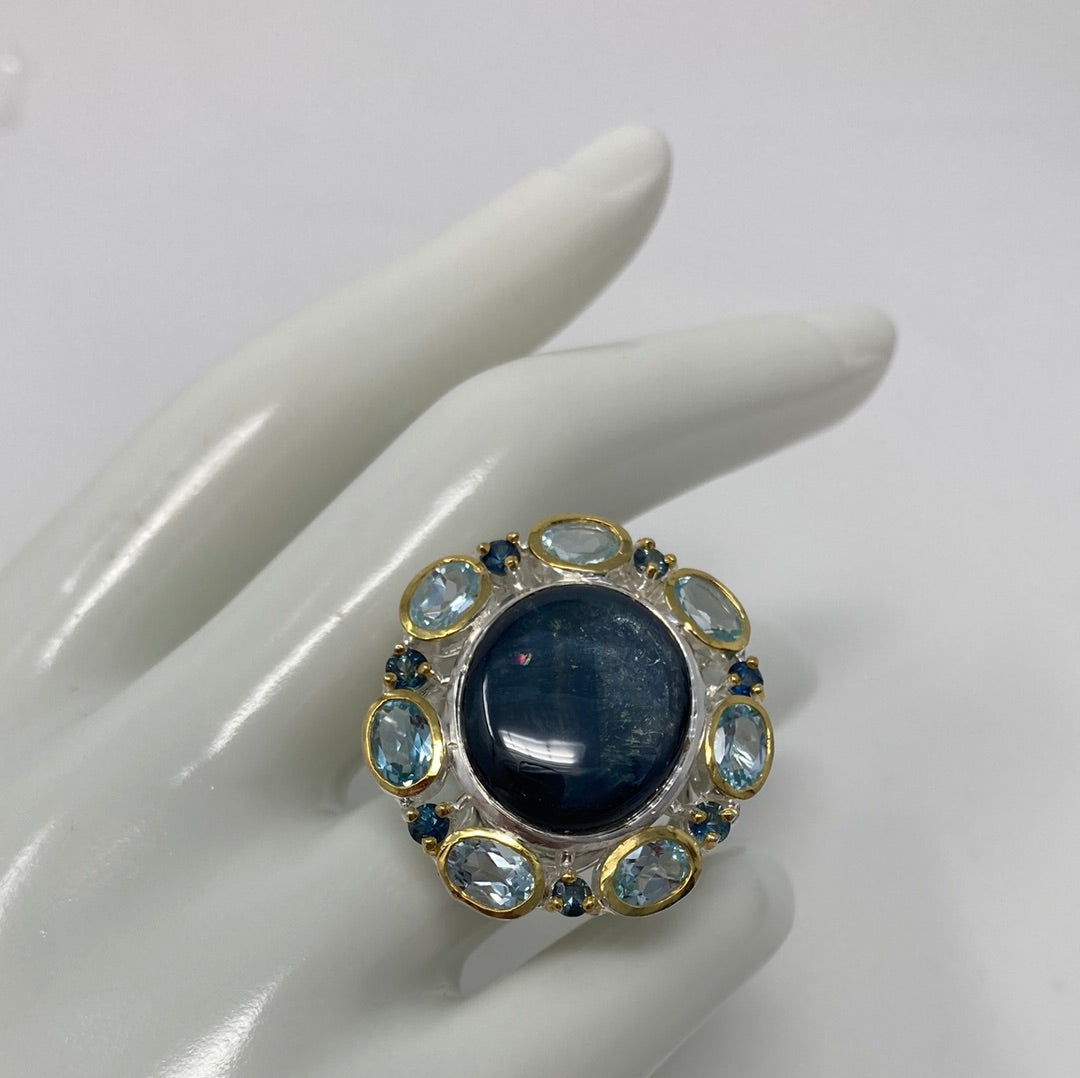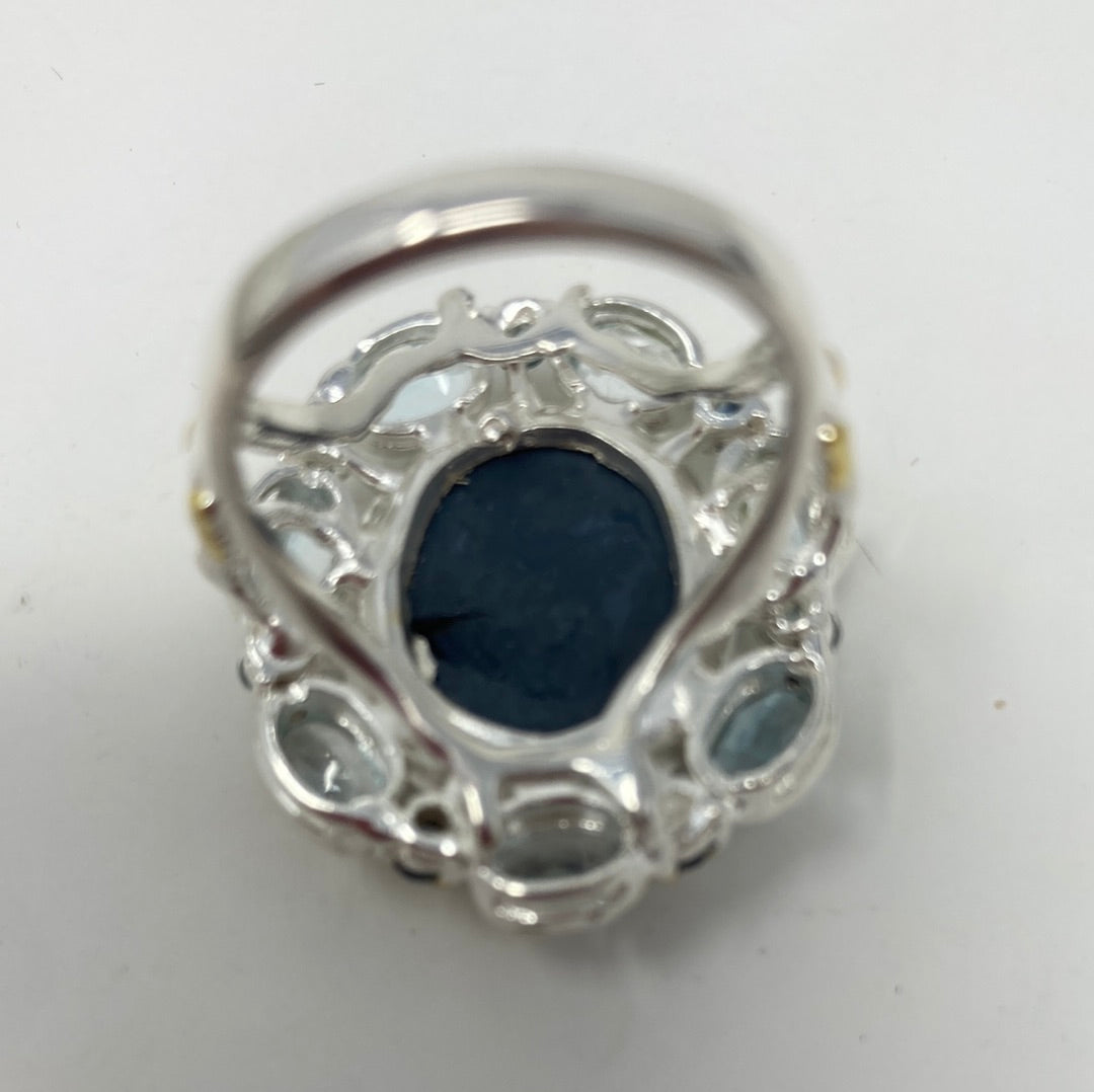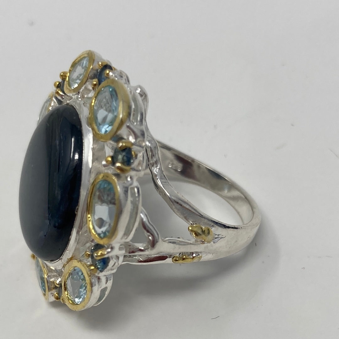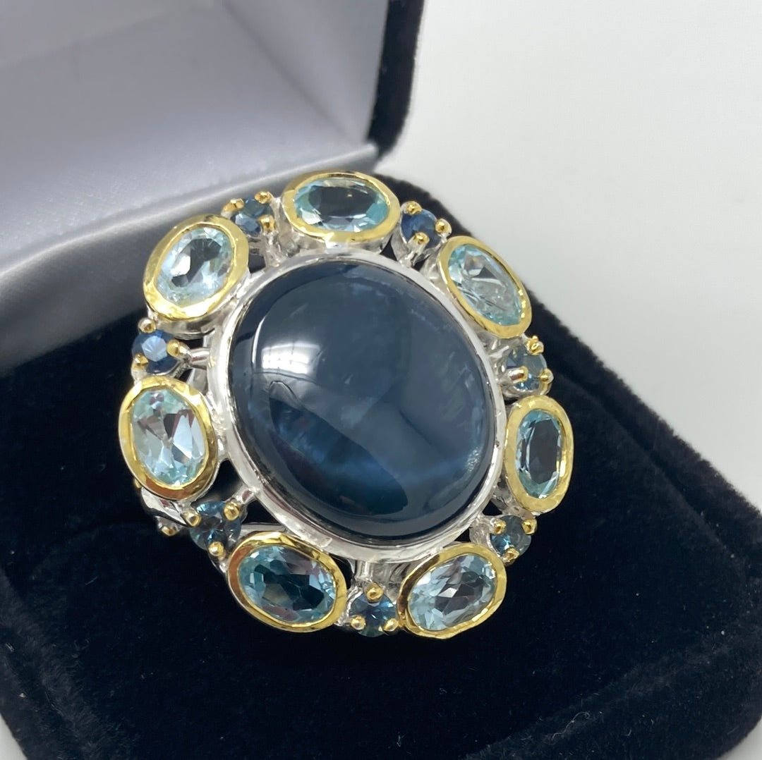 These are very difficult to obtain in this size, a genuine diffused Star Sapphire gemstone. It’s called a diffused star Sapphire, as it’s points are diffused throughout the stone as it moves when exposed to different lighting conditions. This blue is exquisite and very desirable, it has an otherworldly quality. This gemstone is surrounded by genuine Blue Topaz set in .925 sterling silver with a white and yellow gold overlay. It’s a custom made, one of a kind design made especially for this gemstone. A majestic piece for your future heirloom collection. Size 7 1/2, Resize at your jeweler or use a ring guard.