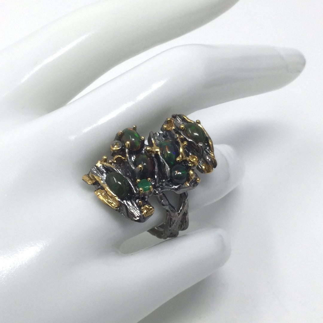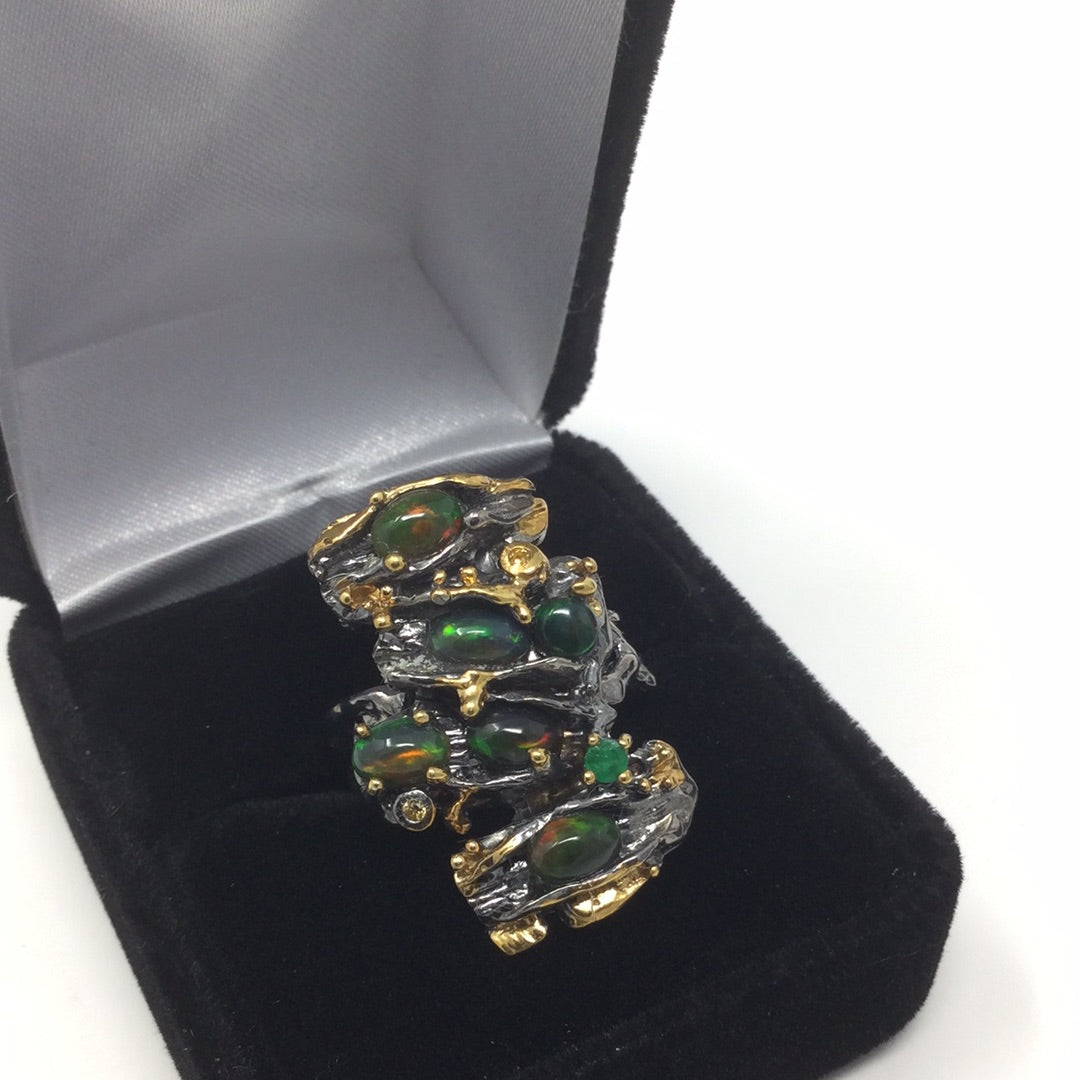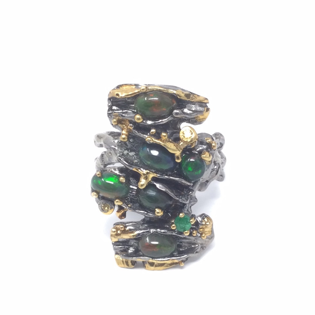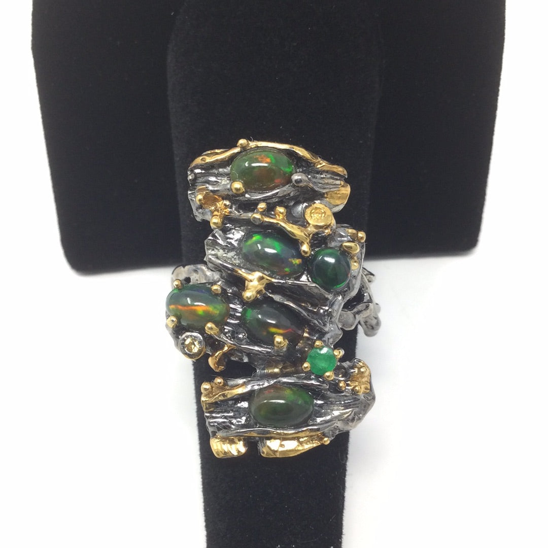 An amazing custom made, one of a kind from a master silversmith, hand selected fiery Black Opals with a genuine Emerald accent in this contemporary artistic design. This ring has an impact, it looks like a museum piece and you’ll never find anyone wearing this unique ring except you. Each Opal measures 6mm by 4mm and has an iridescence with flashes of red. Set in .925 silver with a Rhodium overlay and accents of 14K yellow gold. A highly desirable gemstone. Size 7, Resize at your jeweler