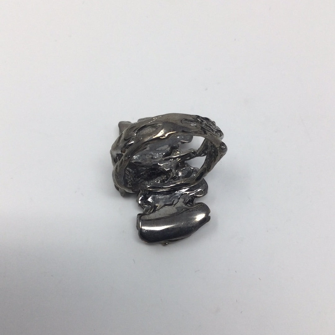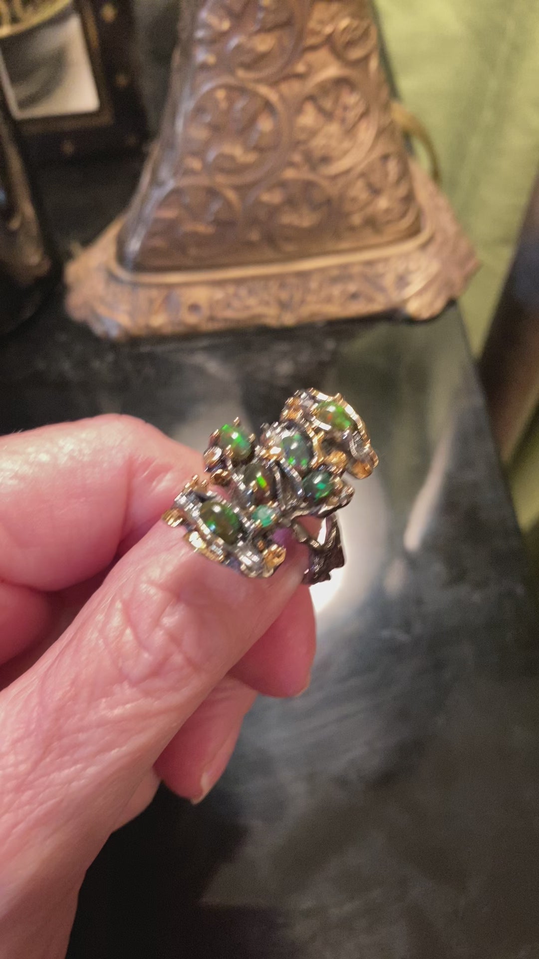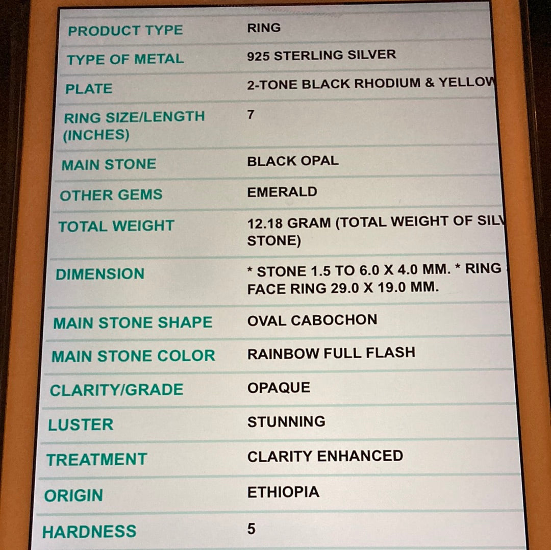 An amazing custom made, one of a kind from a master silversmith, hand selected fiery Black Opals with a genuine Emerald accent in this contemporary artistic design. This ring has an impact, it looks like a museum piece and you’ll never find anyone wearing this unique ring except you. Each Opal measures 6mm by 4mm and has an iridescence with flashes of red. Set in .925 silver with a Rhodium overlay and accents of 14K yellow gold. A highly desirable gemstone. Size 7, Resize at your jeweler