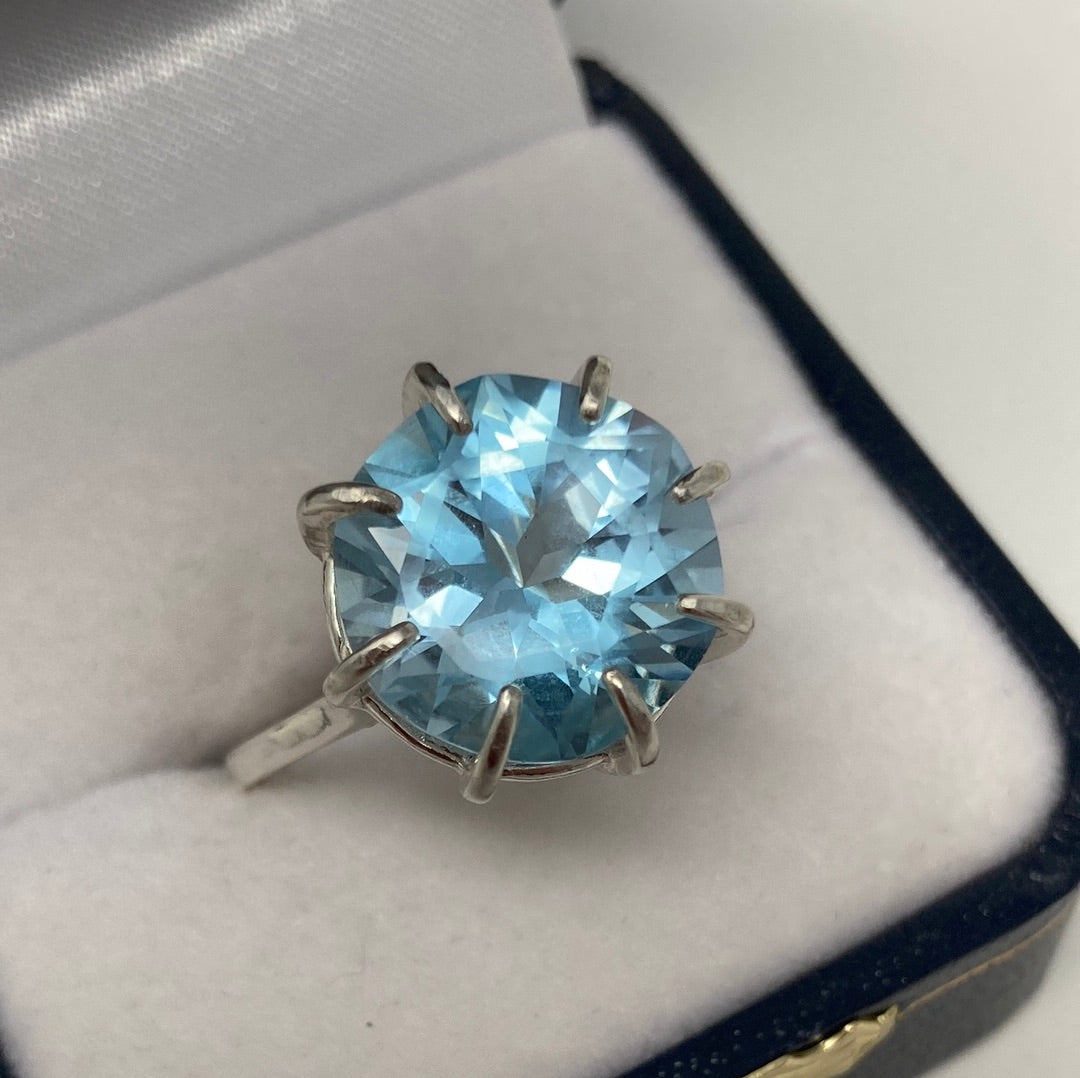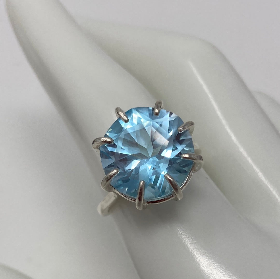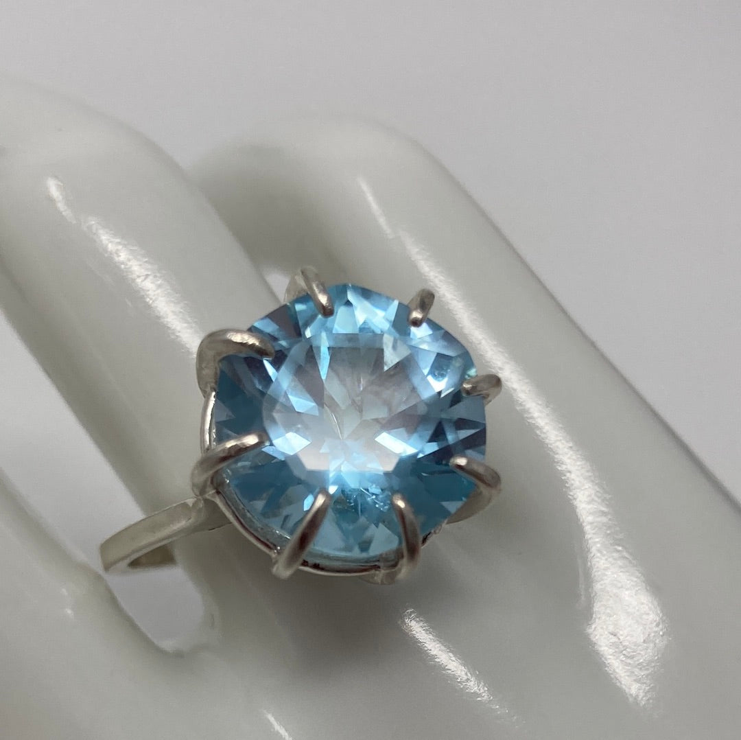 These are very hard to come by, this exquisite genuine Topaz, approximately 12mm round. An exceptional round brilliant with a Star of David etched intricately onto the table of this gemstone. It has it all, cut, color and clarity, I found this at The Atlanta Gem and Mineral Show a real treasure you just cannot find, set in .925 sterling silver. Size 8 1/2, Resize at your jeweler.