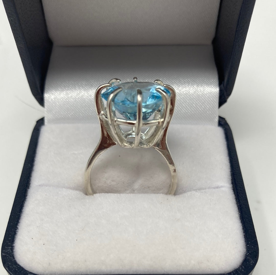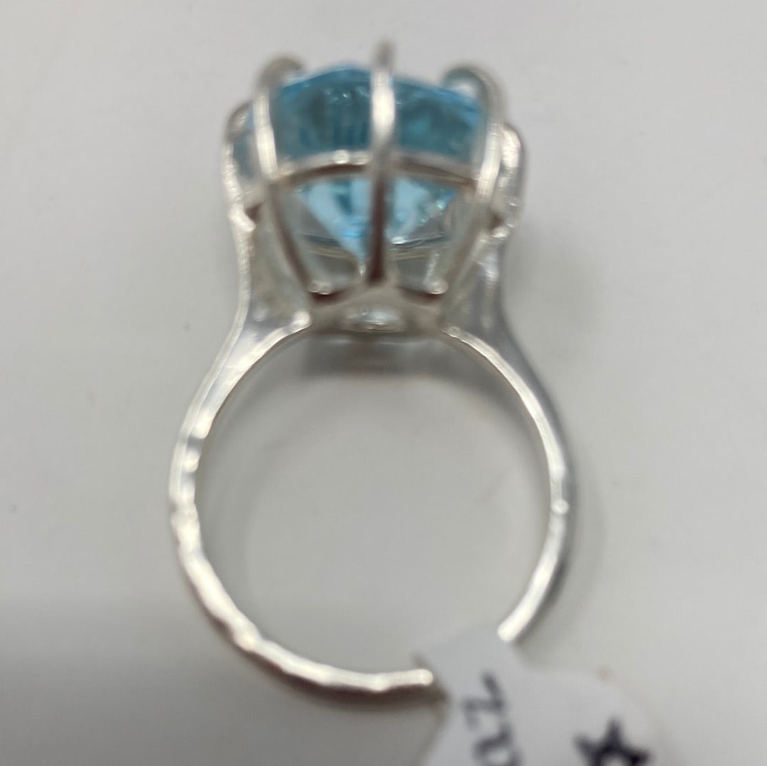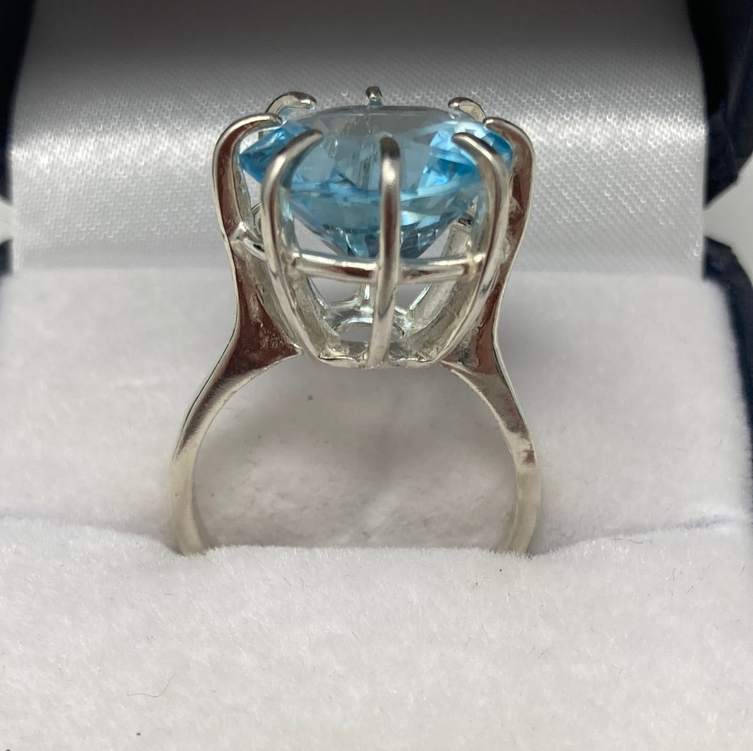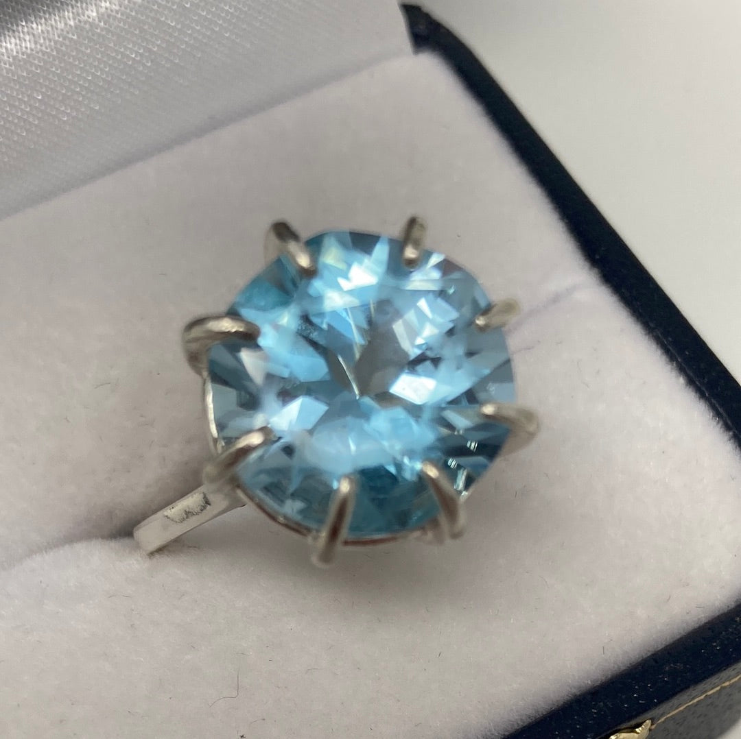 These are very hard to come by, this exquisite genuine Topaz, approximately 12mm round. An exceptional round brilliant with a Star of David etched intricately onto the table of this gemstone. It has it all, cut, color and clarity, I found this at The Atlanta Gem and Mineral Show a real treasure you just cannot find, set in .925 sterling silver. Size 8 1/2, Resize at your jeweler.