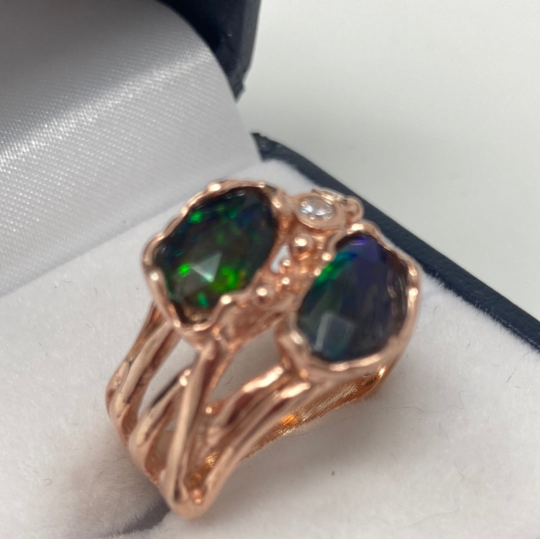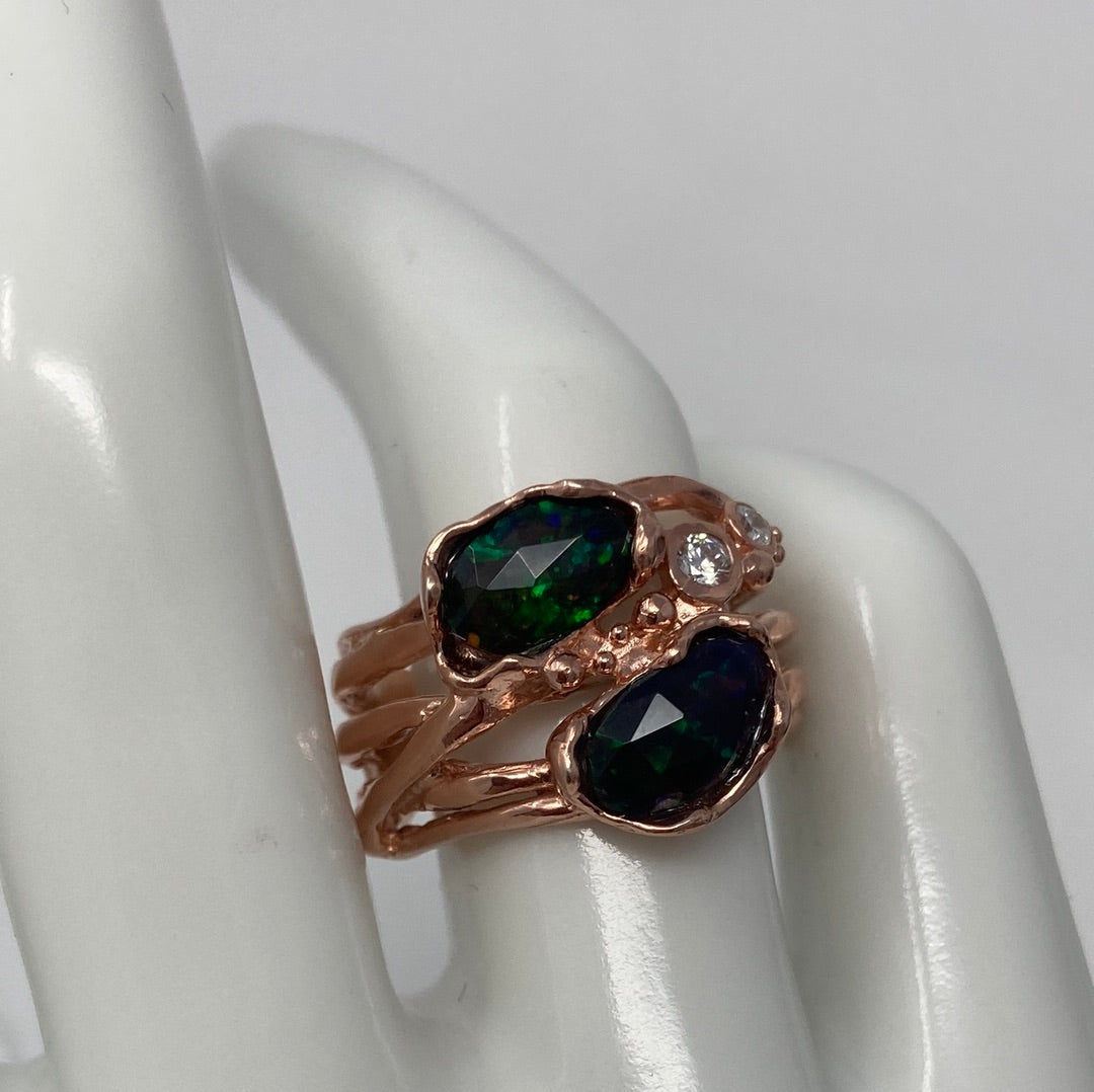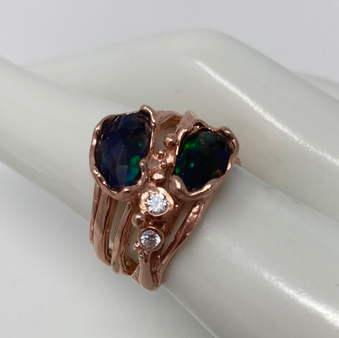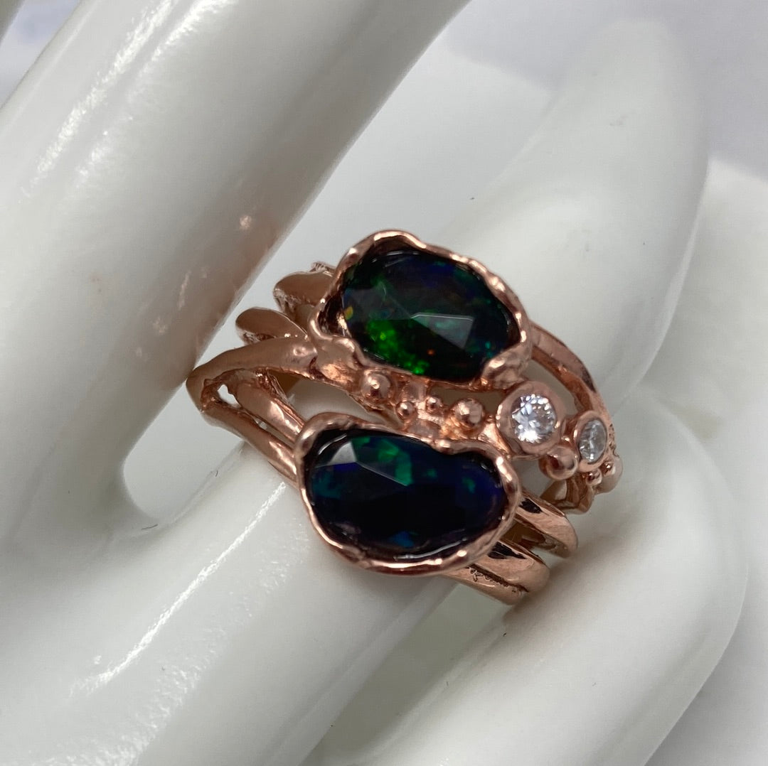 Amazing to find faceted Genuine Black Opals set in .925 sterling silver with a Rose Gold overlay for durability and beauty. A custom made, one of a kind, that is a stylized contemporary design. Size 6 1/2