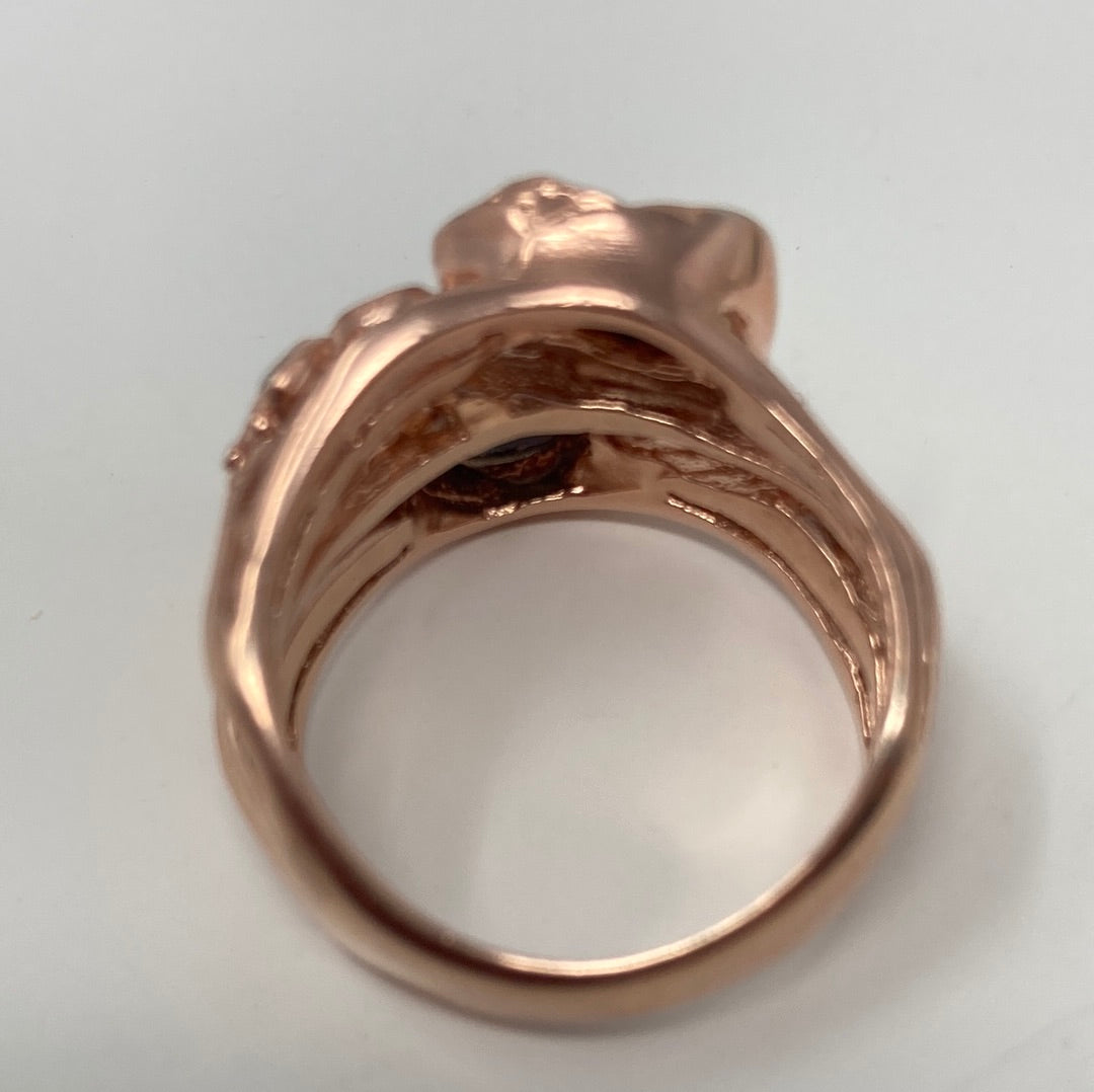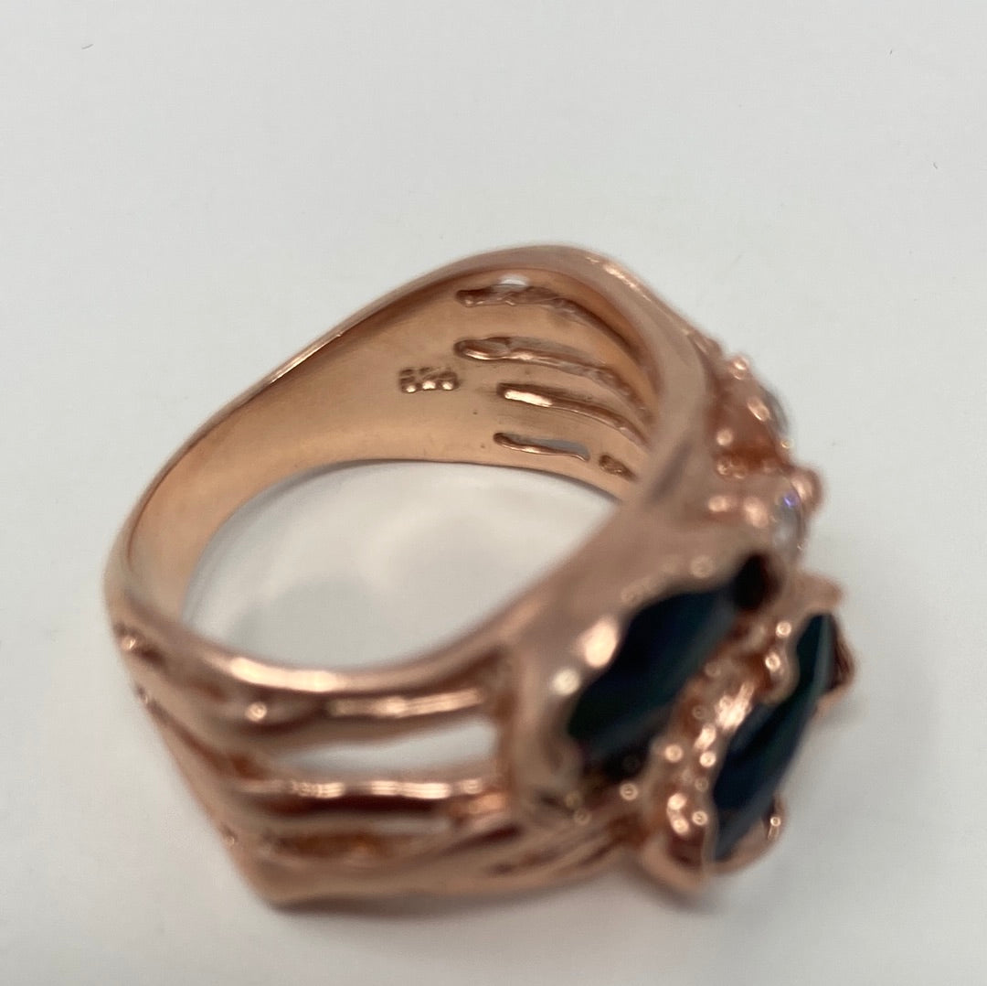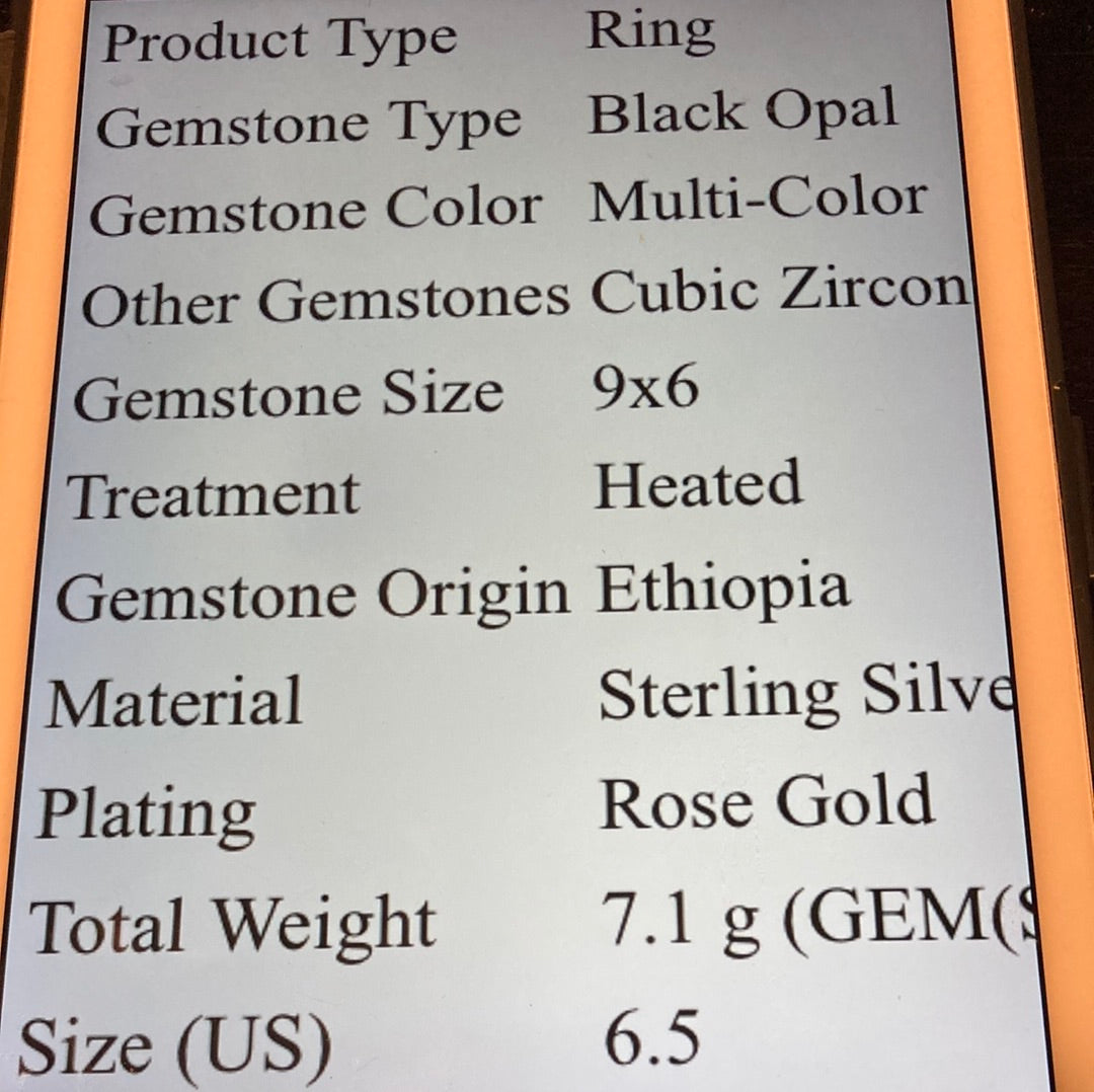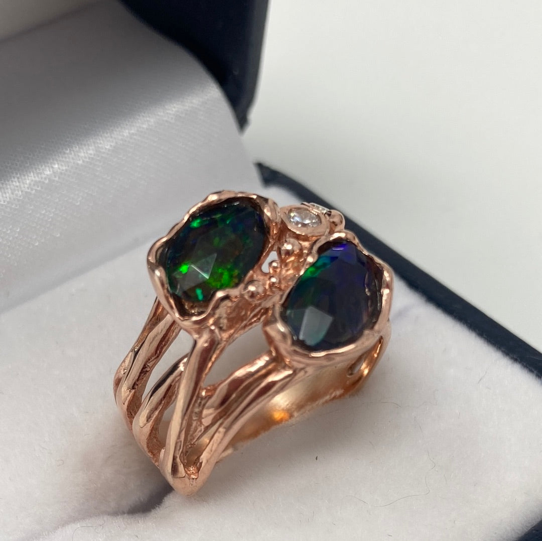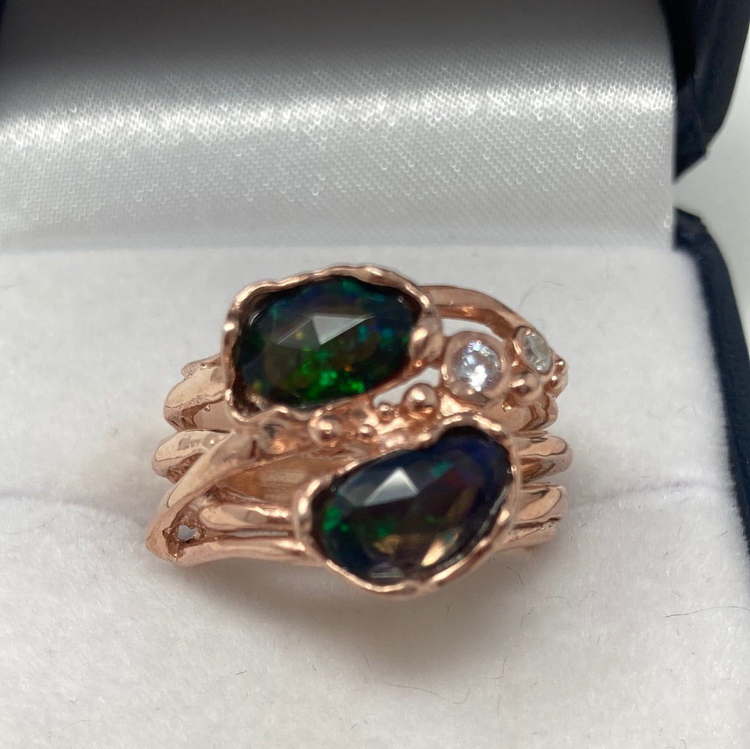 Amazing to find faceted Genuine Black Opals set in .925 sterling silver with a Rose Gold overlay for durability and beauty. A custom made, one of a kind, that is a stylized contemporary design. Size 6 1/2