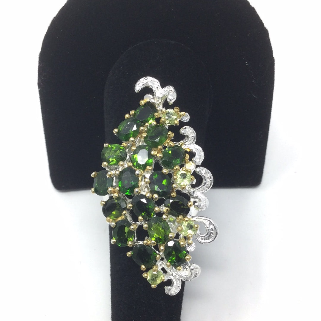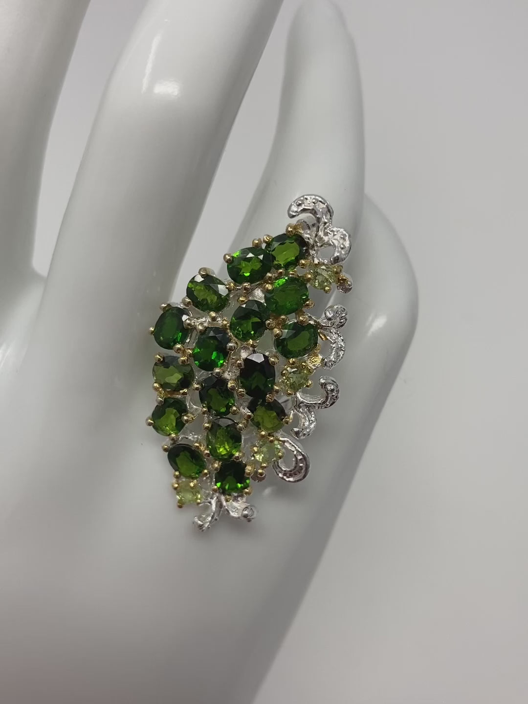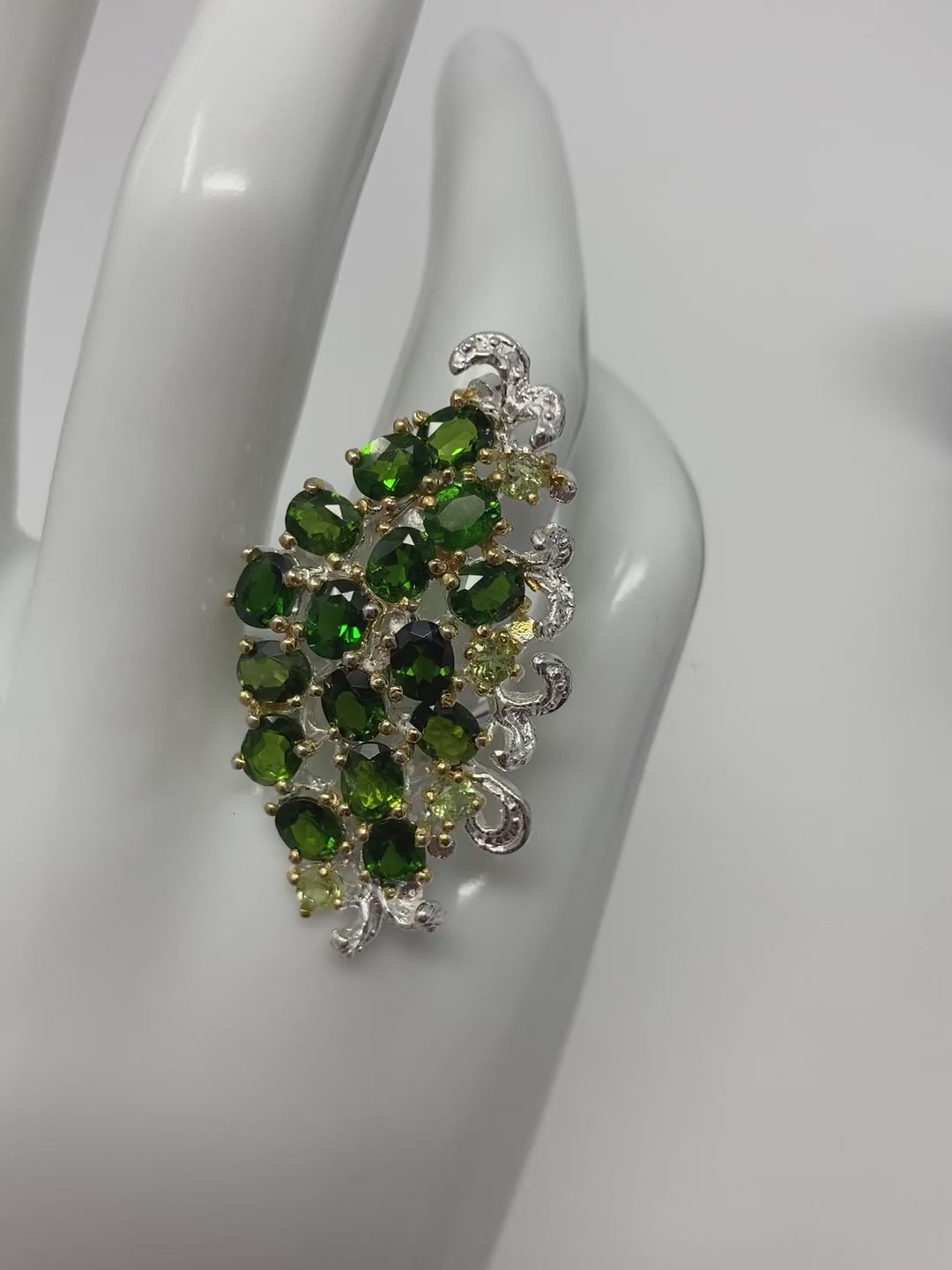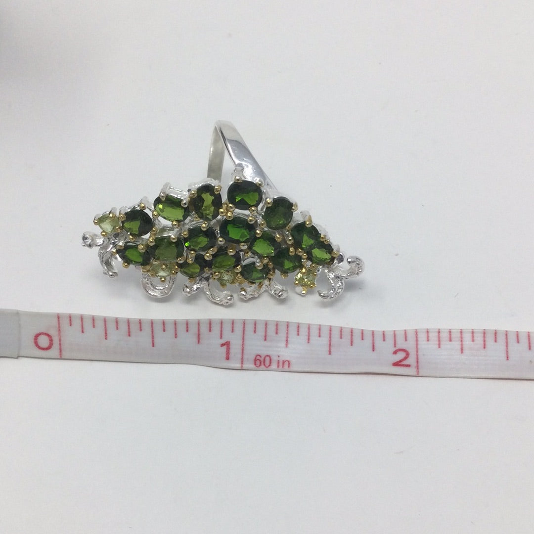 Seldom do I come across sizable, genuine Russian Chrome Diopside that has good quality and affordable but when I do I grab it. I present to you this stunning cascade of genuine Russian Chrome Diopside in this elegant cocktail ring, truly unique and seldom seen in these quantities. Each gemstone measures 5mm by 4mm all hand selected for this custom made setting.Accented with genuine peridot too. Truly a very high end look, set in .925 sterling silver with a 14K white gold overlay. You’ll treasure this ring for many years to come. Size 7 1/2, Resize at your jeweler