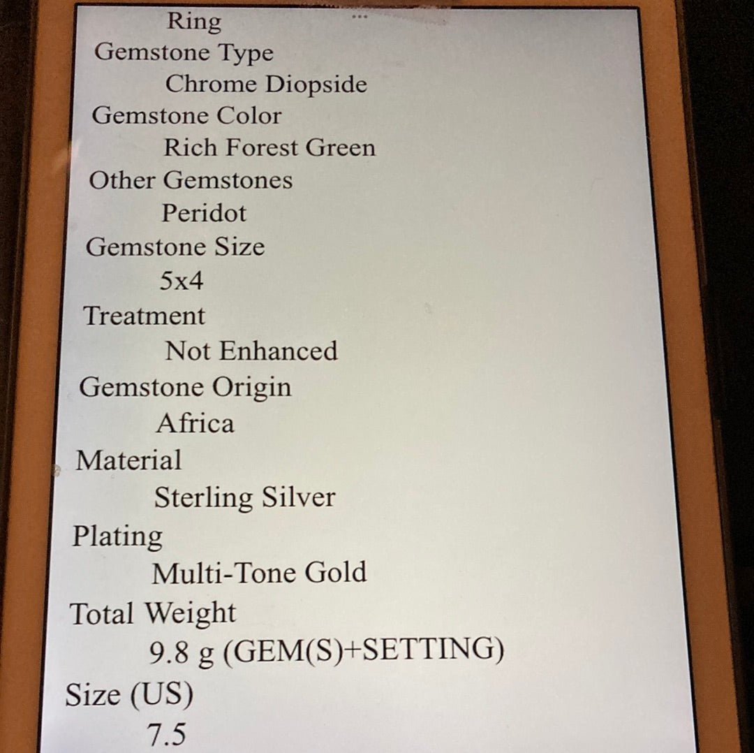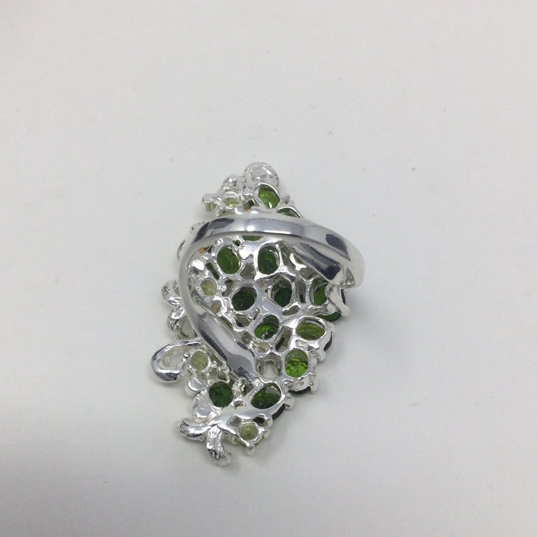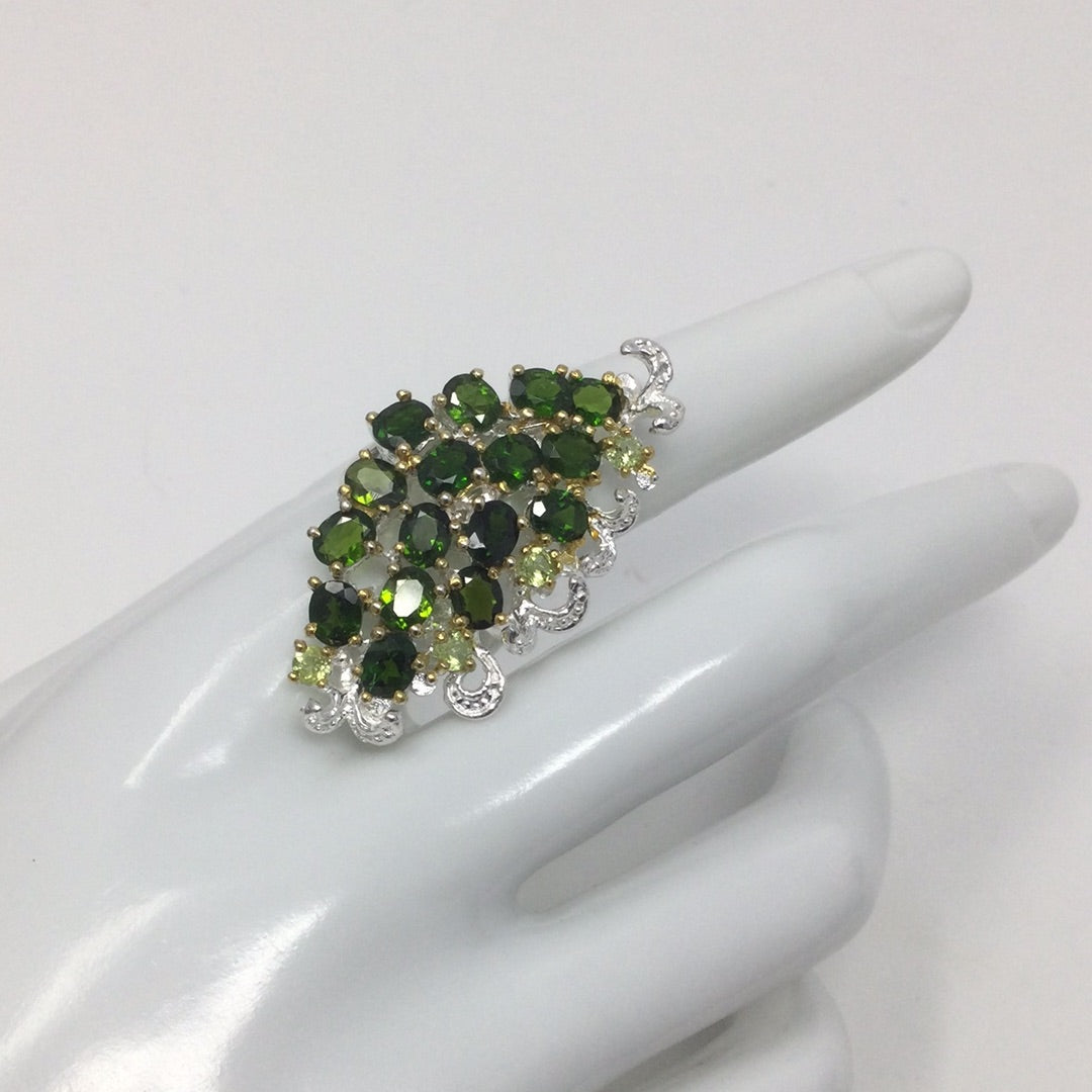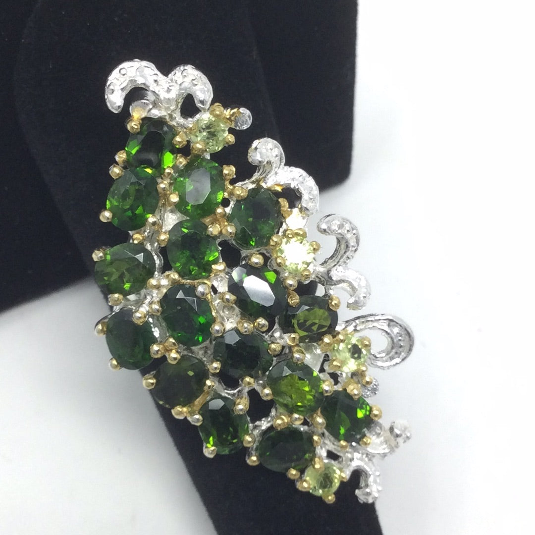 Seldom do I come across sizable, genuine Russian Chrome Diopside that has good quality and affordable but when I do I grab it. I present to you this stunning cascade of genuine Russian Chrome Diopside in this elegant cocktail ring, truly unique and seldom seen in these quantities. Each gemstone measures 5mm by 4mm all hand selected for this custom made setting.Accented with genuine peridot too. Truly a very high end look, set in .925 sterling silver with a 14K white gold overlay. You’ll treasure this ring for many years to come. Size 7 1/2, Resize at your jeweler