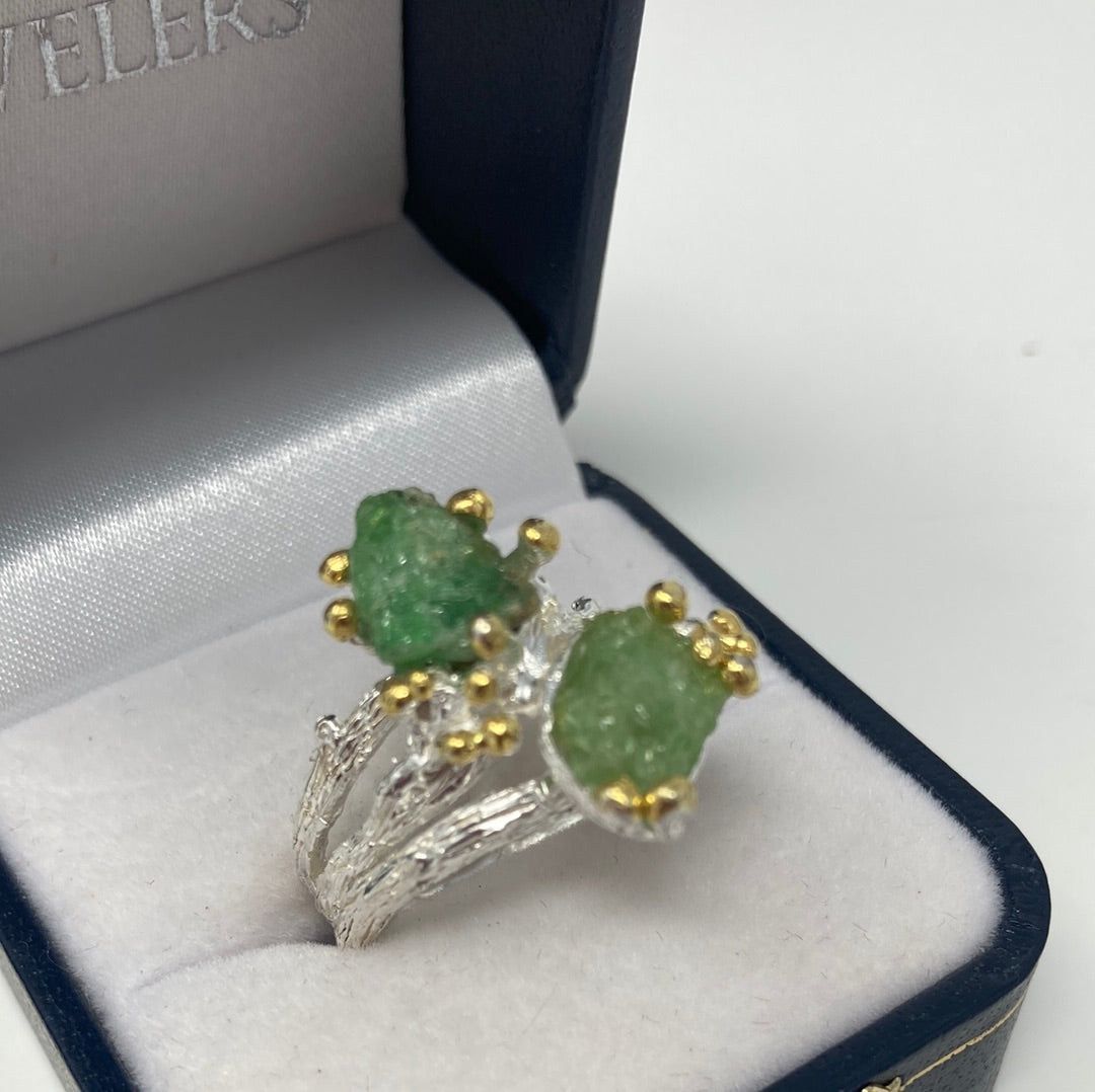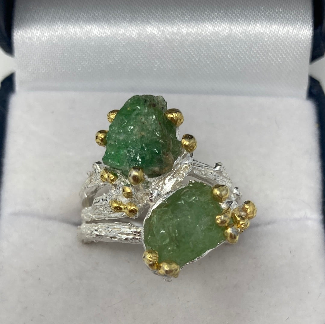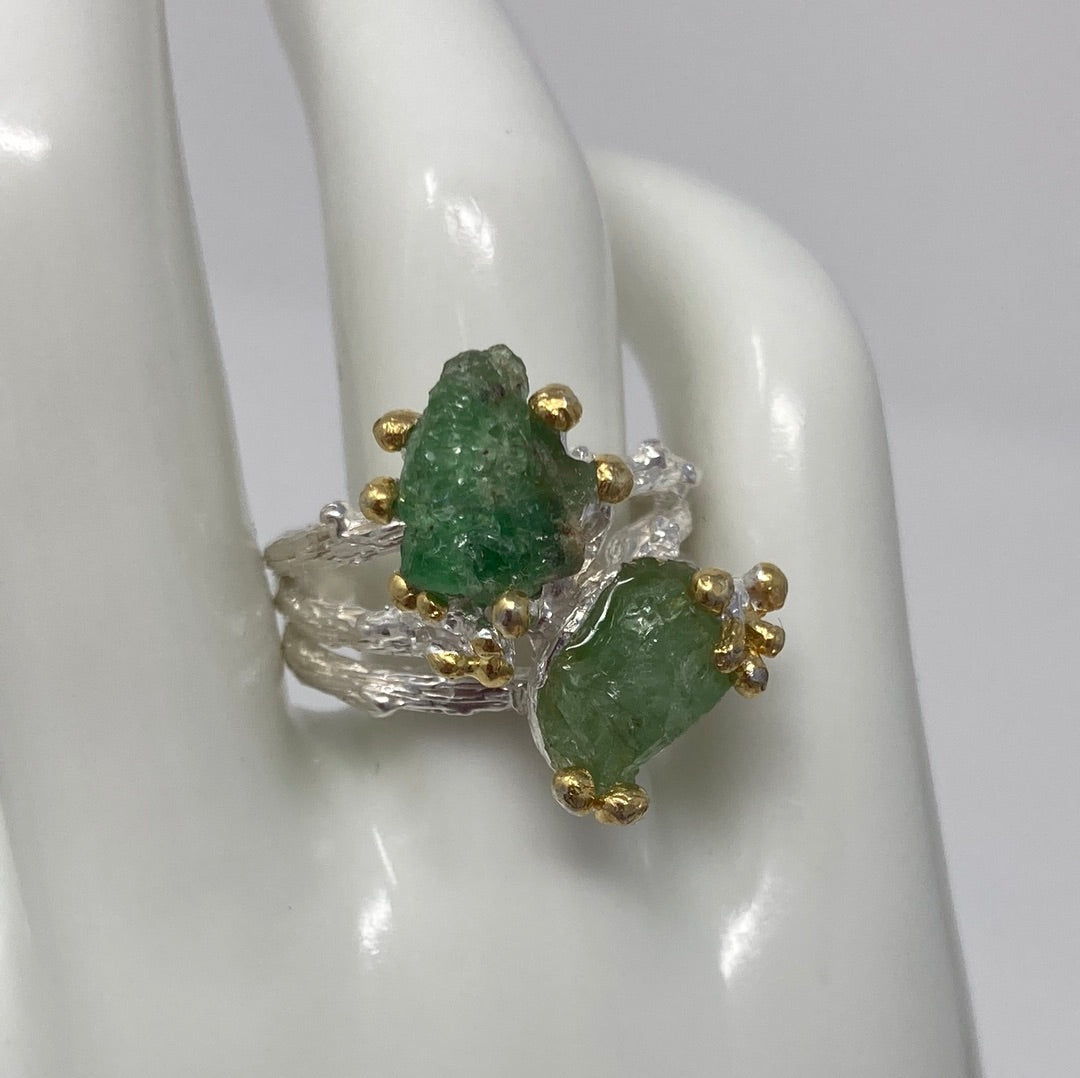 There’s nothing like genuine Emeralds and especially raw, uncut and unpolished natural Emeralds to wear as contemporary art upon your hand. These beauties are 10mm by 8mm, set in .925 Sterling Silver with gold accents and are showcased in their natural state. It’s an unusual way to wear them but as you know there’s nothing usual about us. We love a custom made, one of a kind design, never mass produced here. Size 7 1/2