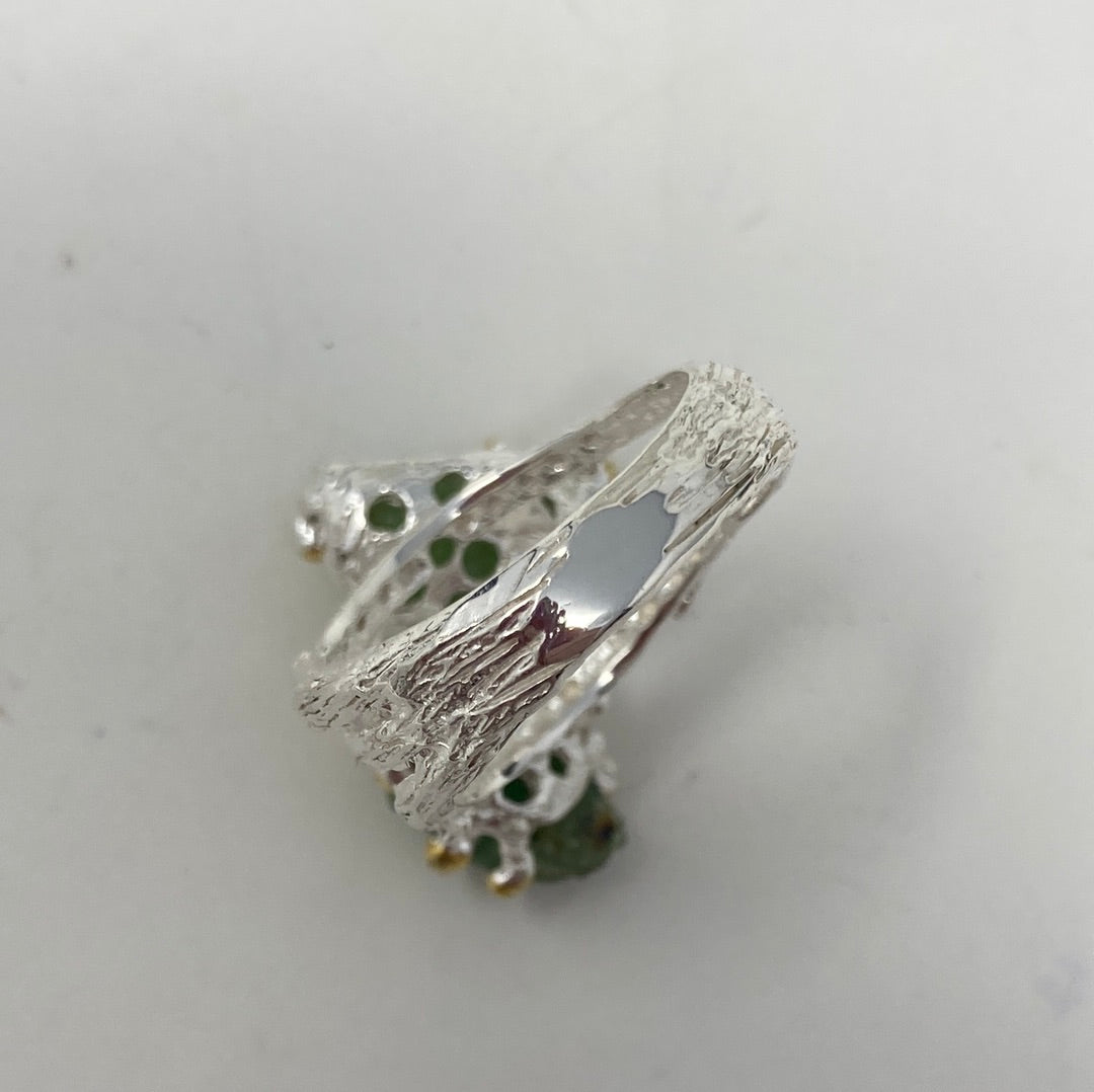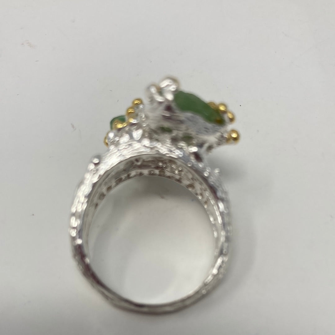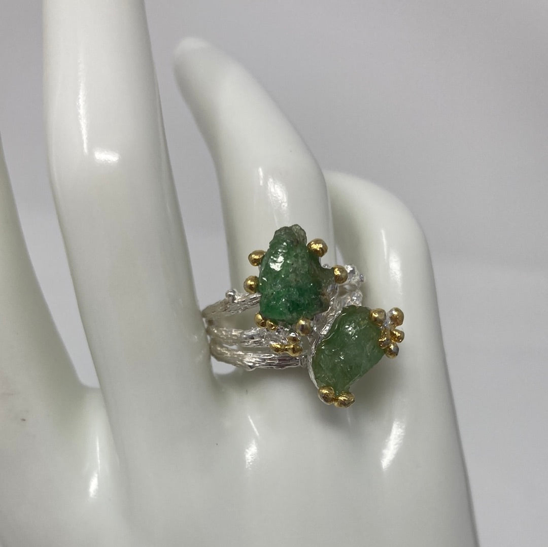 There’s nothing like genuine Emeralds and especially raw, uncut and unpolished natural Emeralds to wear as contemporary art upon your hand. These beauties are 10mm by 8mm, set in .925 Sterling Silver with gold accents and are showcased in their natural state. It’s an unusual way to wear them but as you know there’s nothing usual about us. We love a custom made, one of a kind design, never mass produced here. Size 7 1/2