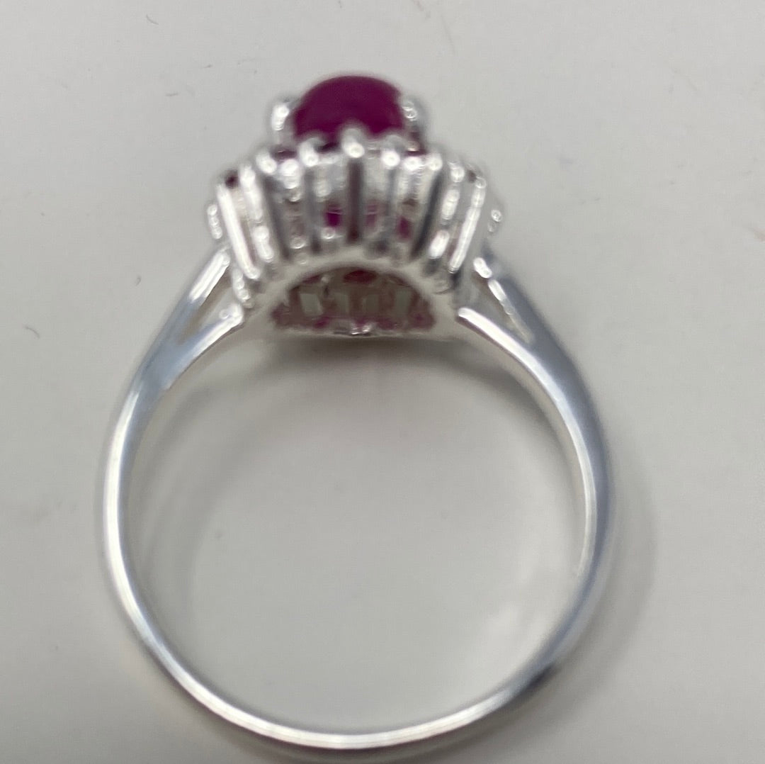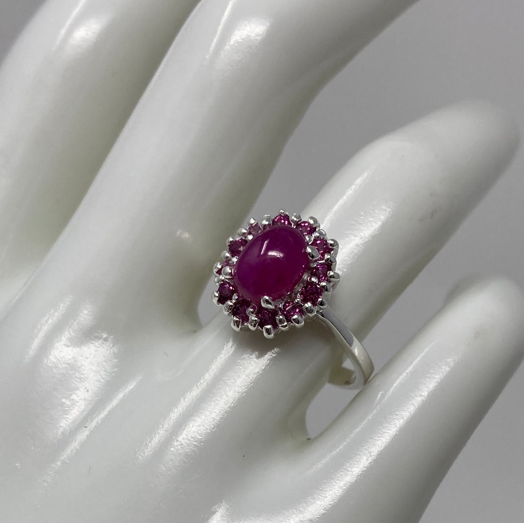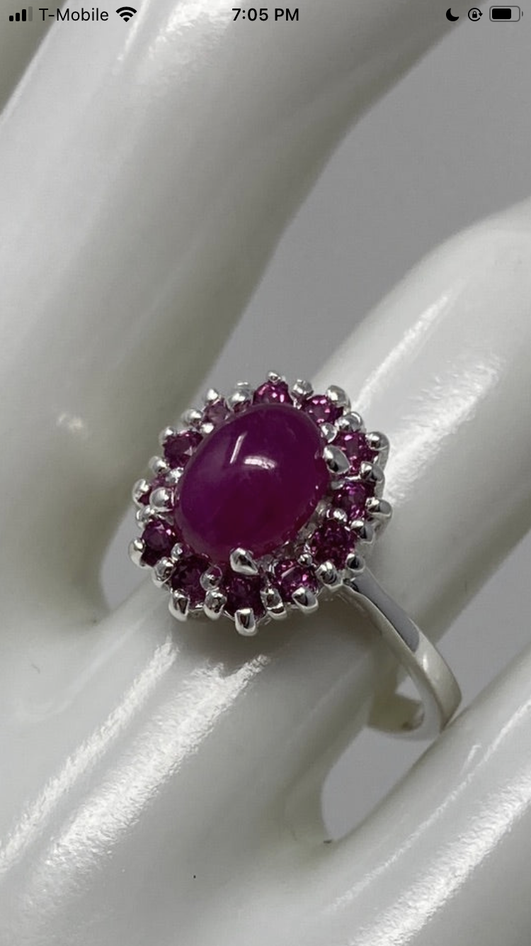 Here a special endearing Genuine 8mm by 6 mm Ruby ring surrounded by exceptional Rhodolite Garnets. It has a classic princess style setting that is timeless in elegance and class. Set with in .925 Sterling Silver Size 6 3/4 Resize at your jeweler or use a ring guard