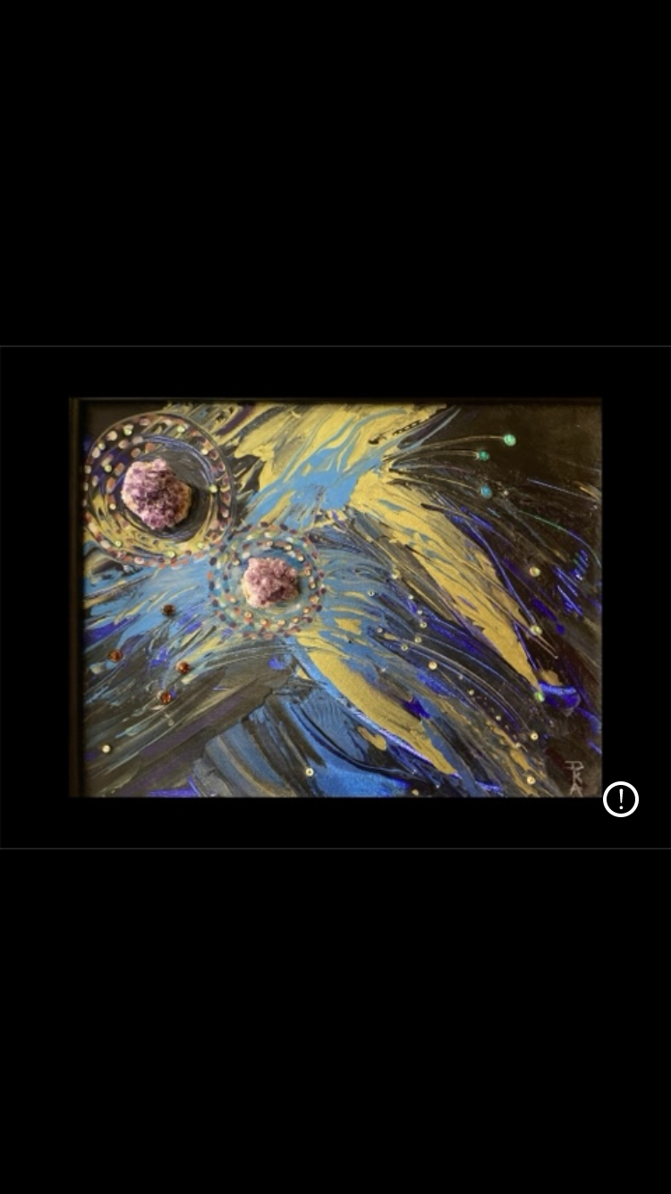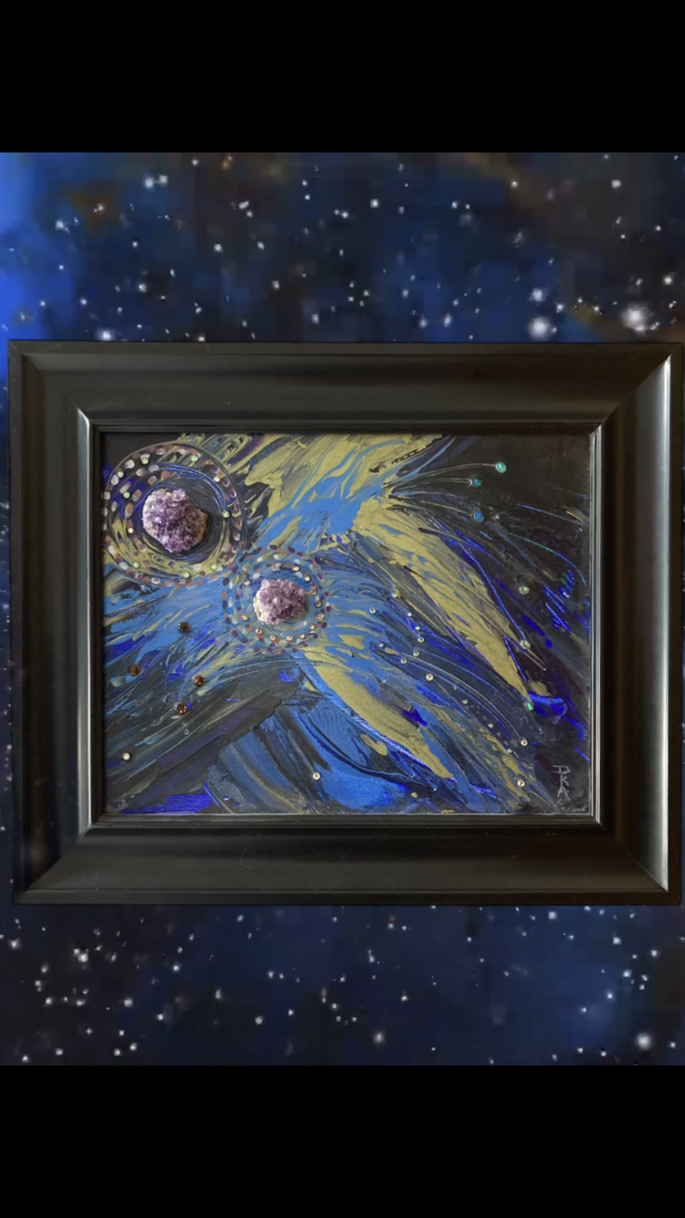 An impactful mixed media painting depicted a galaxy explosion, a supernova. I incorporated genuine Amethyst clusters, Opalite, & Swarovski crystals in this mixed media, artist original painted by myself, Miss Debbie. This painting shows is the majesty.of the universe and it somehow it helps diminishes our own problems. The magnitude of the universe gives glory to the creator. I used acrylic paint combined with a medium to adhere the mixed media to the canvas. Framed in black it is 18” by 15”.