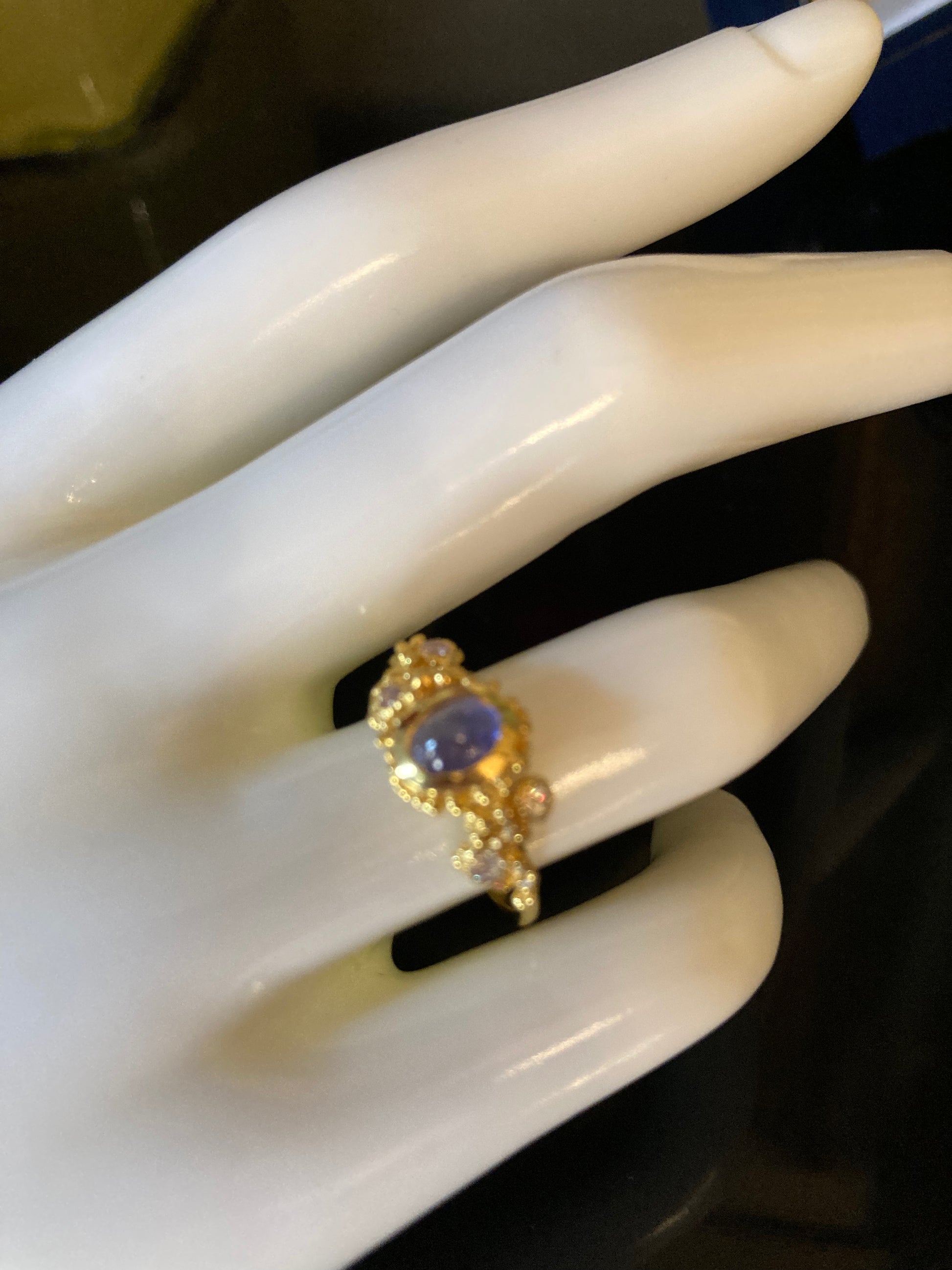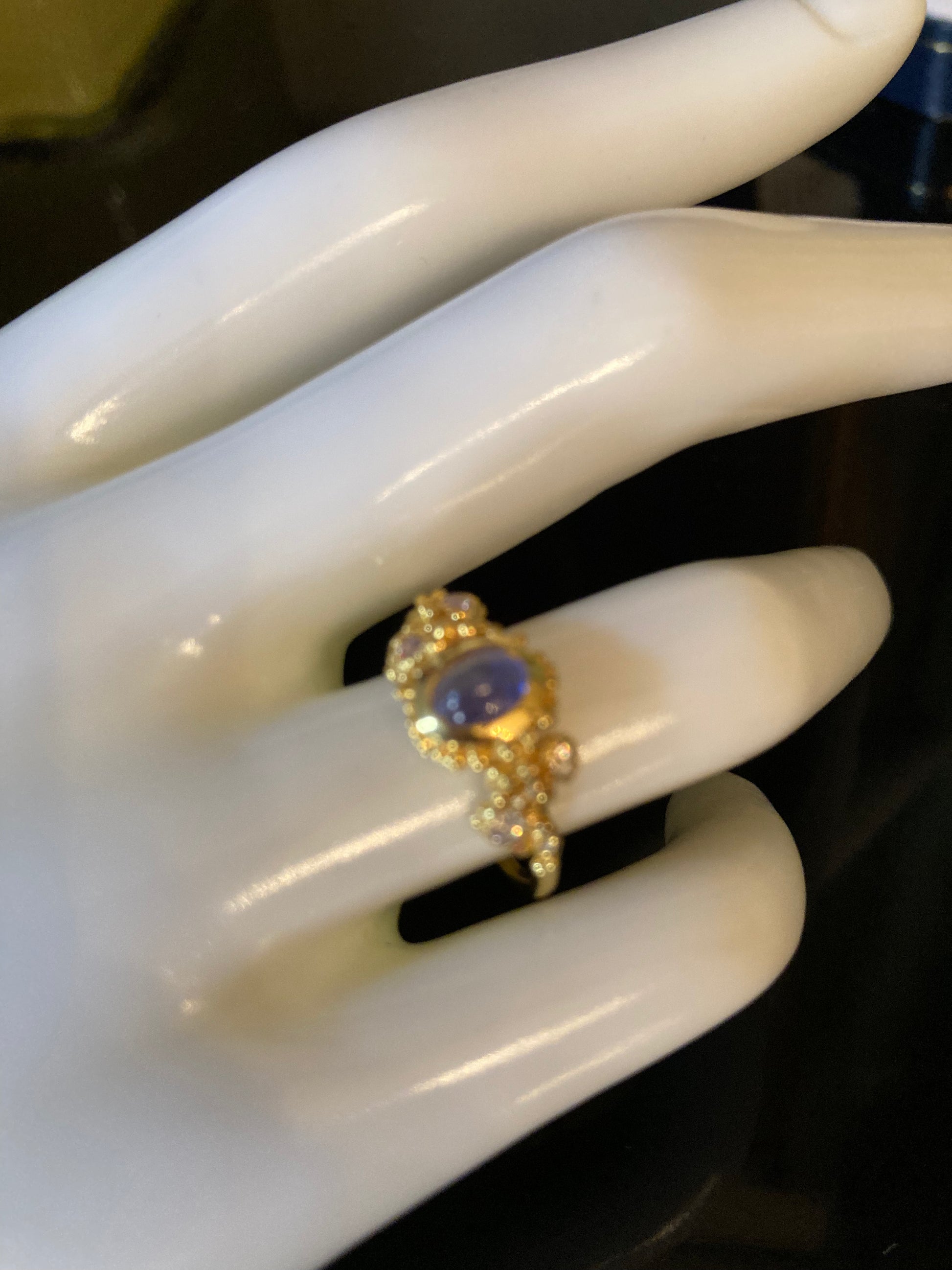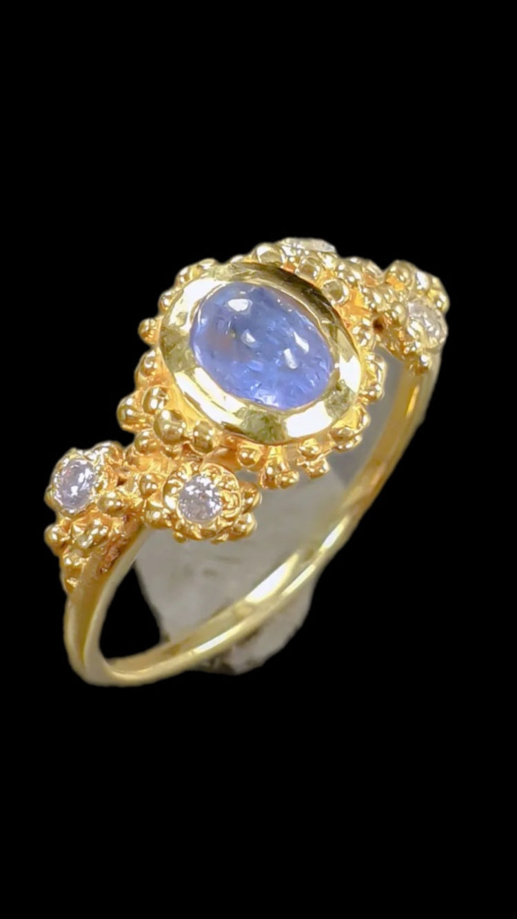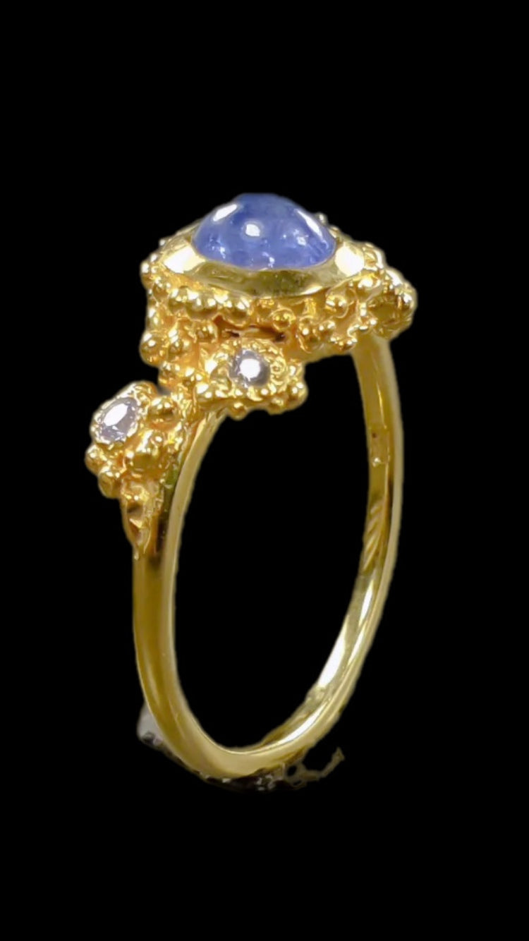 An artistic, unique Genuine Tanzanite Ring. A custom made one of a kind with and exquisite Tanzanite set in 925 Sterling Silver with a yellow gold overlay, accented with tiny CZS. A romantic and rare genuine, gemstone measuring 6mm by 4mm. Tanzanite is a rare gemstone with a unique color. Size 6 1/2, Resize at your local jeweler.