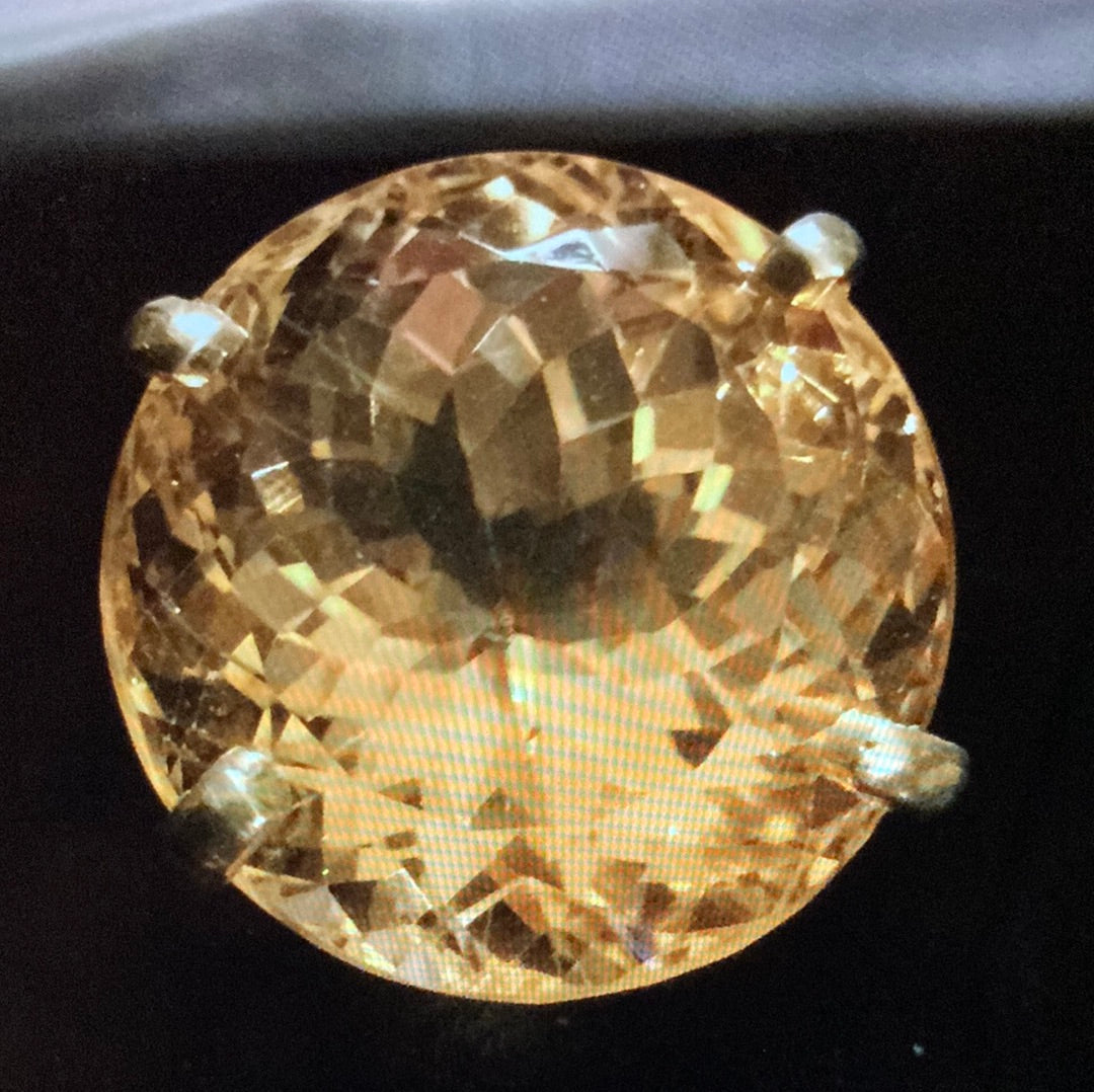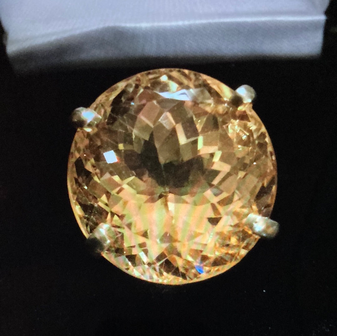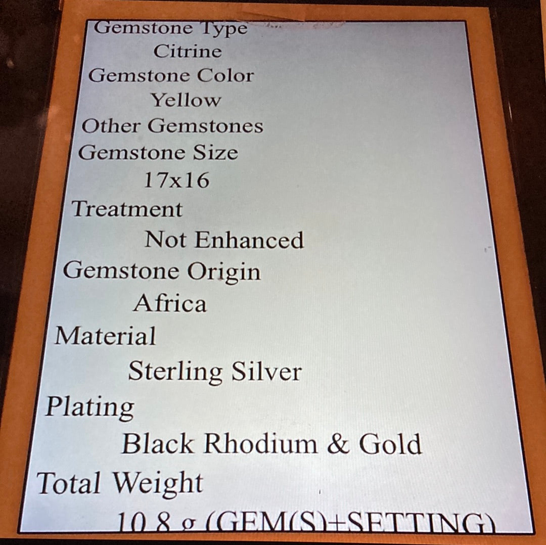 A magnificent genuine Citrine that emits golden rays of light that sparkle like the royal jewels. Notice the size and depth of this special gemstone, it has it all, cut, color and clarity ! A gemstone is like a personal signature to your refined taste, art at your fingertips. A 17mm by 15mm specimen, over 20 CTW, set in .925 with a Rhodium & gold overlay for durability and beauty. Size