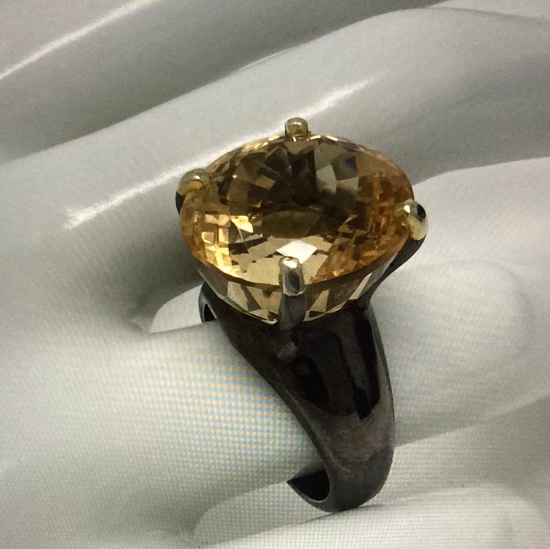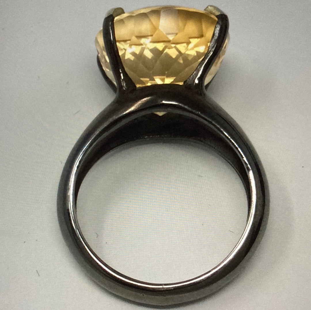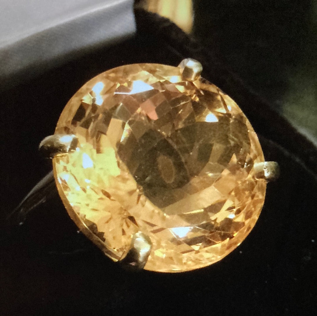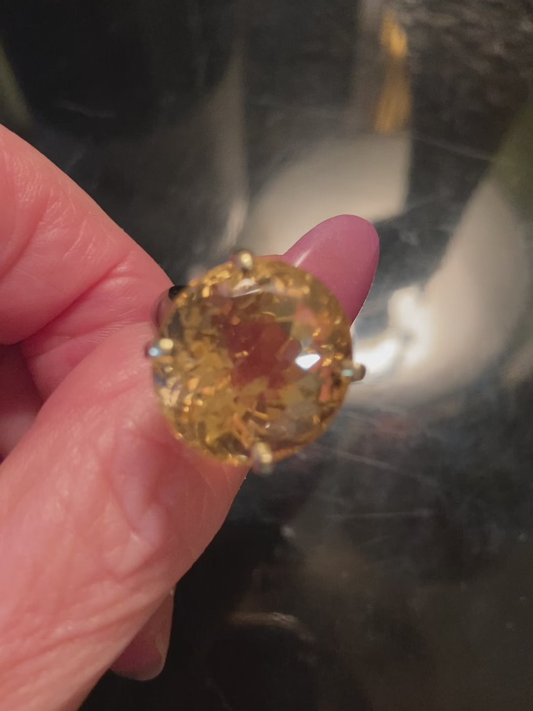 A magnificent genuine Citrine that emits golden rays of light that sparkle like the royal jewels. Notice the size and depth of this special gemstone, it has it all, cut, color and clarity ! A gemstone is like a personal signature to your refined taste, art at your fingertips. A 17mm by 15mm specimen, over 20 CTW, set in .925 with a Rhodium & gold overlay for durability and beauty. Size