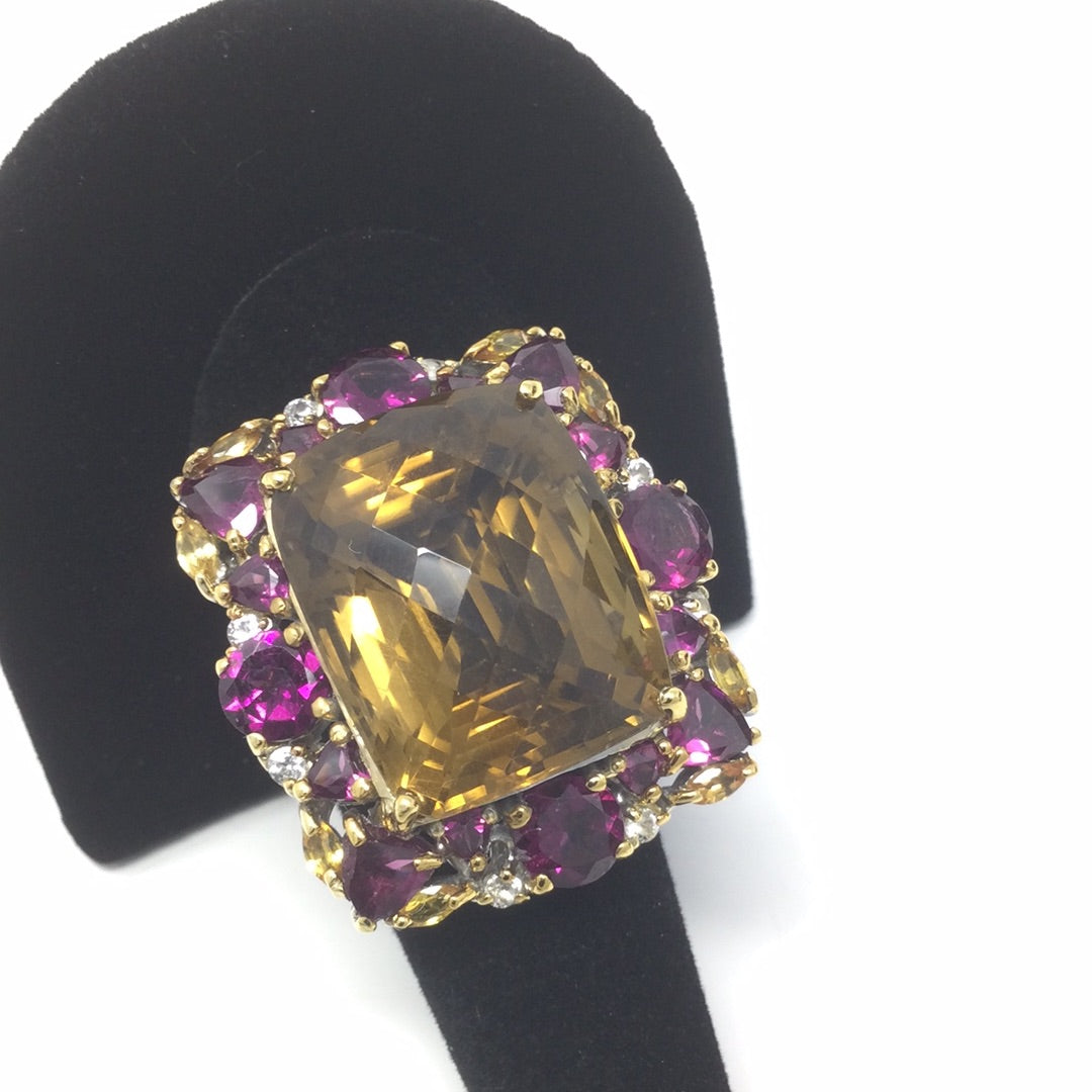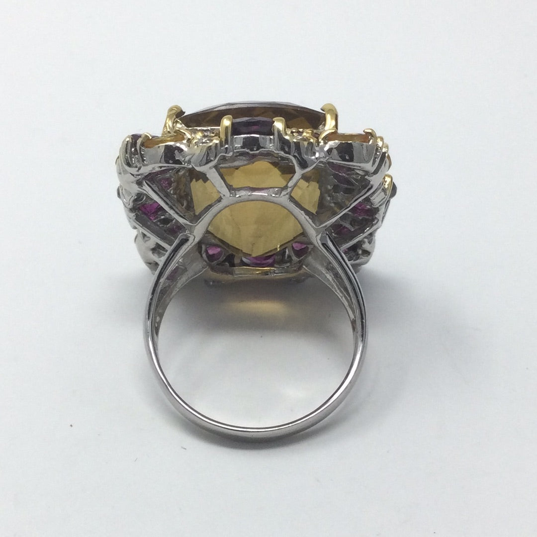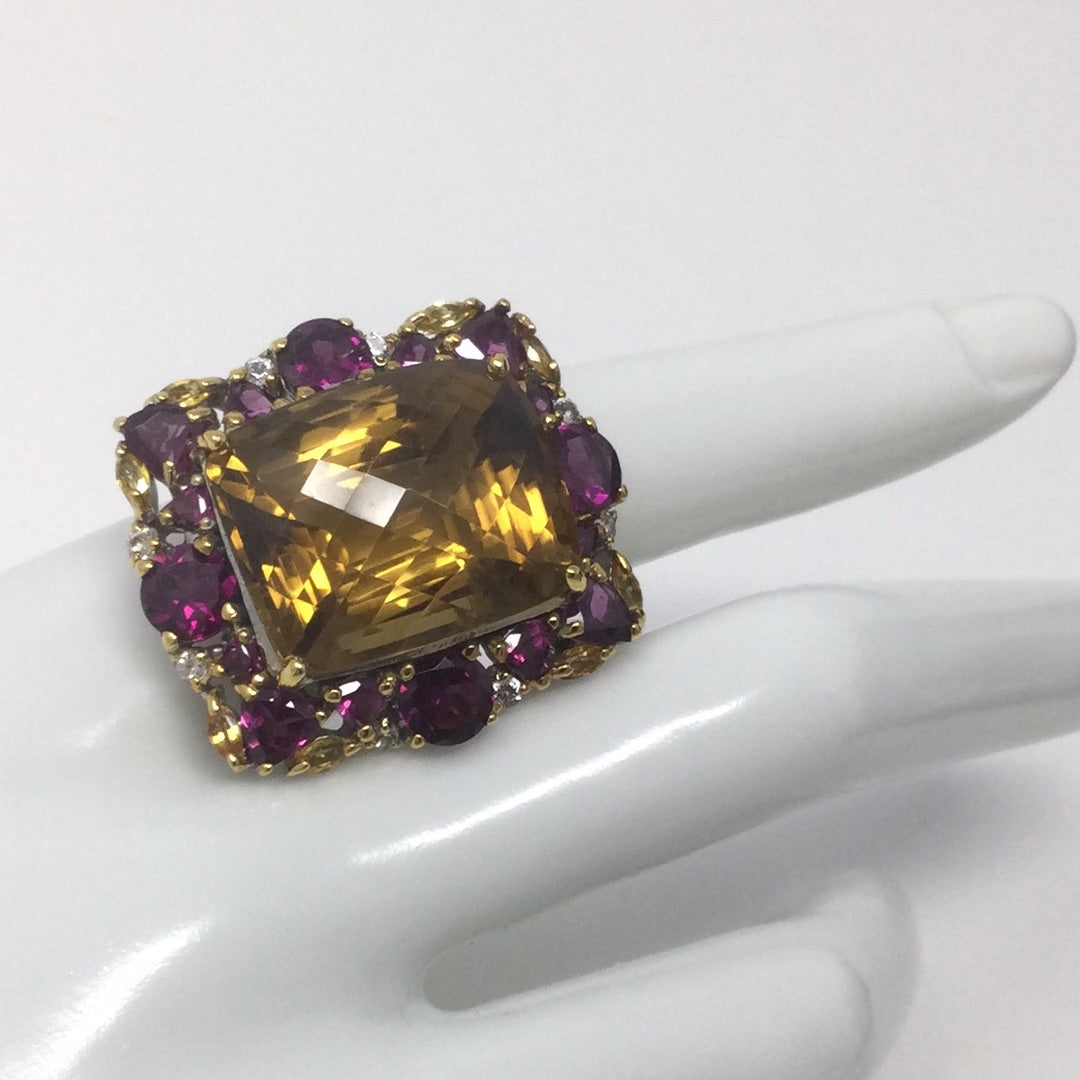 This amazing gemstone is a super high quality genuine Citrine in that very desirable checkerboard faceted cut. The light bounces off this facets is a way that is absolutely breathtaking to see in person. This ring has been custom designed for this prized gemstone, surrounded by the best genuine Pink Rhodolite and White Topaz. This is a one of a kind set in .925 with a 14K yellow gold overlay and white gold overlay on the band for durability and beauty.This ring can be your family treasure for generations to come. Always invest in custom quality pieces with high quality gemstones. Size 9 1/2, Resize at your jeweler or use a ring guard.