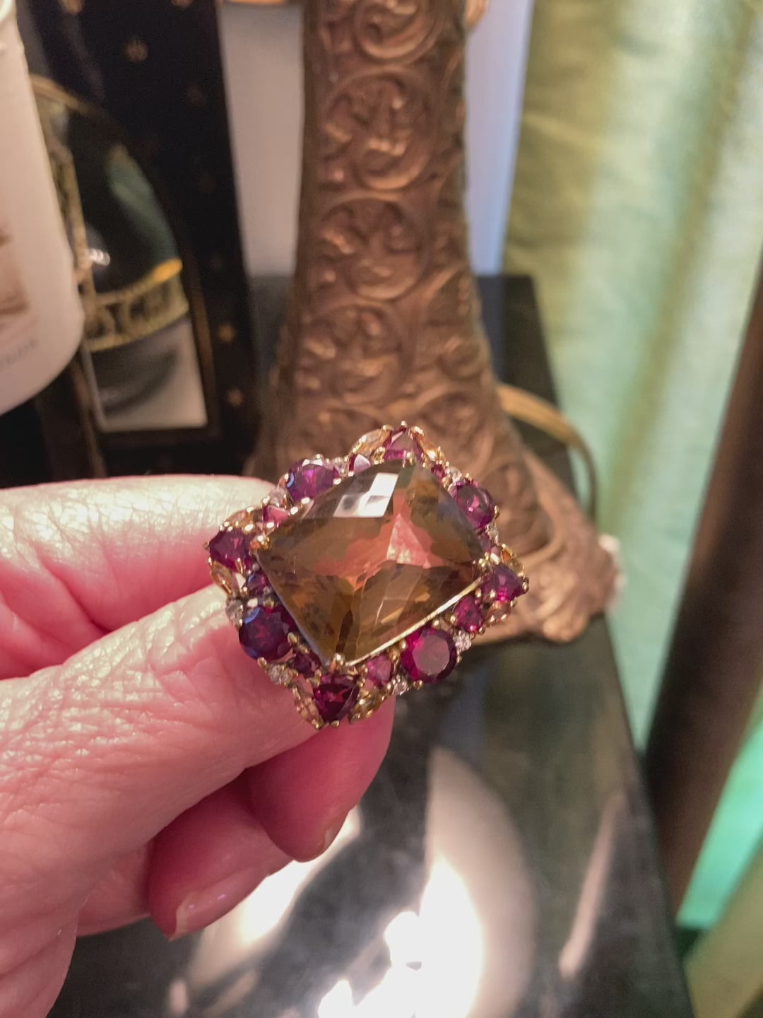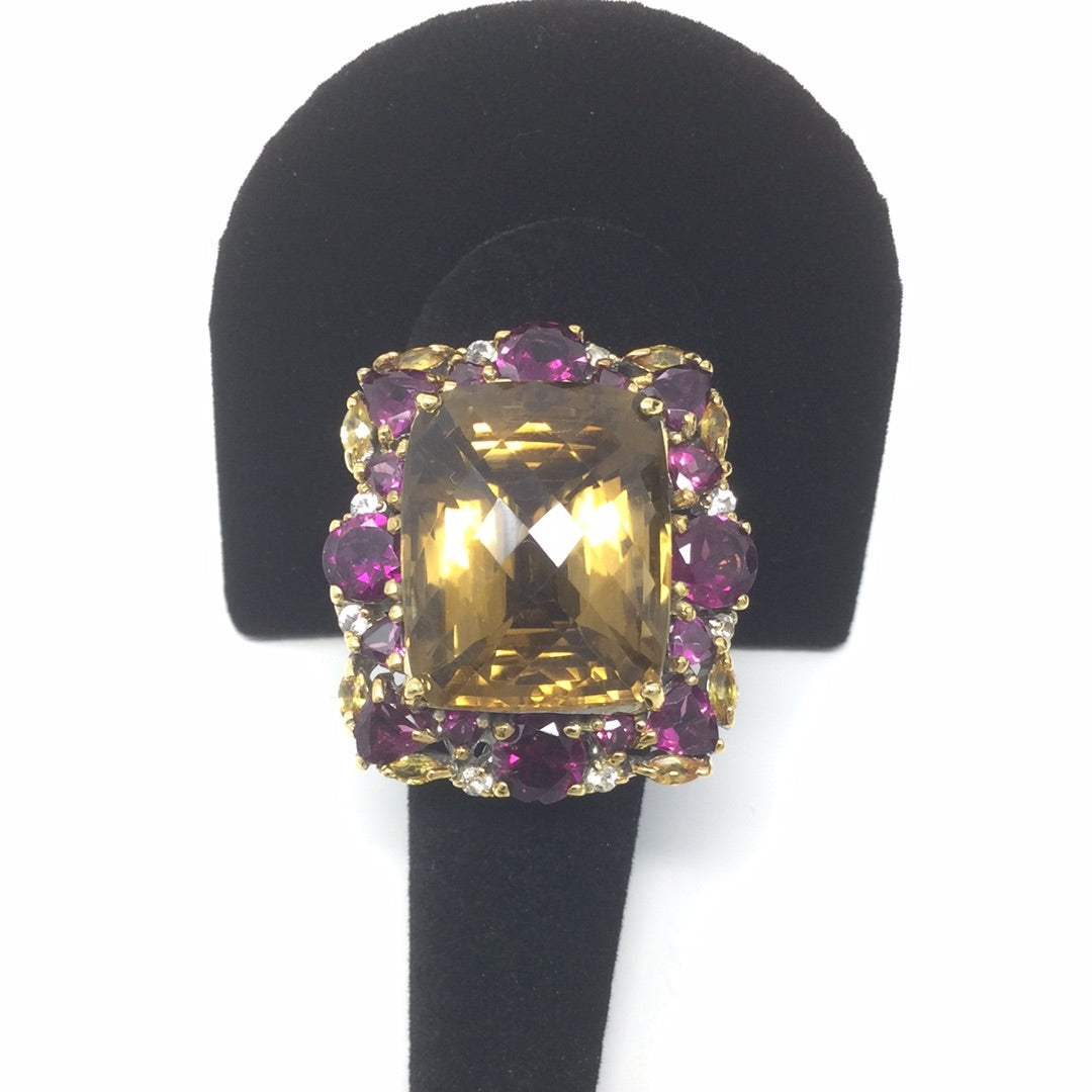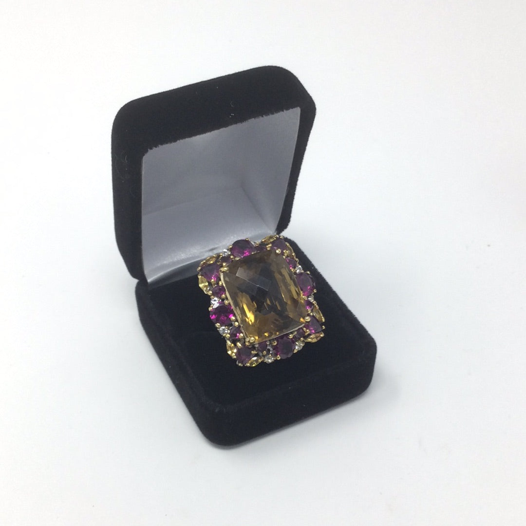 This amazing gemstone is a super high quality genuine Citrine in that very desirable checkerboard faceted cut. The light bounces off this facets is a way that is absolutely breathtaking to see in person. This ring has been custom designed for this prized gemstone, surrounded by the best genuine Pink Rhodolite and White Topaz. This is a one of a kind set in .925 with a 14K yellow gold overlay and white gold overlay on the band for durability and beauty.This ring can be your family treasure for generations to come. Always invest in custom quality pieces with high quality gemstones. Size 9 1/2, Resize at your jeweler or use a ring guard.