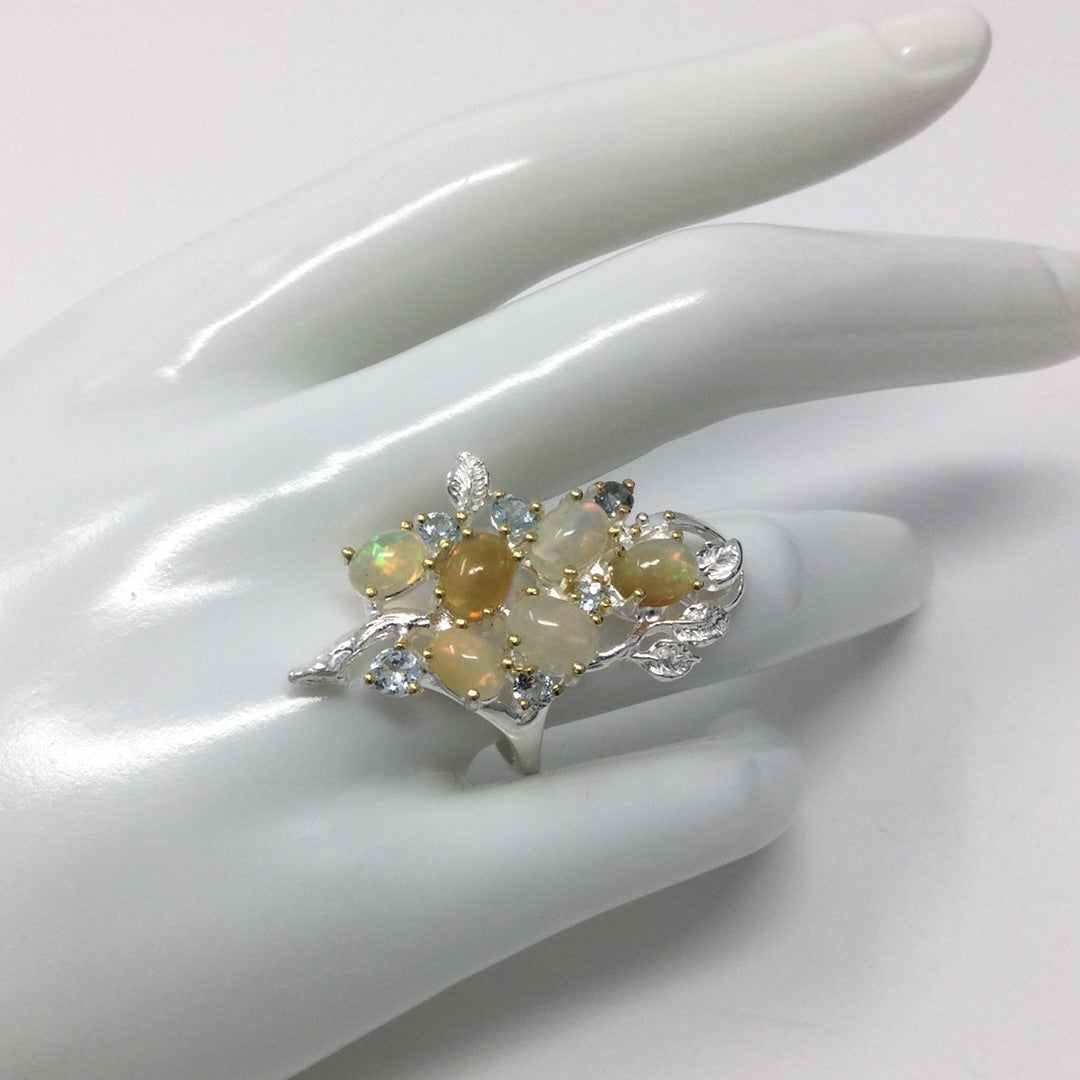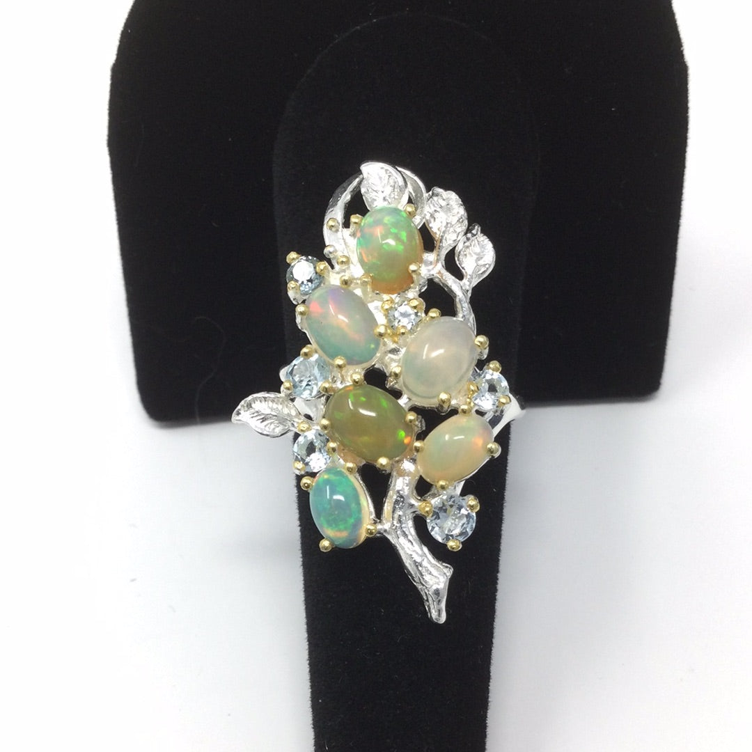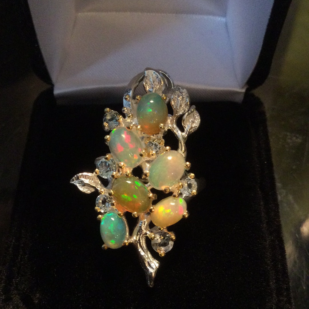 A one of a kind genuine gemstone treasure to add to your collection, Notice the great and opalescence in each Opal accented with Genuine soft blue Topaz set in a hand crafted .925 sterling silver setting wth a genuine 14K white gold overlay. A lifetime investment in genuine natural gemstones. Size 7 3/4, can be resized at your jeweler.