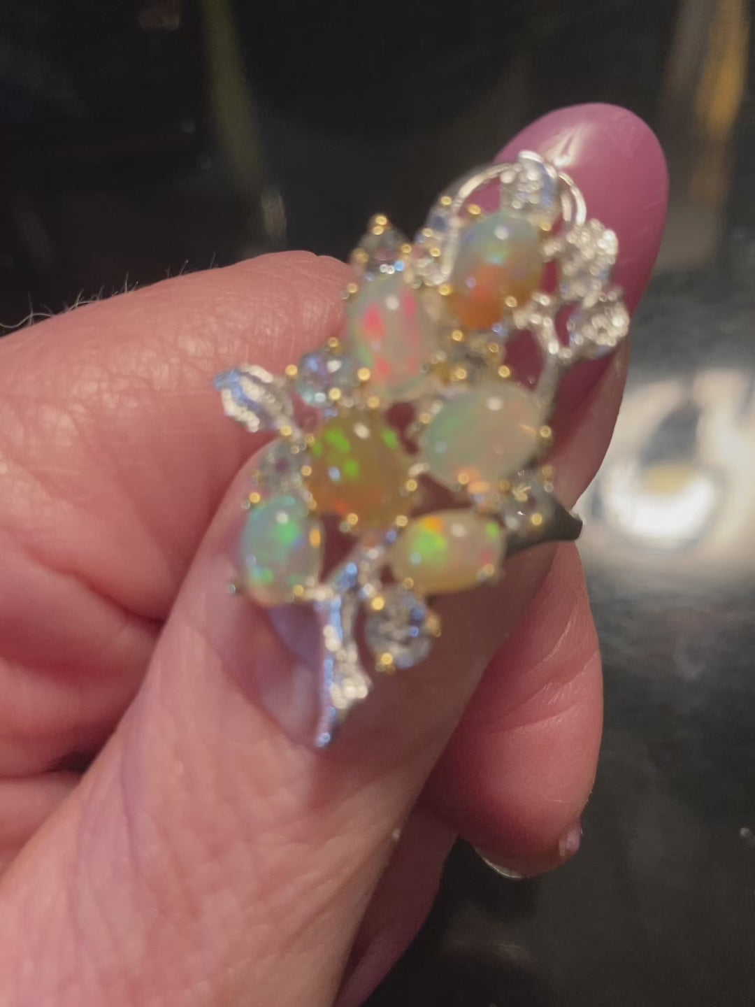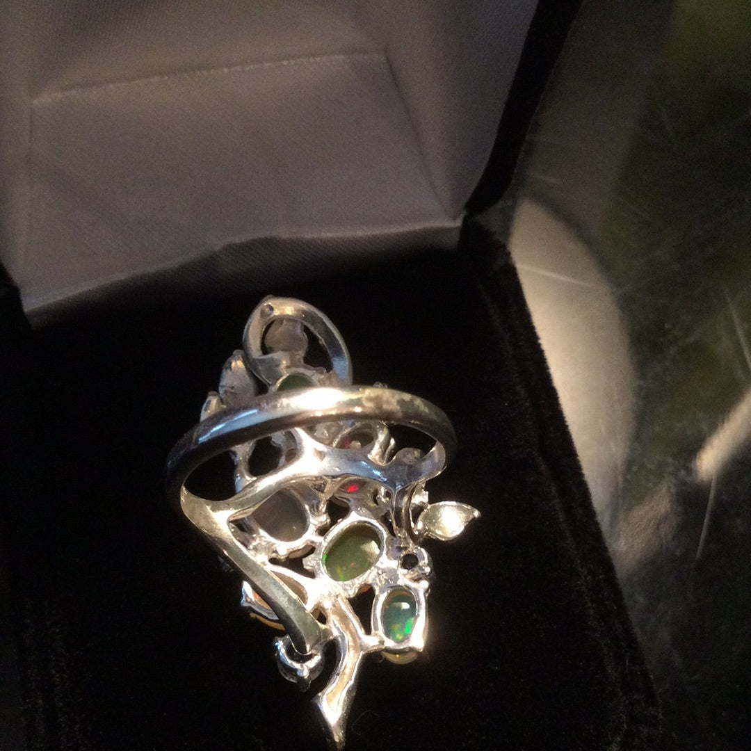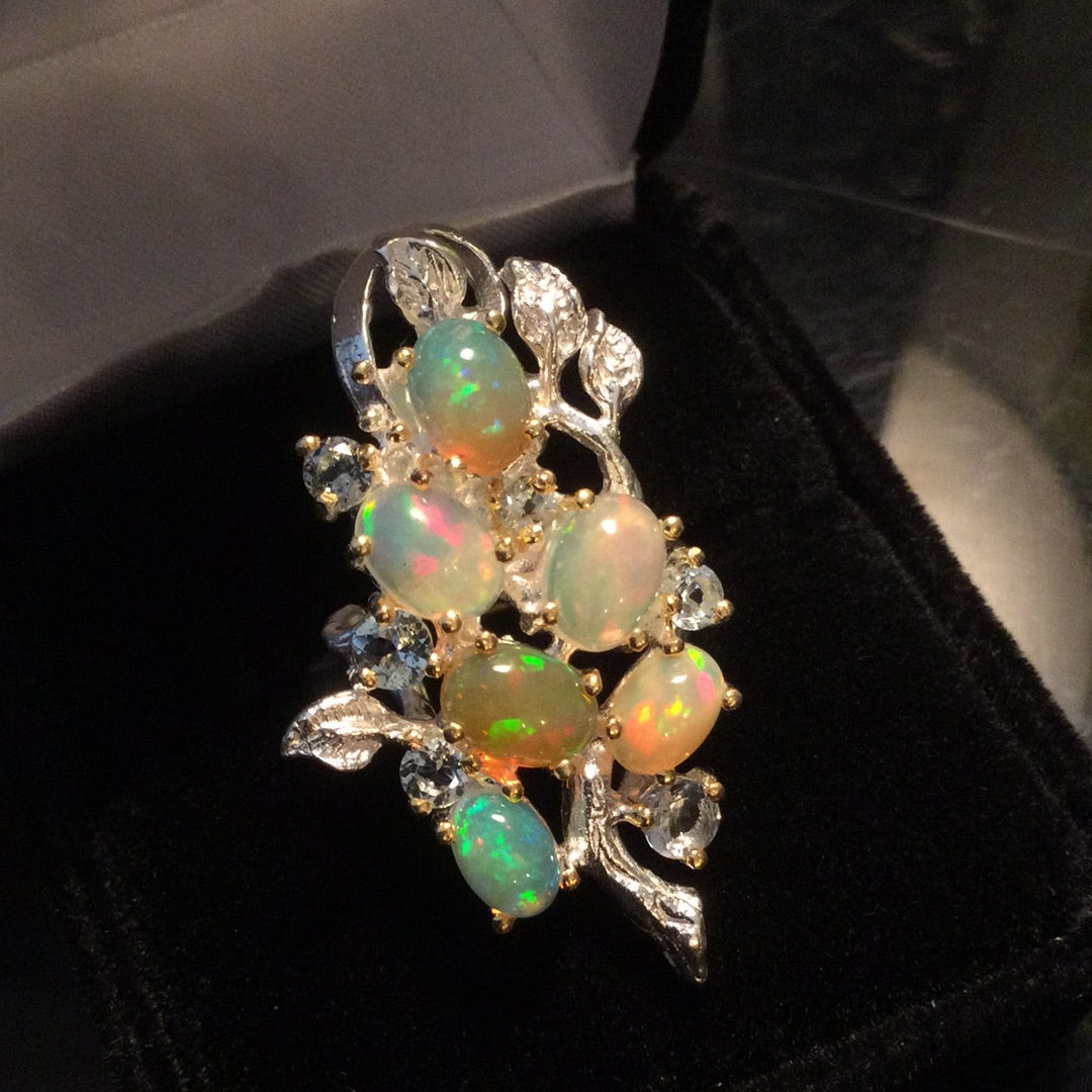 A one of a kind genuine gemstone treasure to add to your collection, Notice the great and opalescence in each Opal accented with Genuine soft blue Topaz set in a hand crafted .925 sterling silver setting wth a genuine 14K white gold overlay. A lifetime investment in genuine natural gemstones. Size 7 3/4, can be resized at your jeweler.