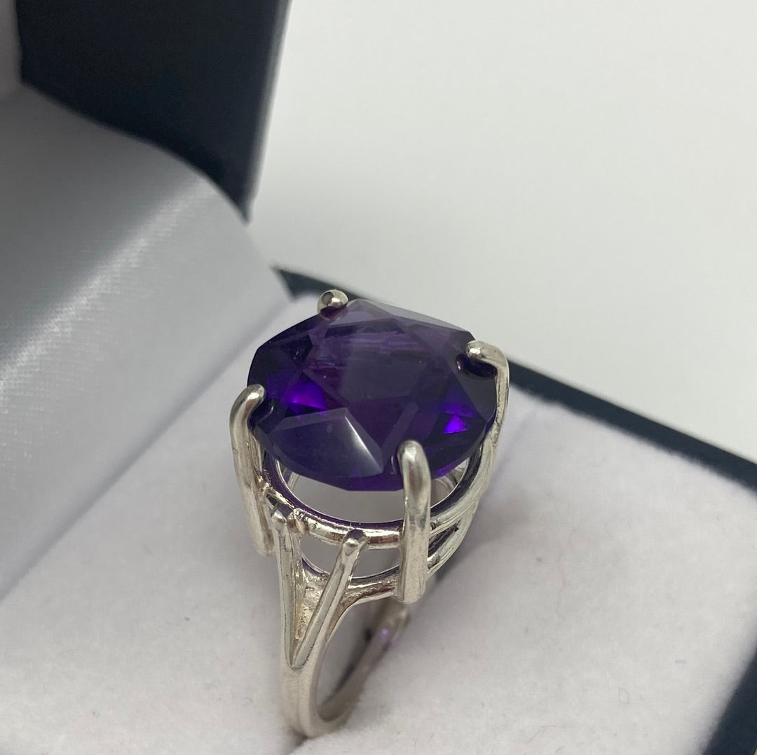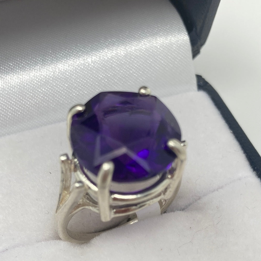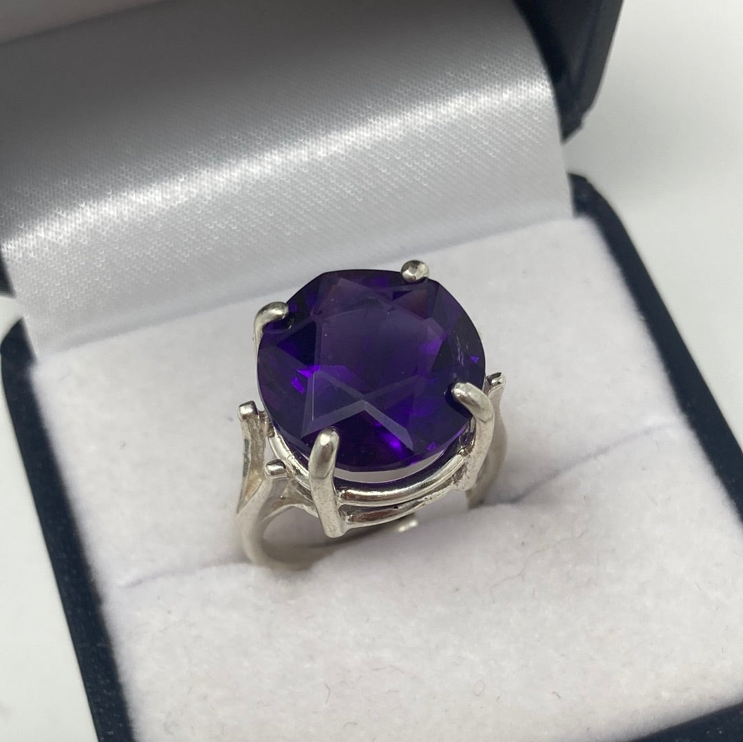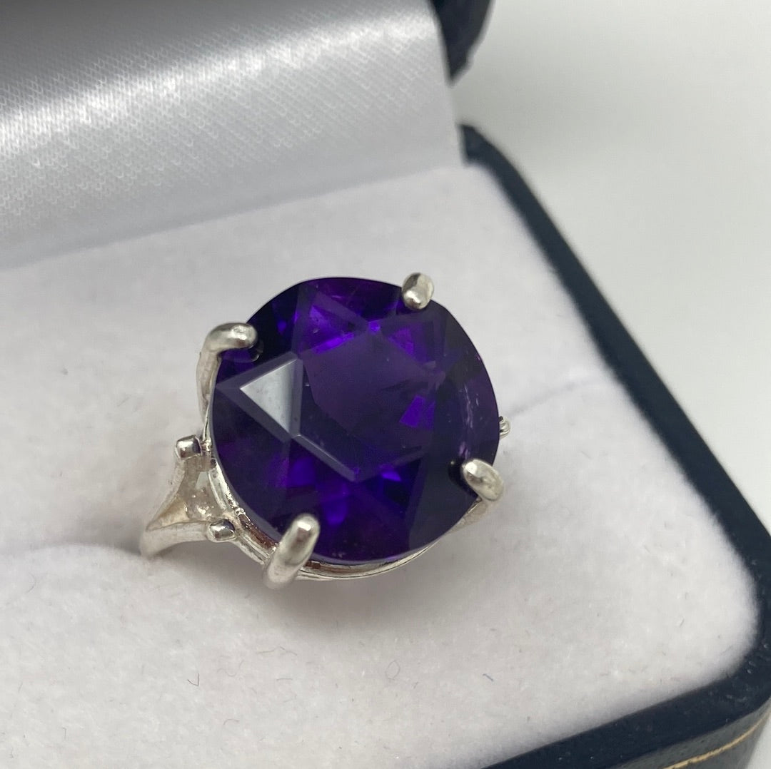 Rare Find, to find a superb Amethyst with a Star Of David impeccably etched onto the table of the gemstone. Subtle elegance, to wear a star upon your finger. We don’t have to wish upon a star, we can wear the star. Notice the nice deep secure basket setting. Approximately 15mm round, top quality rich deep purple Amethyst, set in .925 Sterling Silver. Size 7, Resize at your jeweler or use a ring guard
