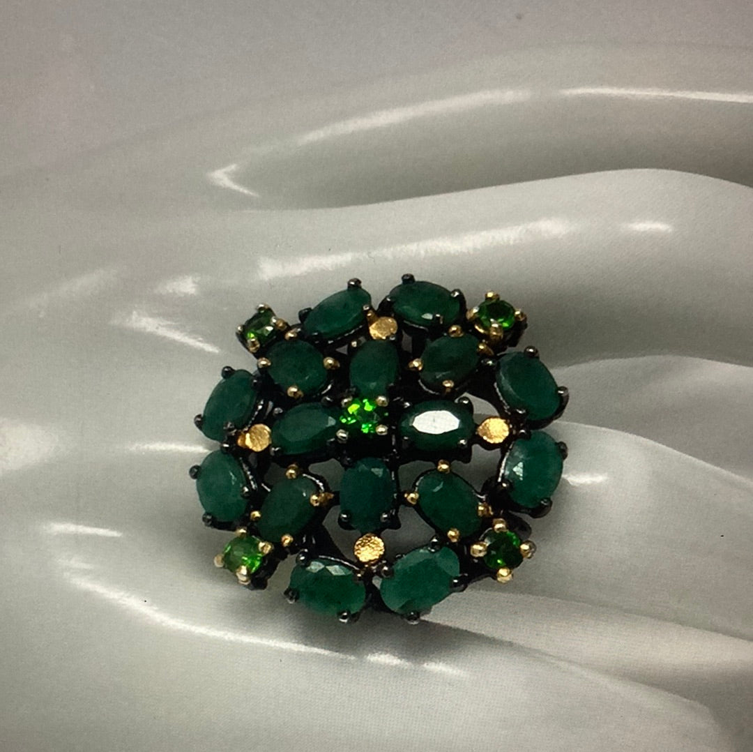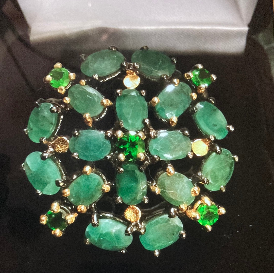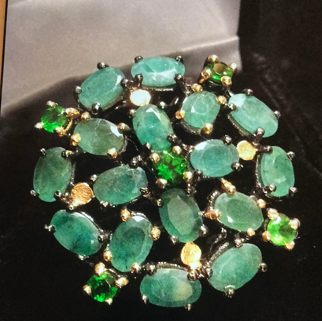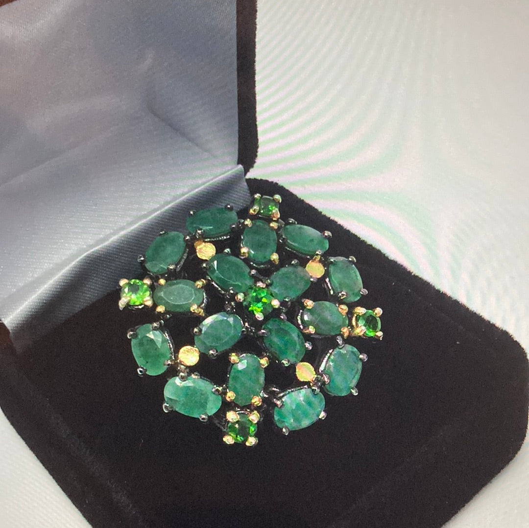 This magnificent genuine Emerald ring is breathtaking, a one of a kind masterpiece from the artisans at The Atlanta Gem & Mineral Show. Interspersed with genuine Russian Chrome Diopside, set in .925 sterling silver with a Rhodium finish for durability and beauty, Wn this future heirloom, invest n genuine gemstones. Size 7, Resize at your jeweler,