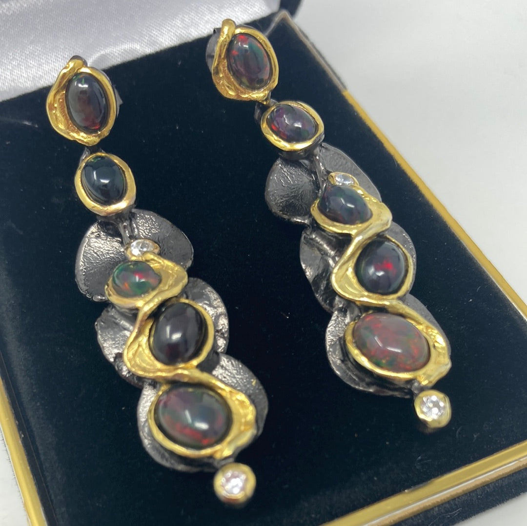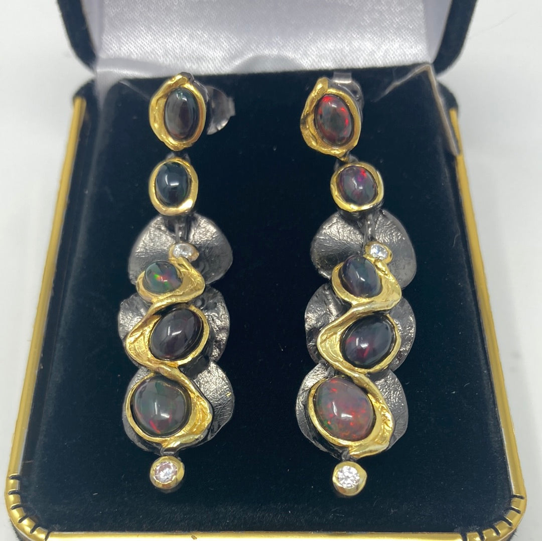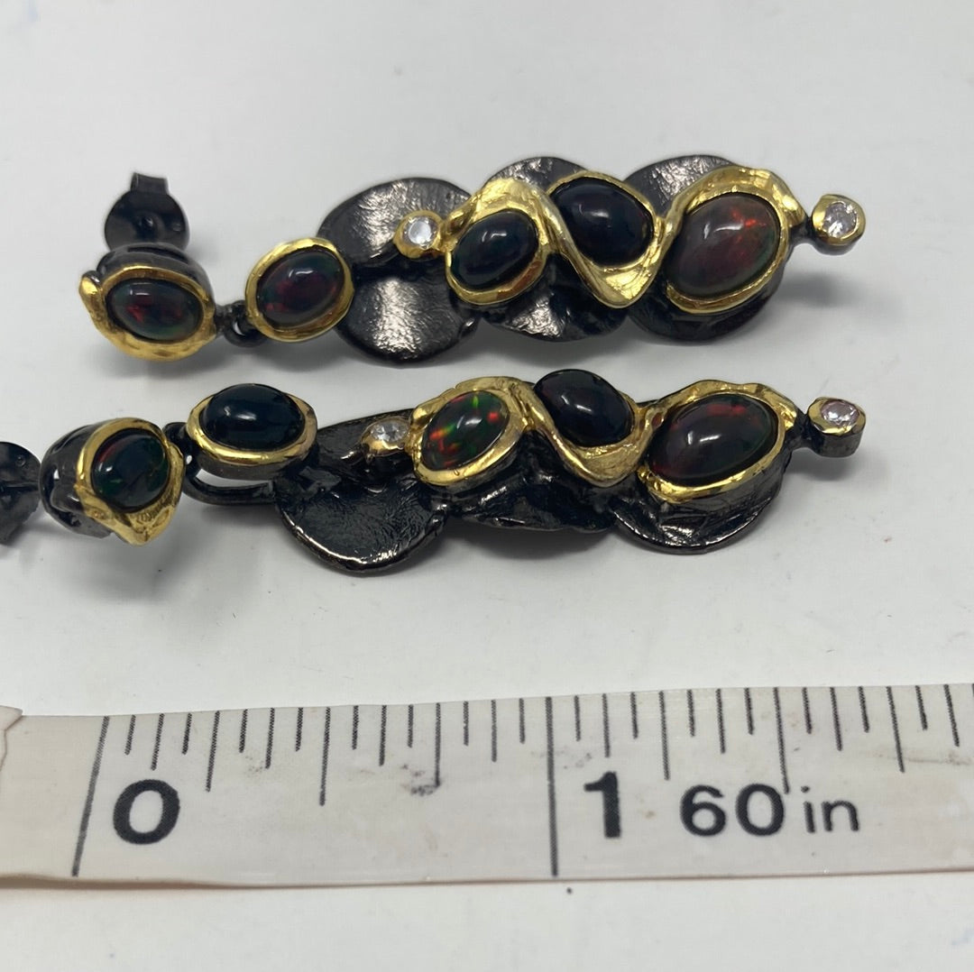 As unique as you are these fabulous genuine Black Opal Earrings are mesmerizing and the most alluring way to frame your face in luminescence. Each gemstone is hand selected for its unique, individual beauty and inner fire. Set in .925 sterling silver with a Rhodium overlay. These are great investment pieces for your lifetime heirloom, jewelry collection. More gorgeous in person! Approximately 1 3/4” Long.