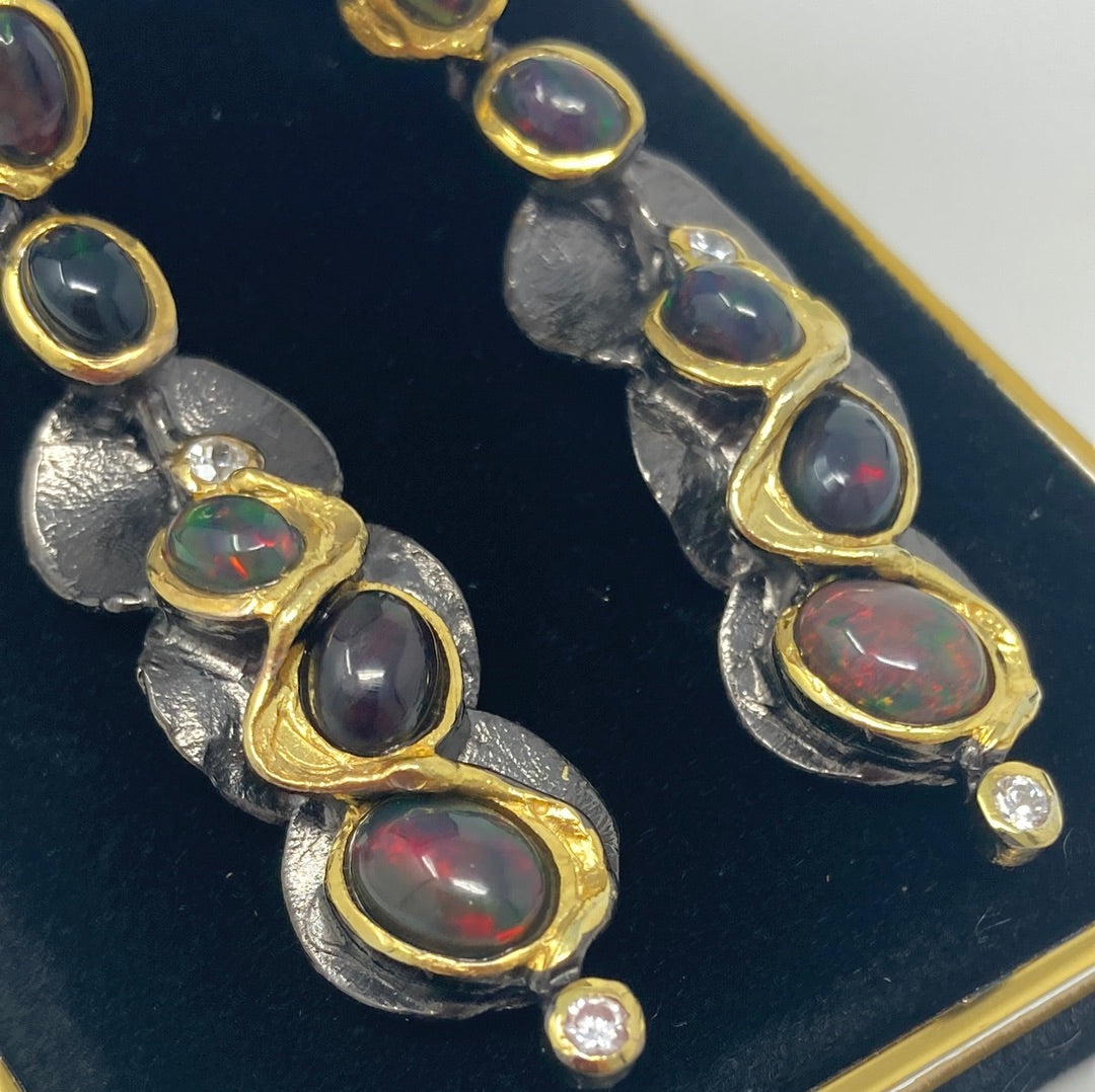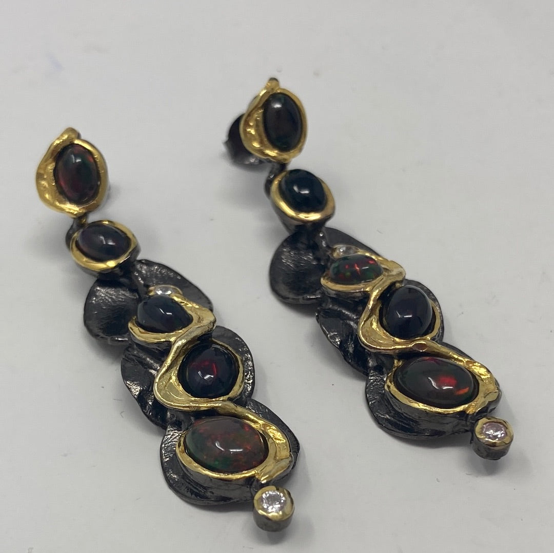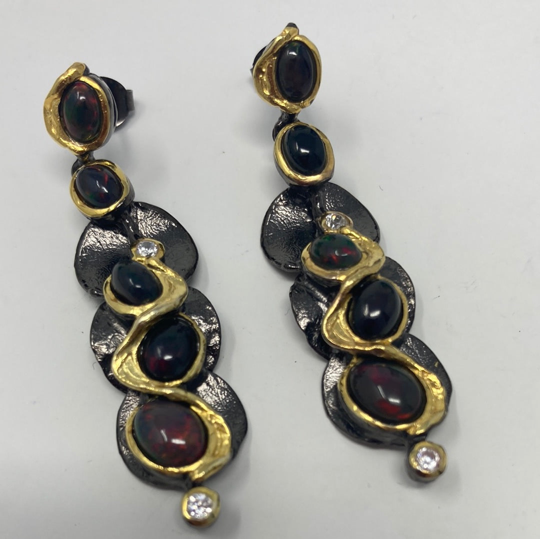 As unique as you are these fabulous genuine Black Opal Earrings are mesmerizing and the most alluring way to frame your face in luminescence. Each gemstone is hand selected for its unique, individual beauty and inner fire. Set in .925 sterling silver with a Rhodium overlay. These are great investment pieces for your lifetime heirloom, jewelry collection. More gorgeous in person! Approximately 1 3/4” Long.