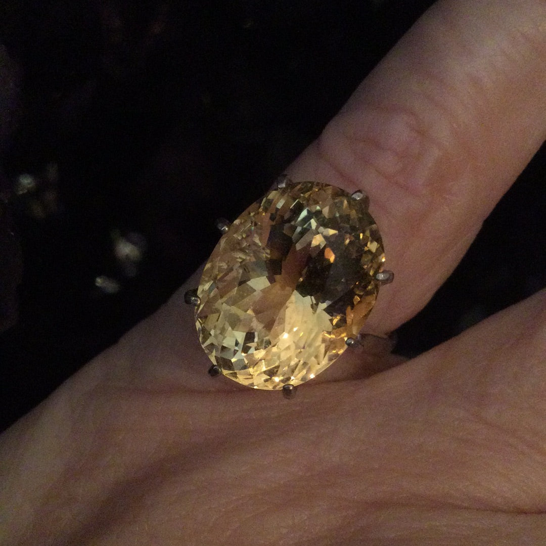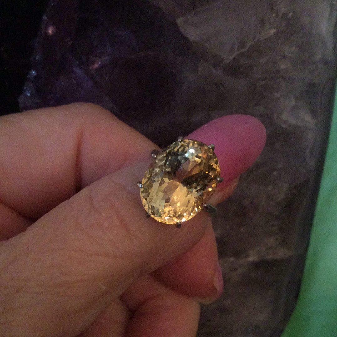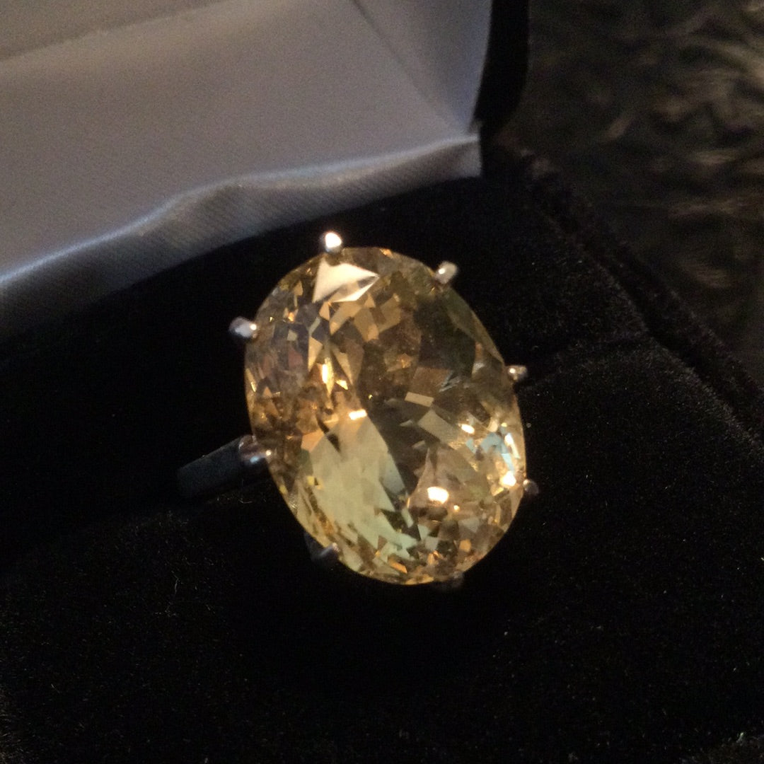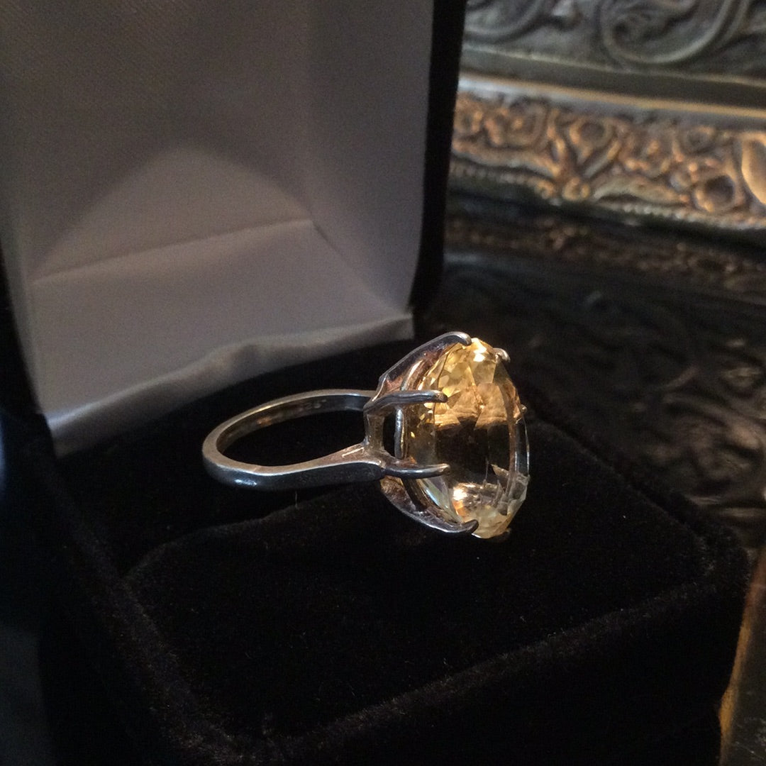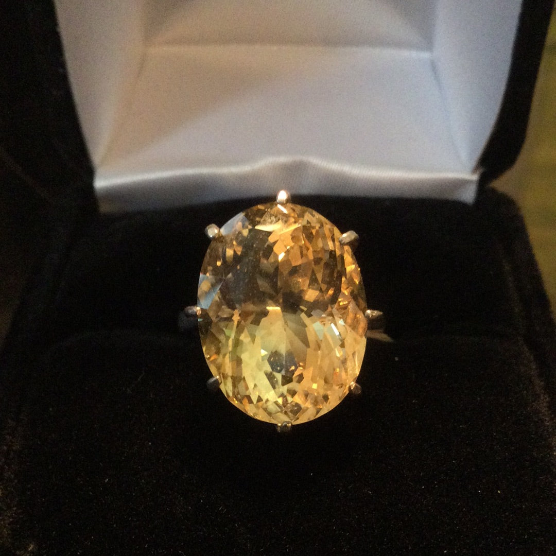 A color explosion of sunshine that emits rays of positivity and hope in the fabulous genuine gemstone. The outstanding faceting draws you into to a splendor of glowing sparkle. Approximately 14CTW in this magnificent stone set in a classic .925 sterling silver basket setting. Notice the depth of this special gemstone, it has it all, cut, color & clarity. Size 5, resize at your jeweler.