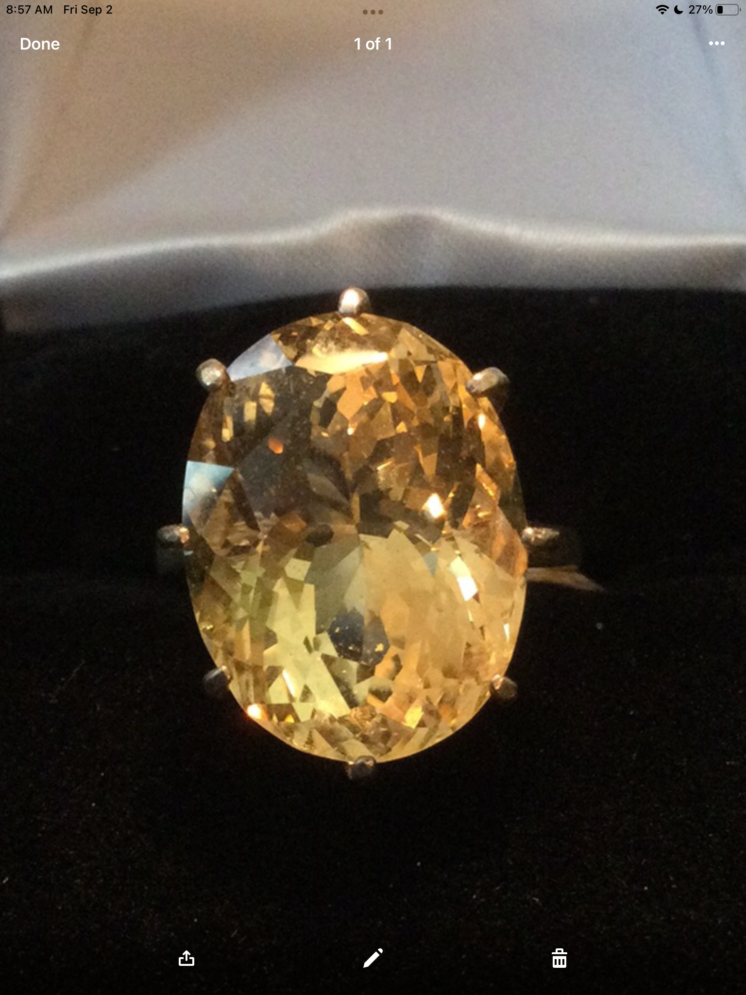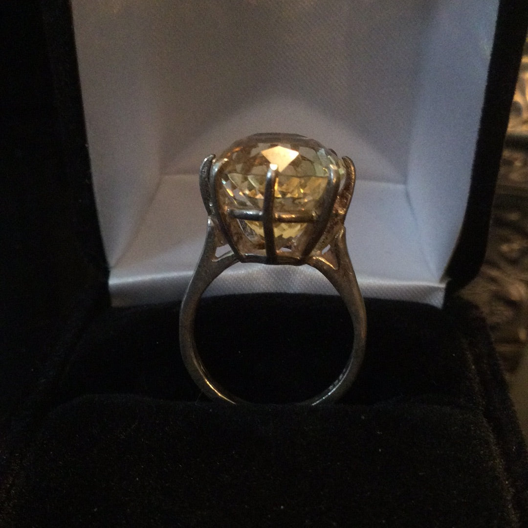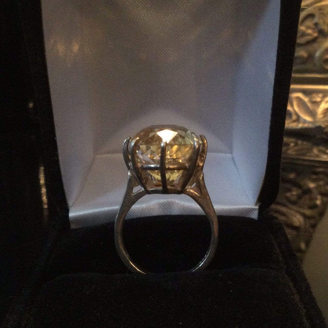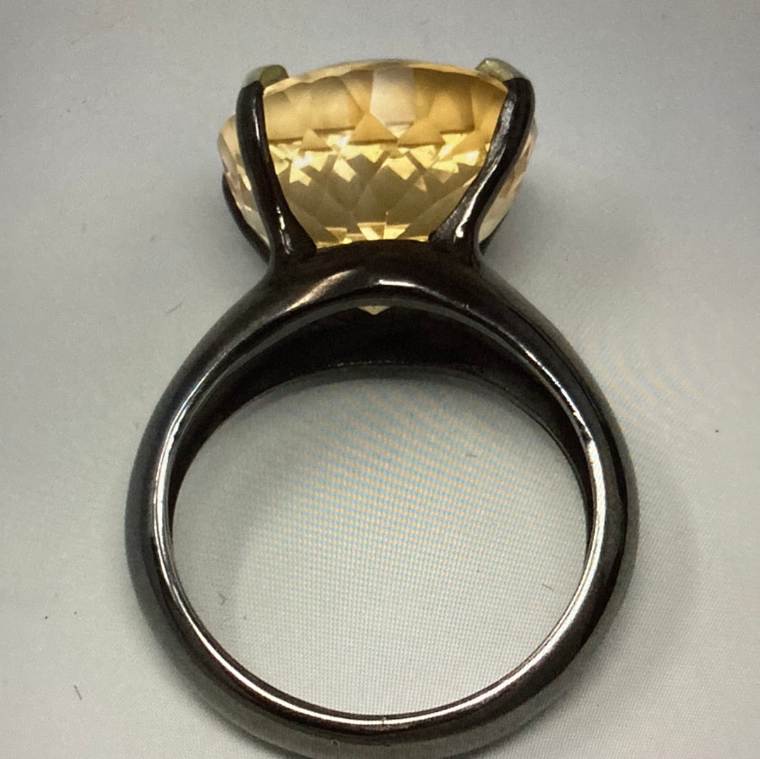 A color explosion of sunshine that emits rays of positivity and hope in the fabulous genuine gemstone. The outstanding faceting draws you into to a splendor of glowing sparkle. Approximately 14CTW in this magnificent stone set in a classic .925 sterling silver basket setting. Notice the depth of this special gemstone, it has it all, cut, color & clarity. Size 5, resize at your jeweler.