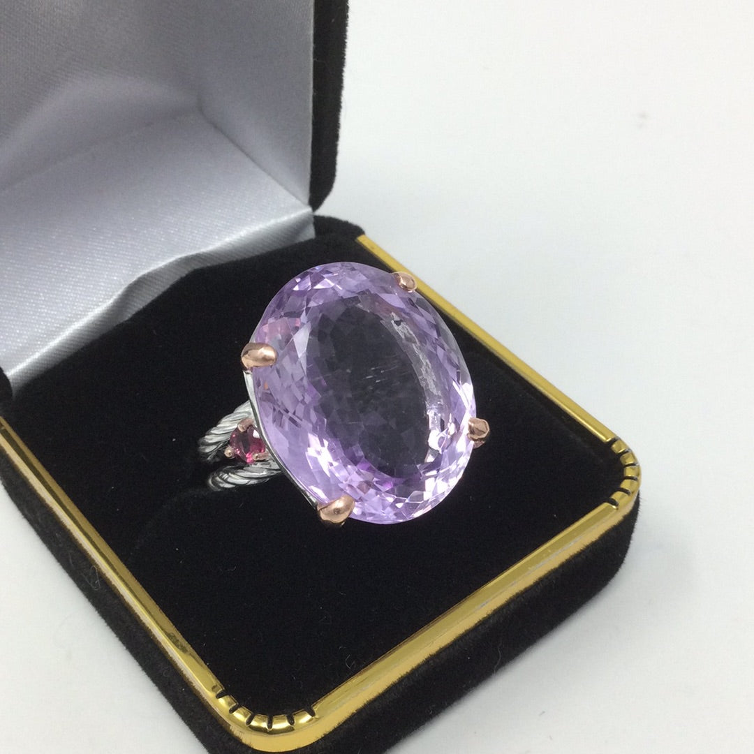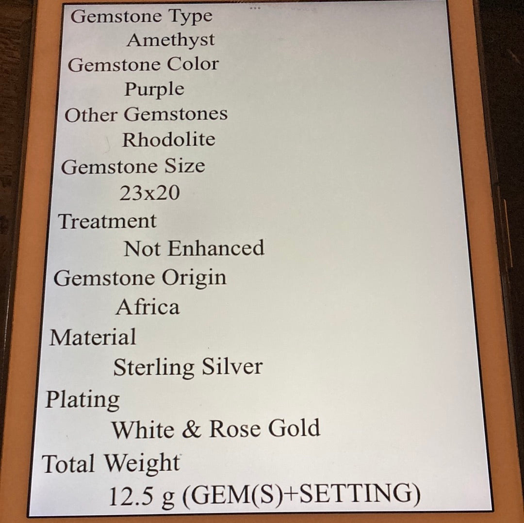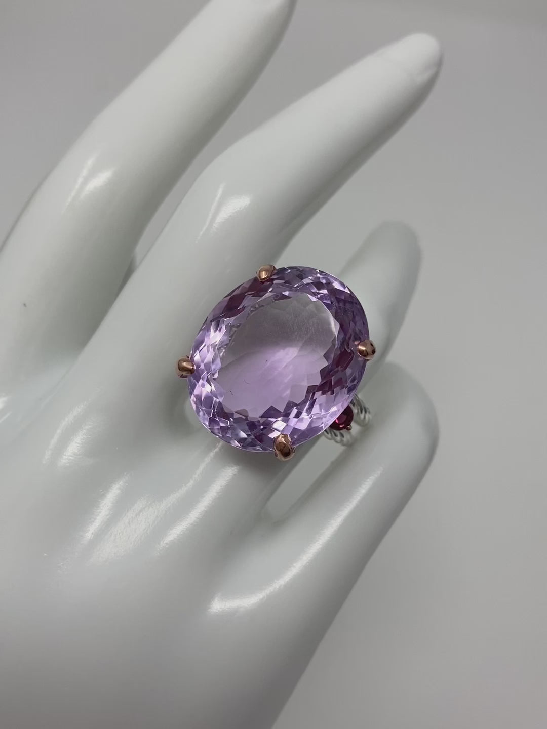 An extra special Amethyst from Africa in this very desirable crystalline lavender that is just a precious unusual color. The size is remarkable, 35 CTW, this is a find, a one of a kind artistically crafted work of art for your hand. Set in .925 sterling silver with a 14K white gold overlay kissed with accents of rose gold too. A once in a lifetime opportunity to be able to acquire this natural gemstone for your personal collection of genuine gemstones. Size 8, Resize at your jeweler or use a ringguard.