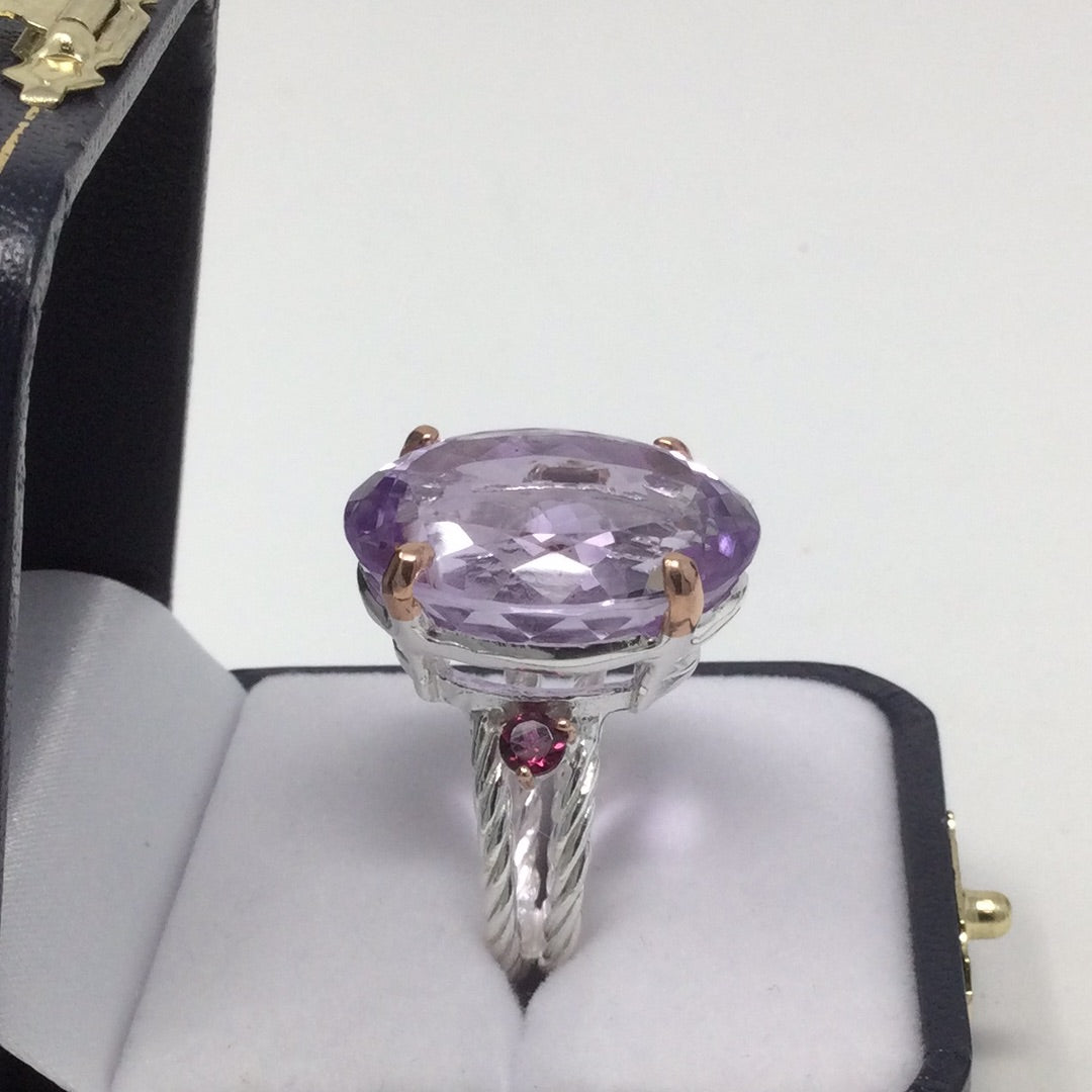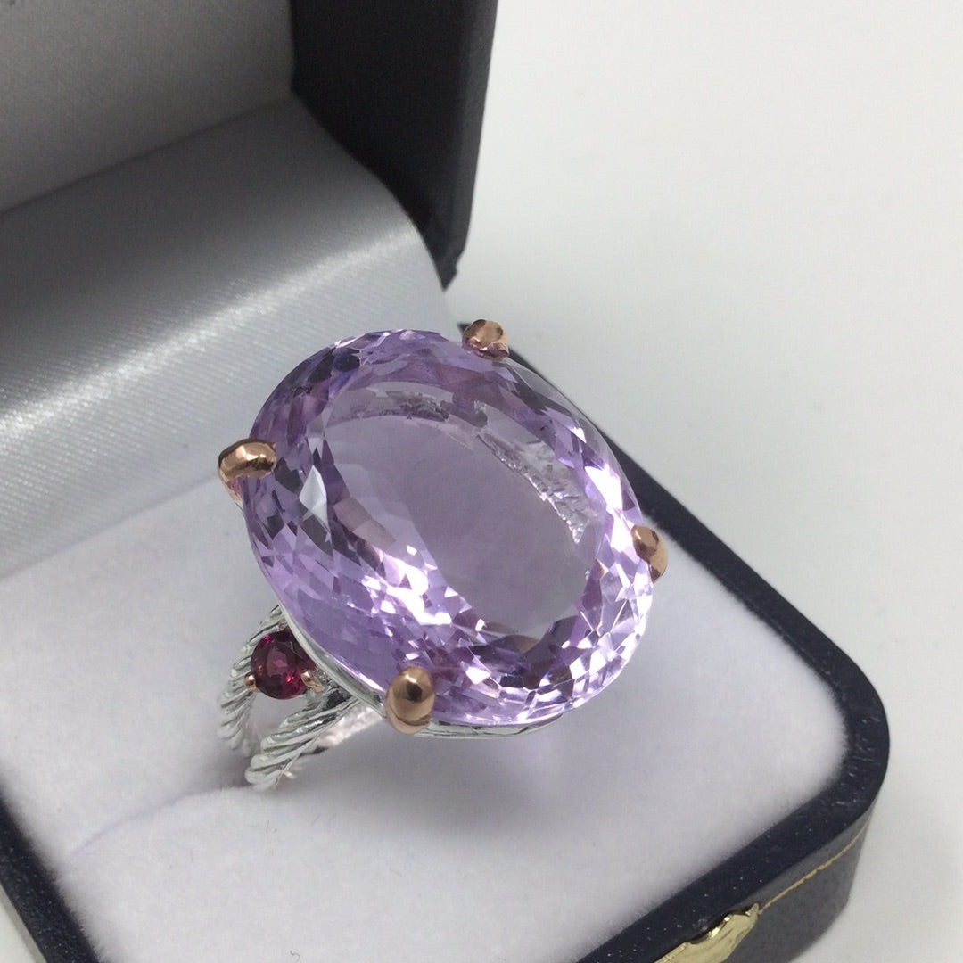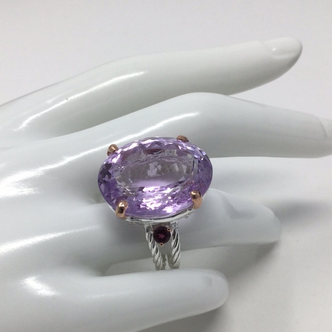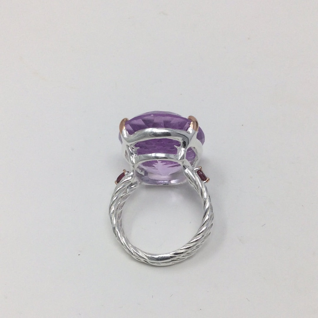 An extra special Amethyst from Africa in this very desirable crystalline lavender that is just a precious unusual color. The size is remarkable, 35 CTW, this is a find, a one of a kind artistically crafted work of art for your hand. Set in .925 sterling silver with a 14K white gold overlay kissed with accents of rose gold too. A once in a lifetime opportunity to be able to acquire this natural gemstone for your personal collection of genuine gemstones. Size 8, Resize at your jeweler or use a ringguard.