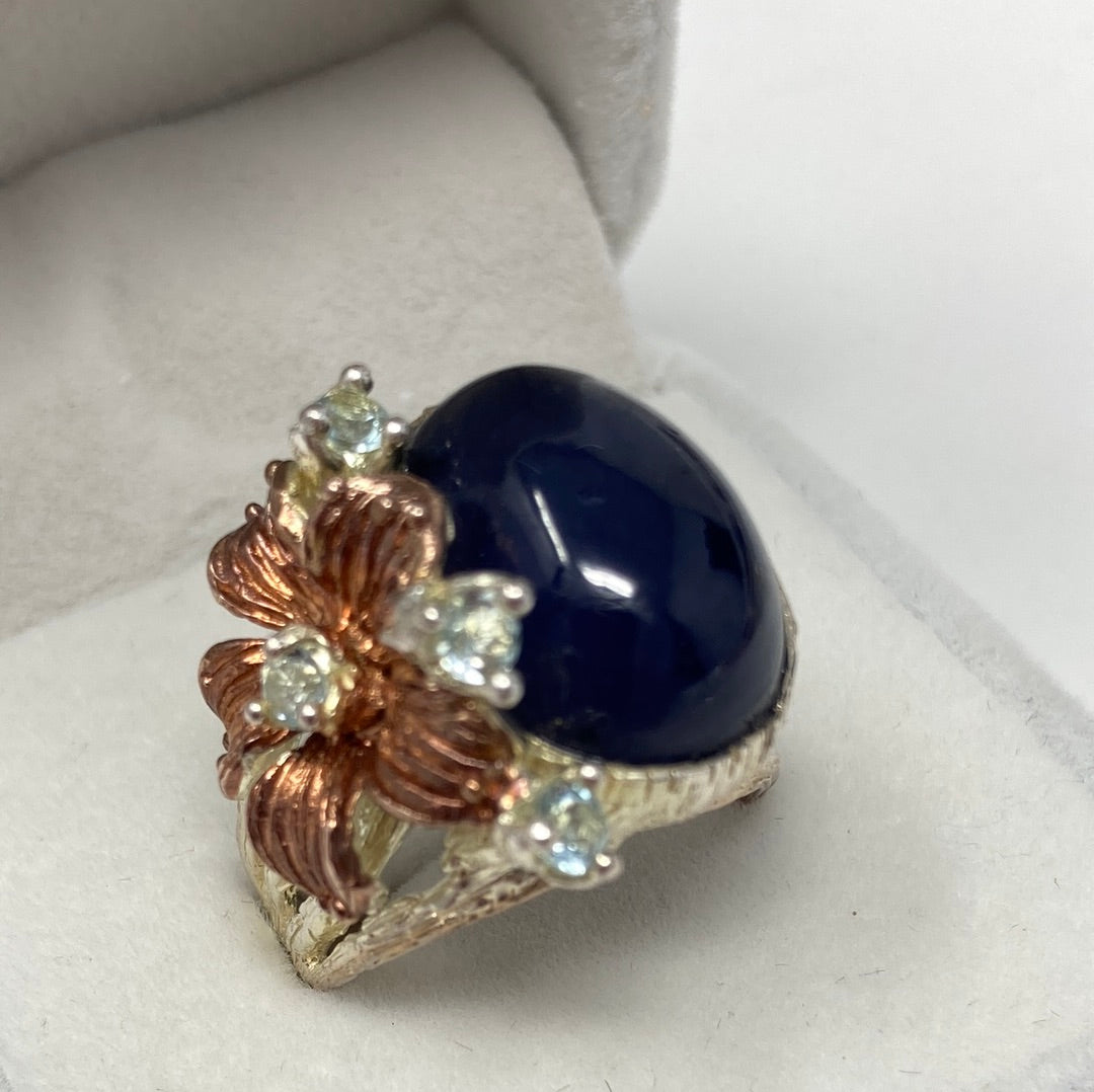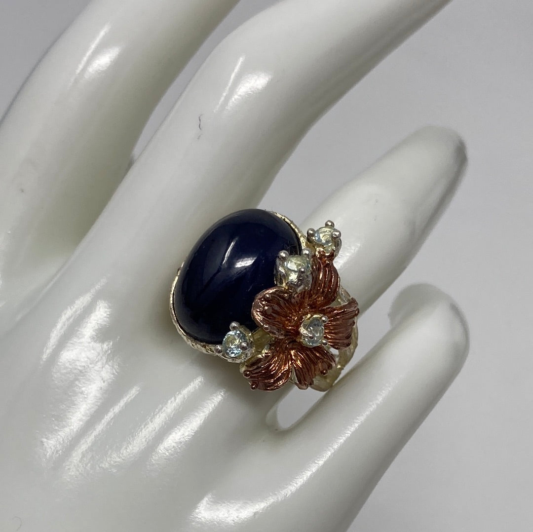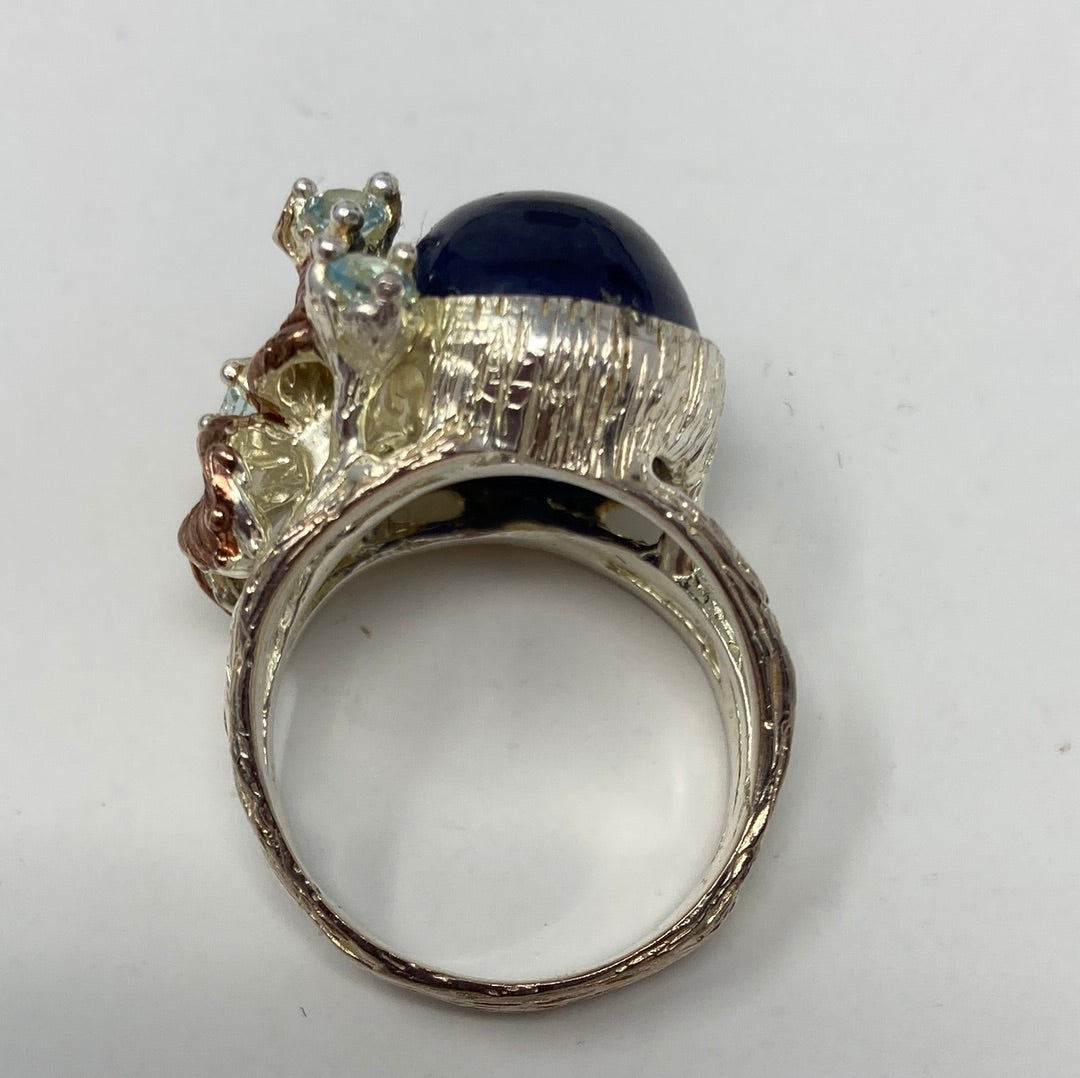 This is a fabulous genuine Sapphire that measures in at approx 18mm by 13mm in a deep dark blue. It is accented with dainty Blue Topaz, set in .925 Sterling Silver with Rose Gold accents. Notice the intricate styling, a one of a kind custom made artistic piece. This is an exceptional treasure and a highly desirable genuine gemstone in this size. Size 7 1/2, Resize at your jeweler or use a ring guard.
