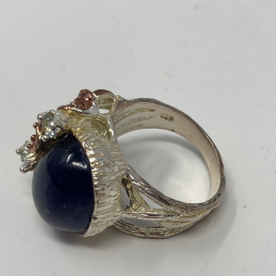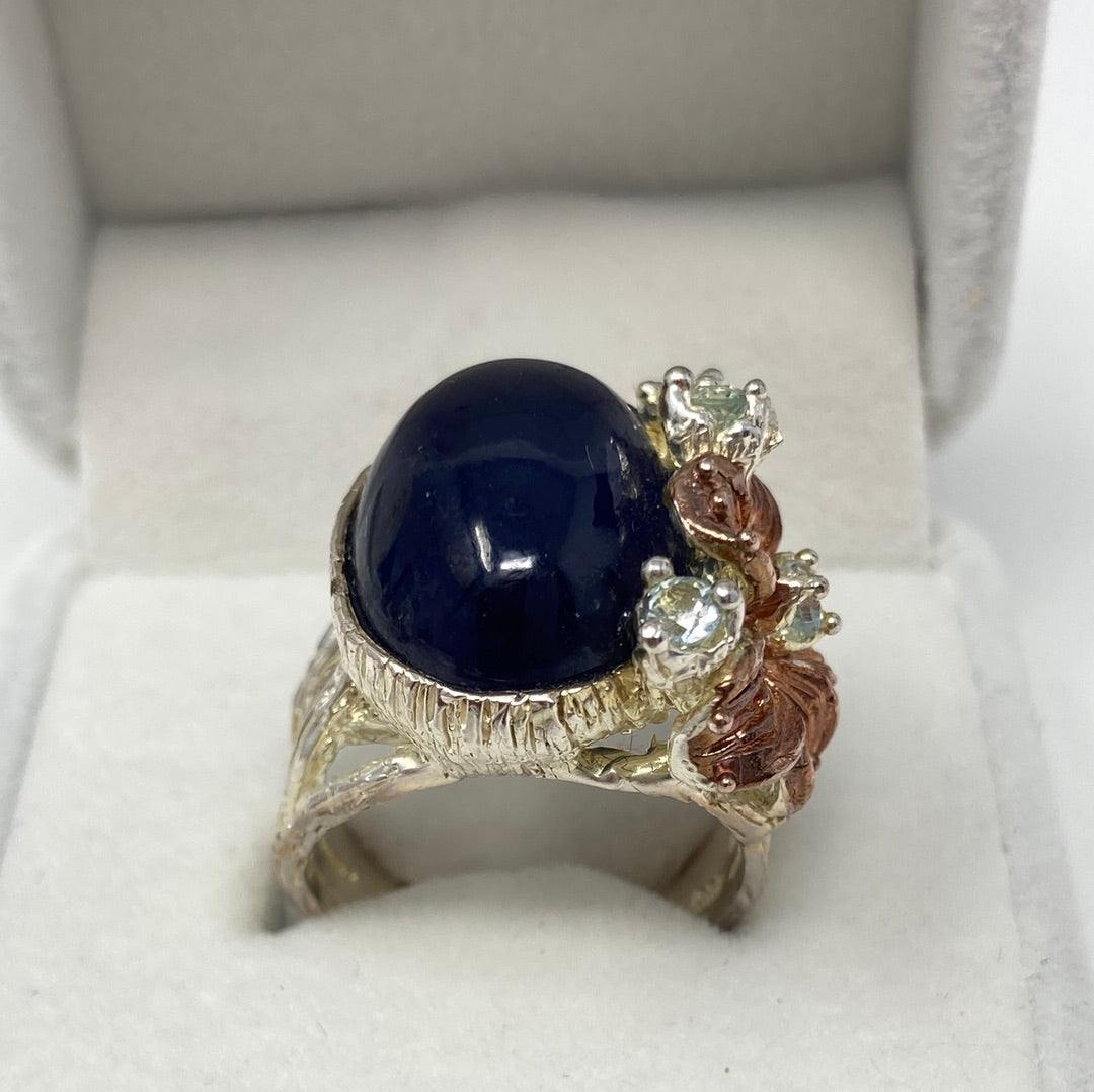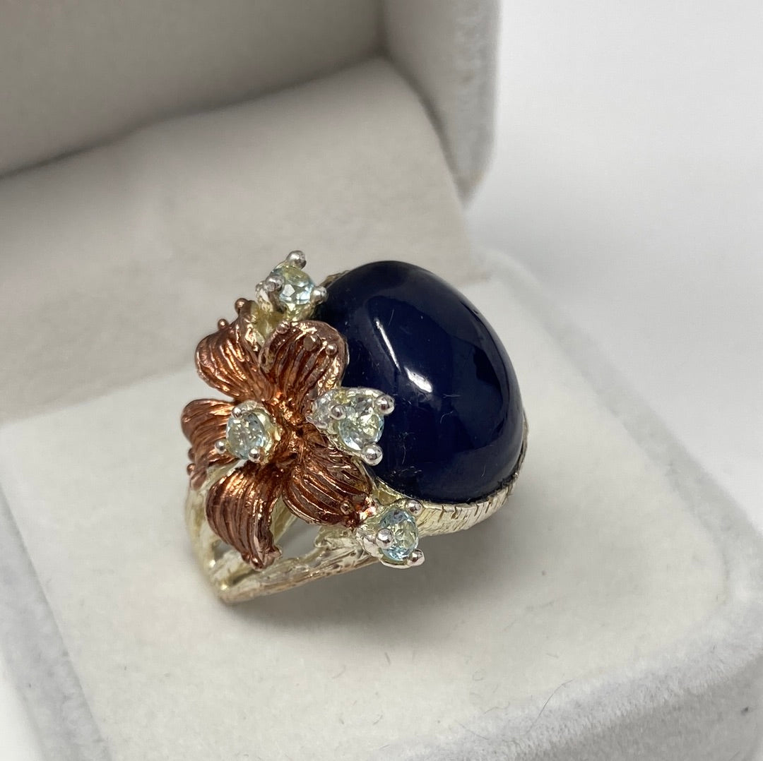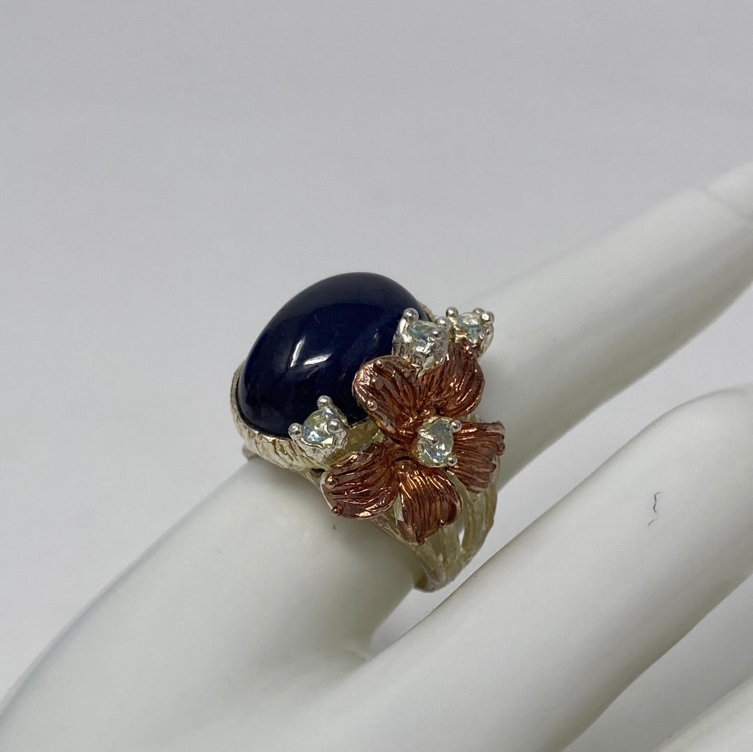 This is a fabulous genuine Sapphire that measures in at approx 18mm by 13mm in a deep dark blue. It is accented with dainty Blue Topaz, set in .925 Sterling Silver with Rose Gold accents. Notice the intricate styling, a one of a kind custom made artistic piece. This is an exceptional treasure and a highly desirable genuine gemstone in this size. Size 7 1/2, Resize at your jeweler or use a ring guard.