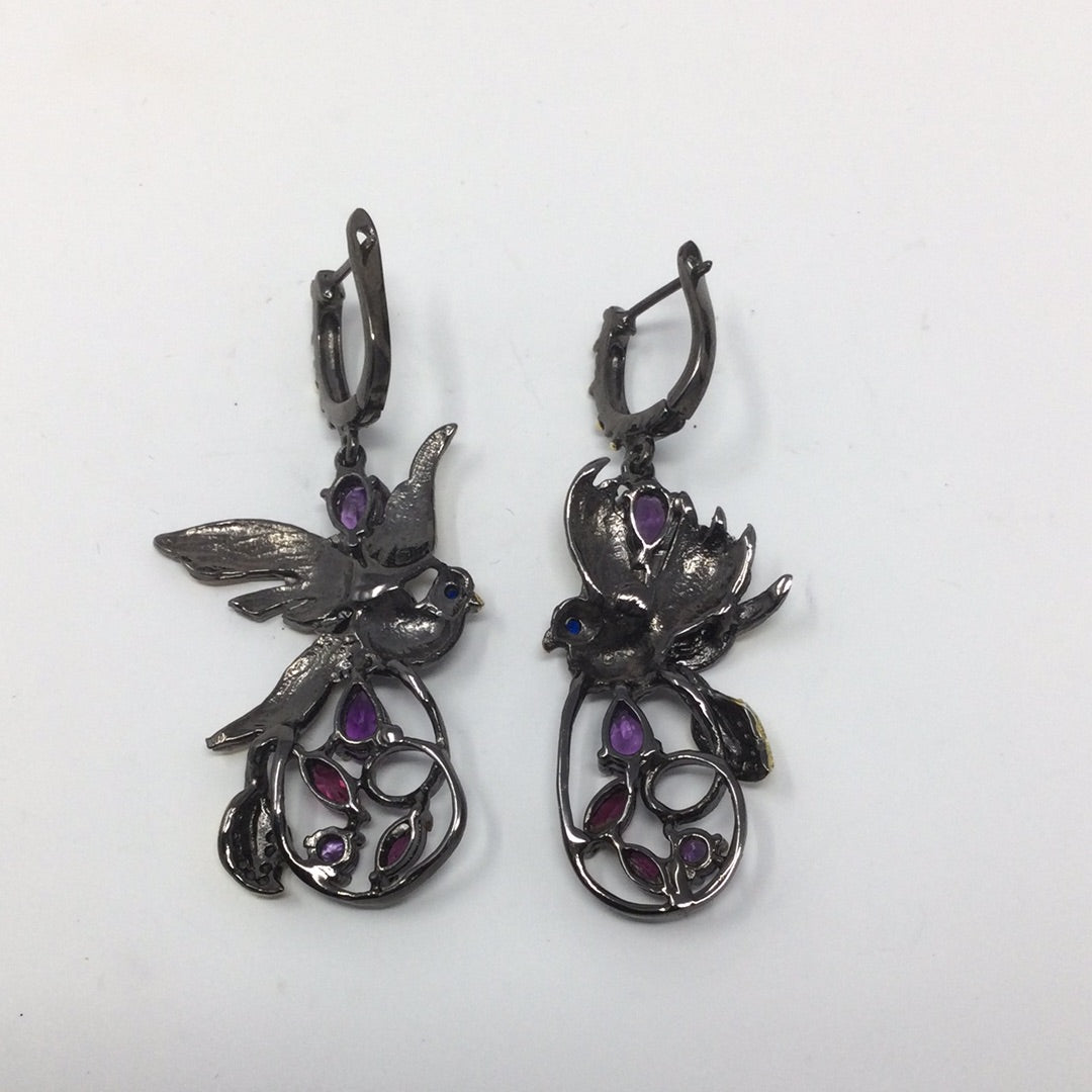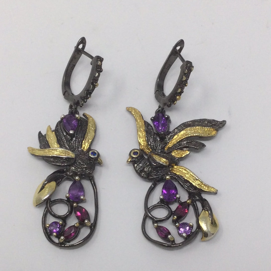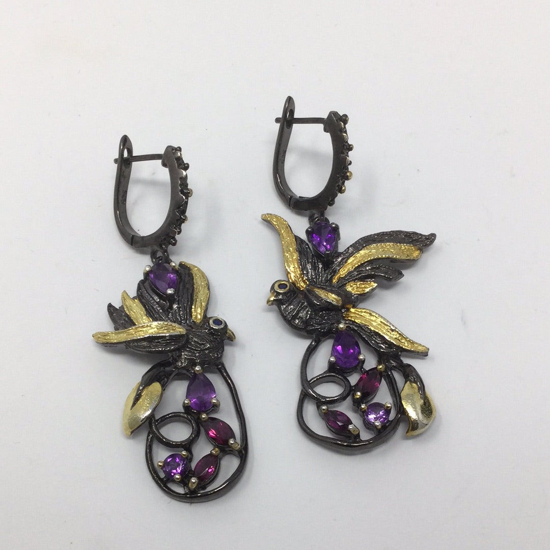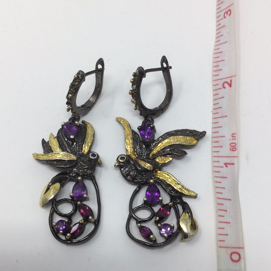 The craftsmanship that goes into these special earrings is just artistic talent at its finest. All sterling silver, .925 with Rhodium & embellished with14K yellow gold accents. Intricate detailed design featuring genuine Amethysts & Garnets, notice the pear shaped & marquee faceted gemstones. Approximately 1 3/4” Long.