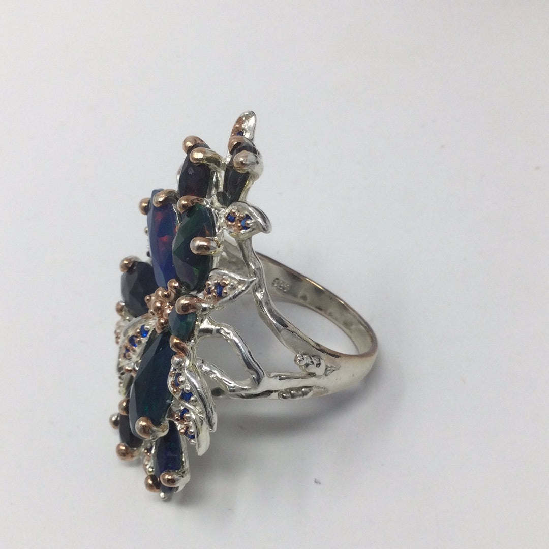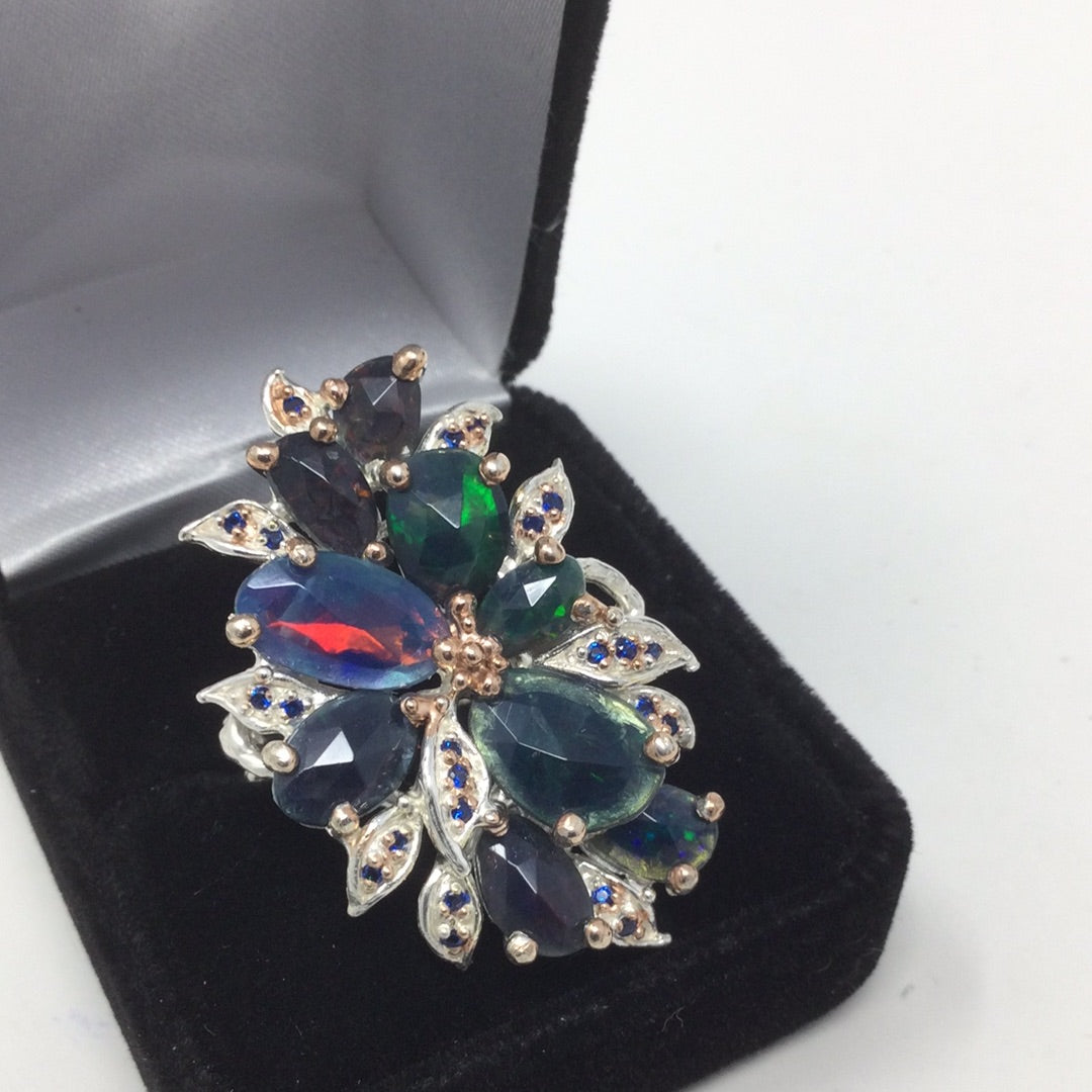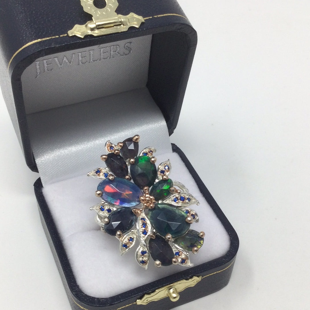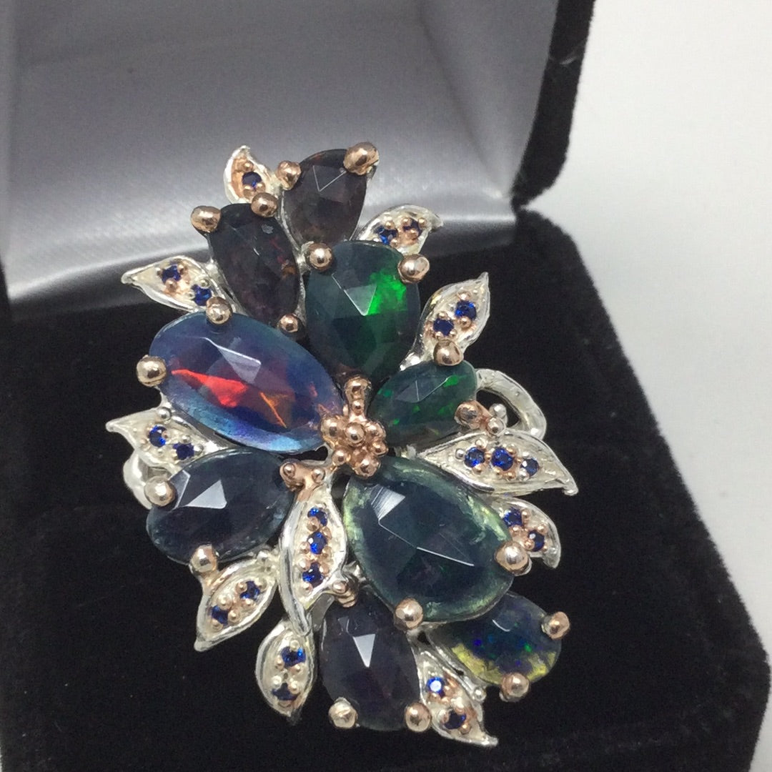 The finest celestial rare Black Opal's, unbelievably magnificent, notice how they are faceted! Accented with genuine Sapphires, this ring will be a heirloom treasure in your family from generation to generation. Seldom you find faceted Opals, especially the mysterious highly acclaimed black ones. It’s even more beautiful in person. Hard to part with this treasure. Set in .925 sterling silver with a 14K white gold overlay with yellow gold accents n the prongs and in centerpiece. This is a one of a kind custom made work of art on genuine gemstones. Opals vary in sizes, each stone is unique hand selected for its beauty and color dispersion. Largest stone measures approximately 10mm by 8mm. Size 9, Resize at your jeweler or use a ring guard.