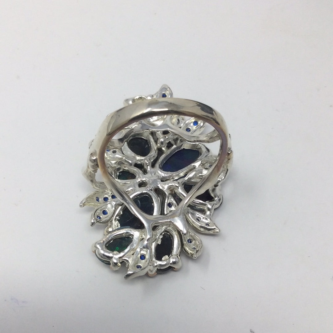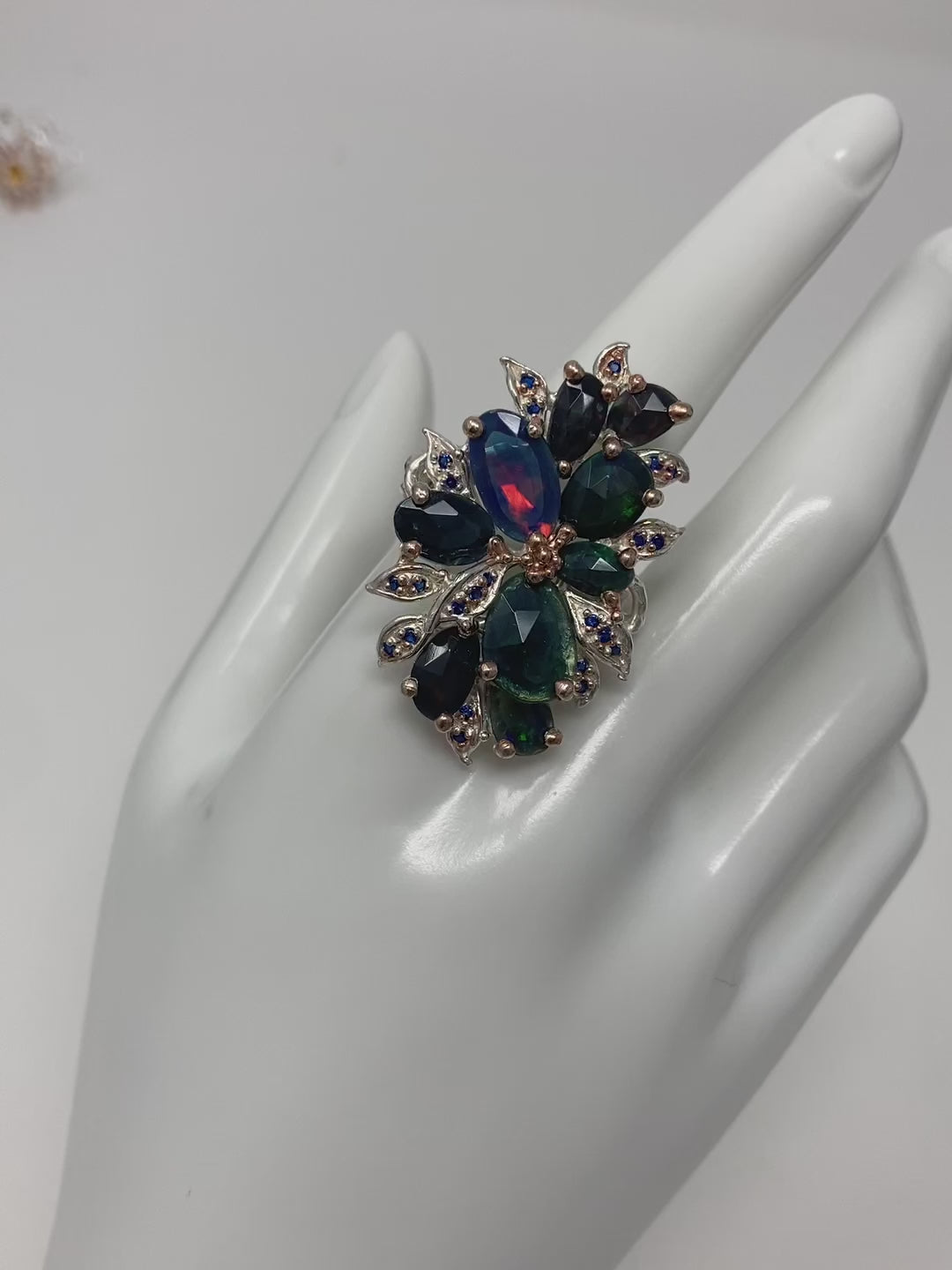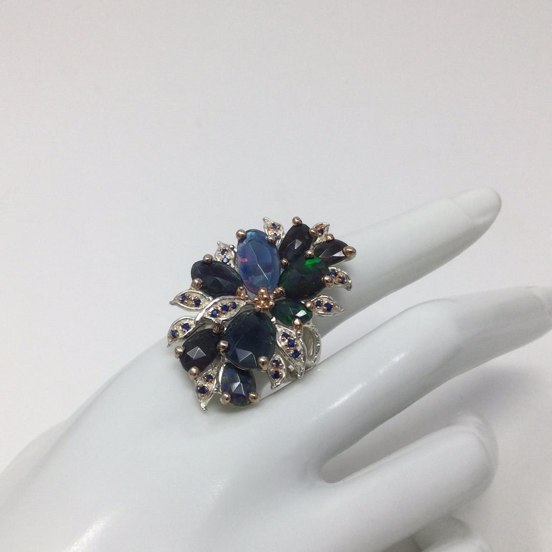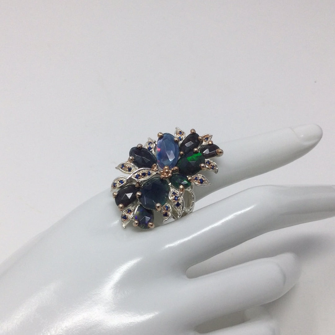 The finest celestial rare Black Opal's, unbelievably magnificent, notice how they are faceted! Accented with genuine Sapphires, this ring will be a heirloom treasure in your family from generation to generation. Seldom you find faceted Opals, especially the mysterious highly acclaimed black ones. It’s even more beautiful in person. Hard to part with this treasure. Set in .925 sterling silver with a 14K white gold overlay with yellow gold accents n the prongs and in centerpiece. This is a one of a kind custom made work of art on genuine gemstones. Opals vary in sizes, each stone is unique hand selected for its beauty and color dispersion. Largest stone measures approximately 10mm by 8mm. Size 9, Resize at your jeweler or use a ring guard.