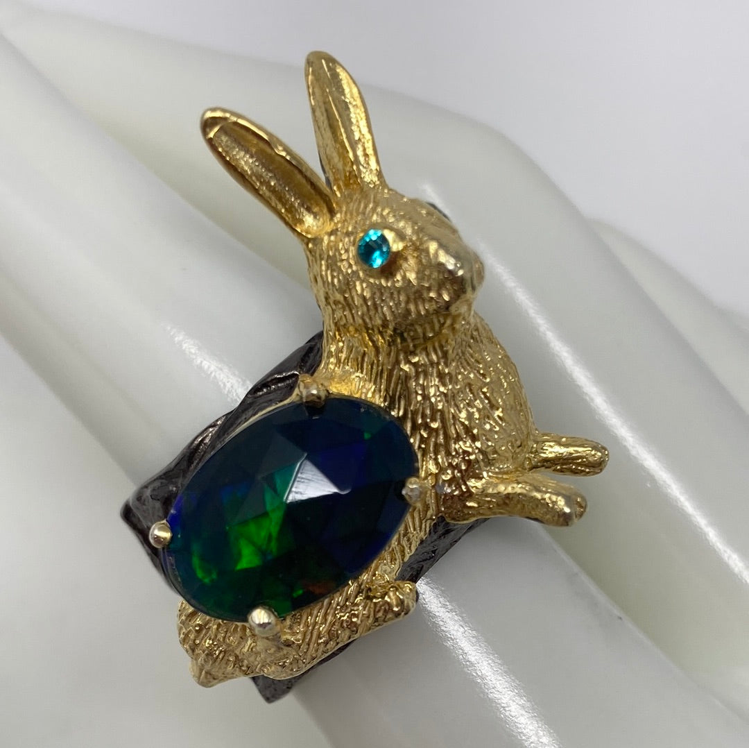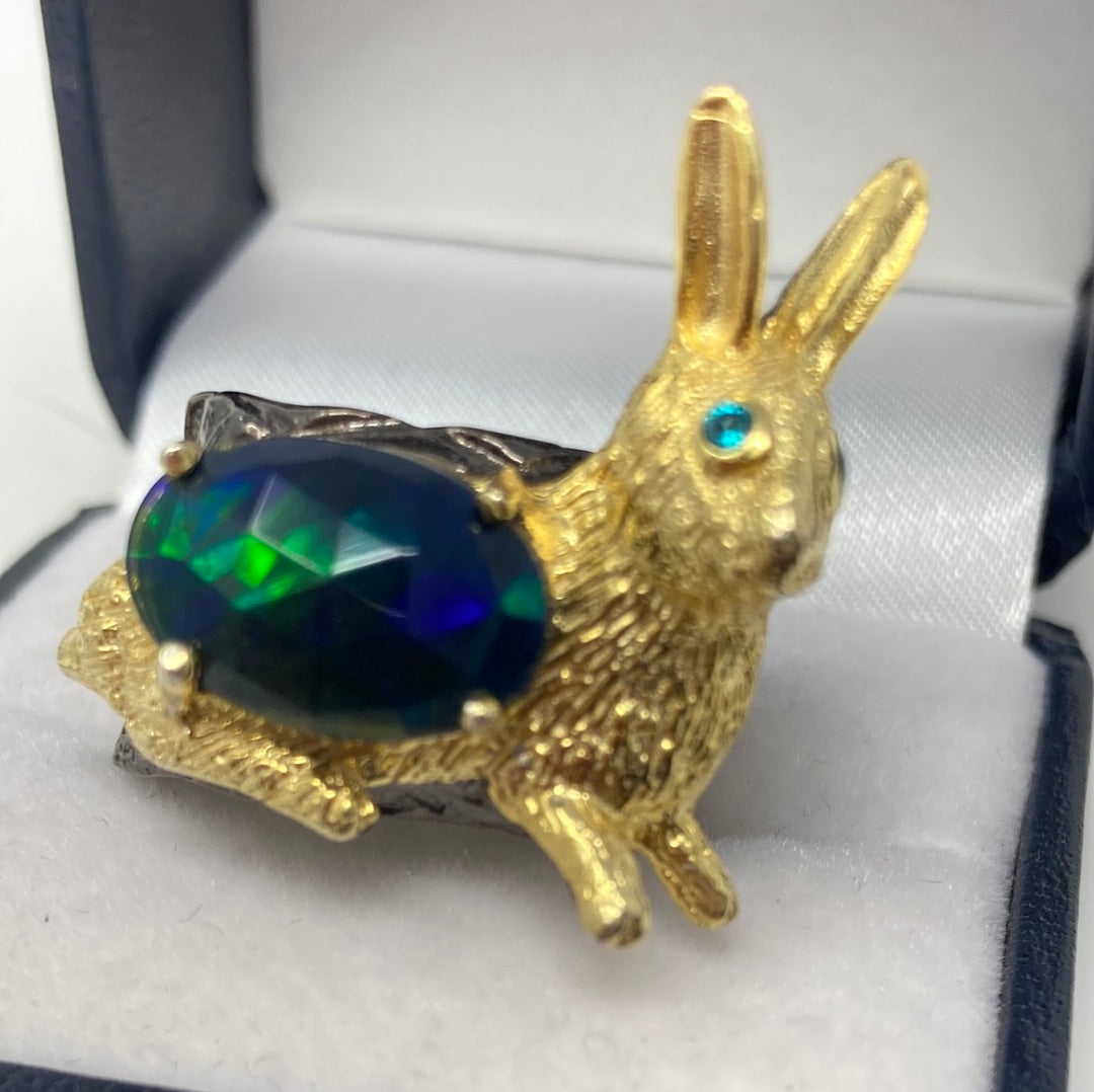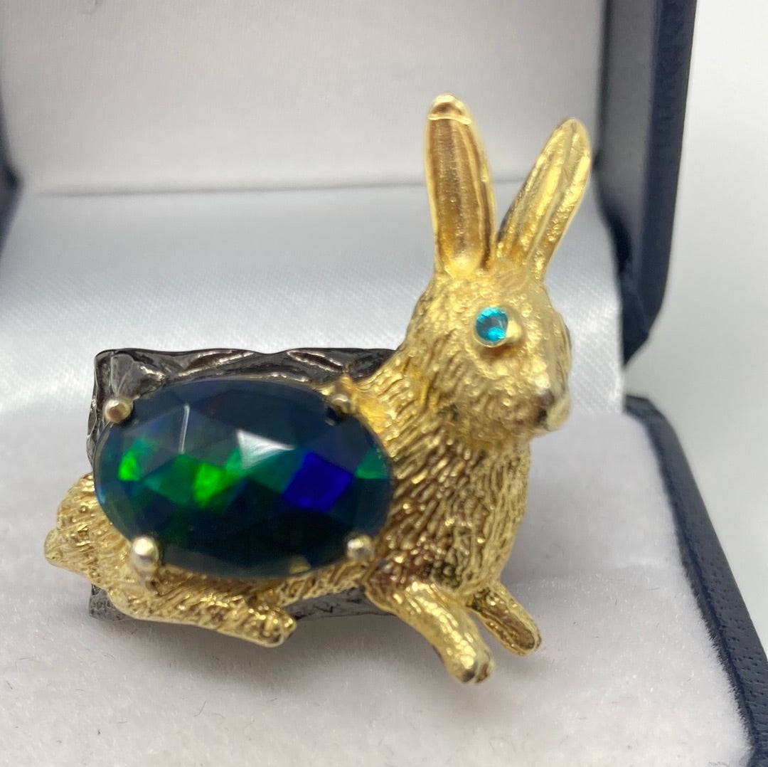 Mesmerizing, Unusual Genuine, Black Opal Bunny Ring. Seldom do I find a large Black Opal of this size , approximately 14mm by 5mm. A faceted Opal is very special and shows off the opalescence and glowing iridescence of this gemstone. Set in . 925 Sterling Silver with a Rhodium and 14K yellow gold overlay for durability and beauty. A future heirloom collection piece, invest in genuine gemstones. Size 6
