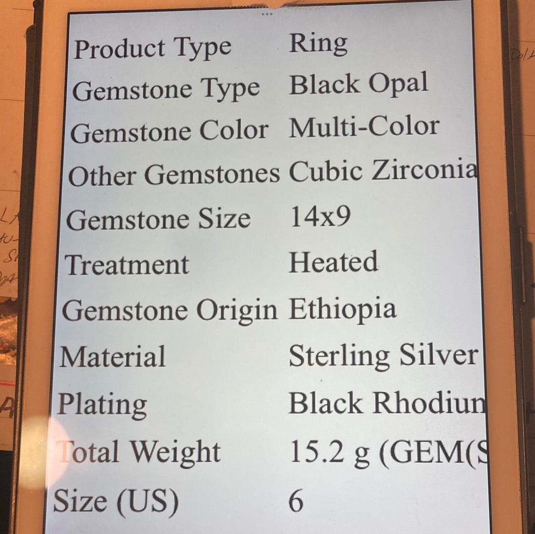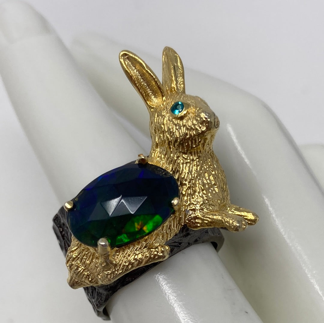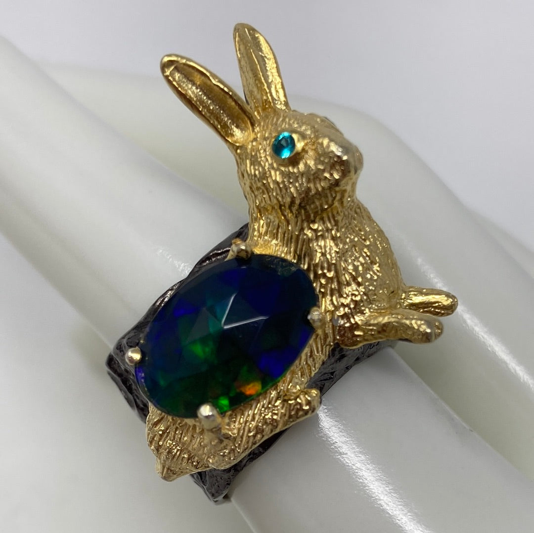 Mesmerizing, Unusual Genuine, Black Opal Bunny Ring. Seldom do I find a large Black Opal of this size , approximately 14mm by 5mm. A faceted Opal is very special and shows off the opalescence and glowing iridescence of this gemstone. Set in . 925 Sterling Silver with a Rhodium and 14K yellow gold overlay for durability and beauty. A future heirloom collection piece, invest in genuine gemstones. Size 6